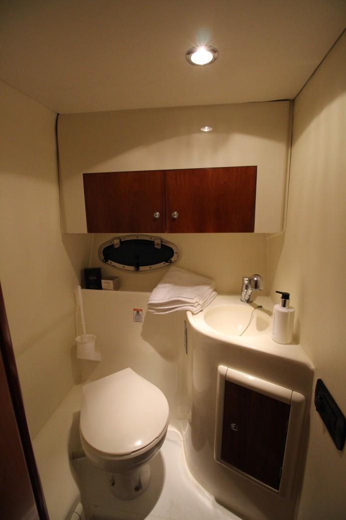 The electric marine toilet with macerator is hidden under a grp lid, furthermore you find a well sized marble top sink and plenty of storage.