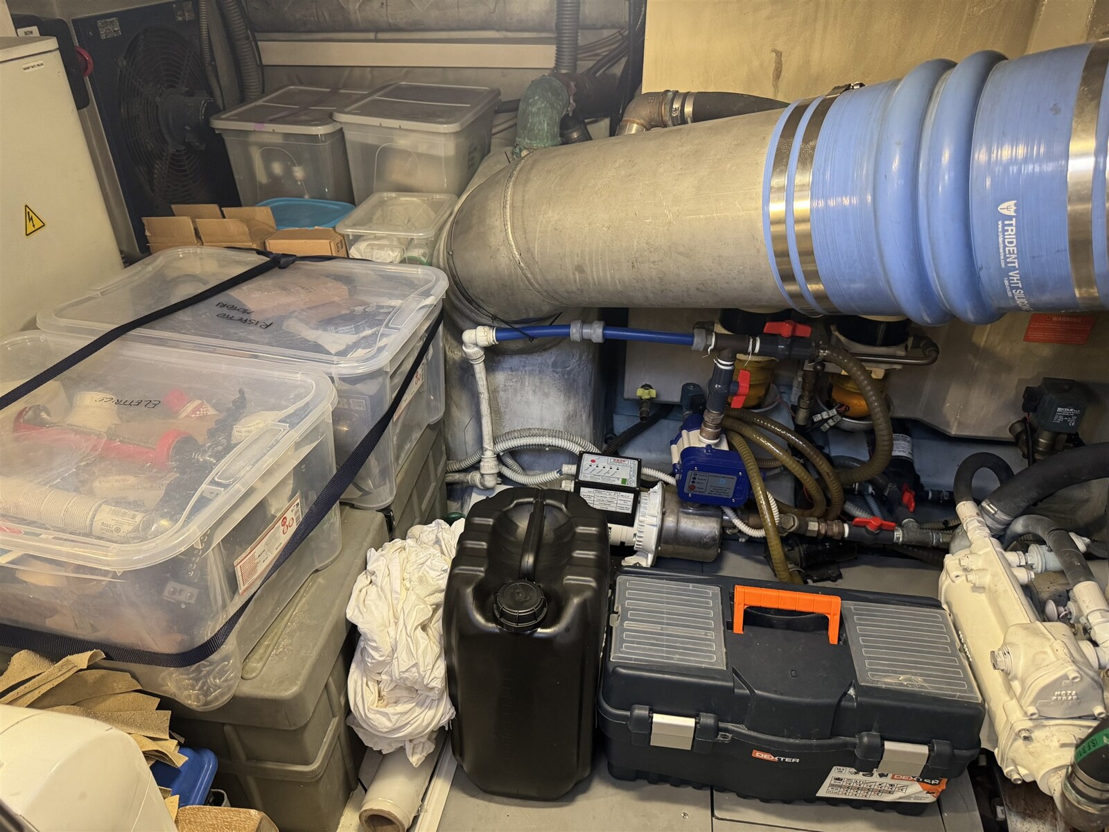 2 Engine Alarm, Bilge Alarm, Alternator, Water pressure pump, Deck Shower, Bow Thruster (elettrica), Headlights fixed on the stem, Hydraulic Flaps, Fire Extinguishing System, Washbasin in the cockpit, Courtesy Lights, Gangway (elettroidraulica Opacmare), Platform, Automatic Bilge Pump, Manual Bilge Pump, Entry door, Teak Cockpit, Shorepower connector, Voltage Rectifier, Rollbar, Electric Windlass, swimming ladder, cockpit table, Tender (con fuoribordo 20 hp), Horn.
