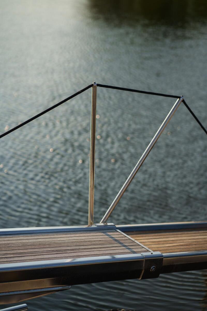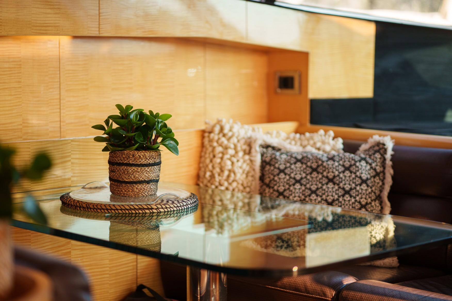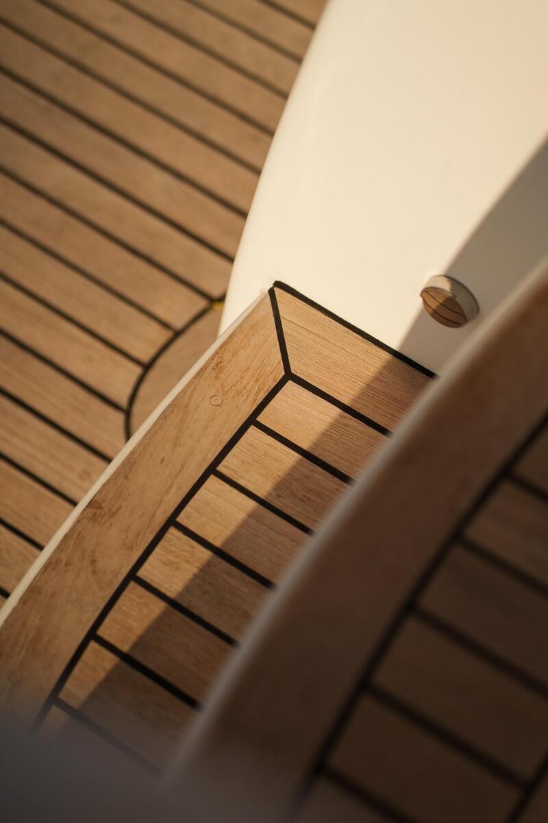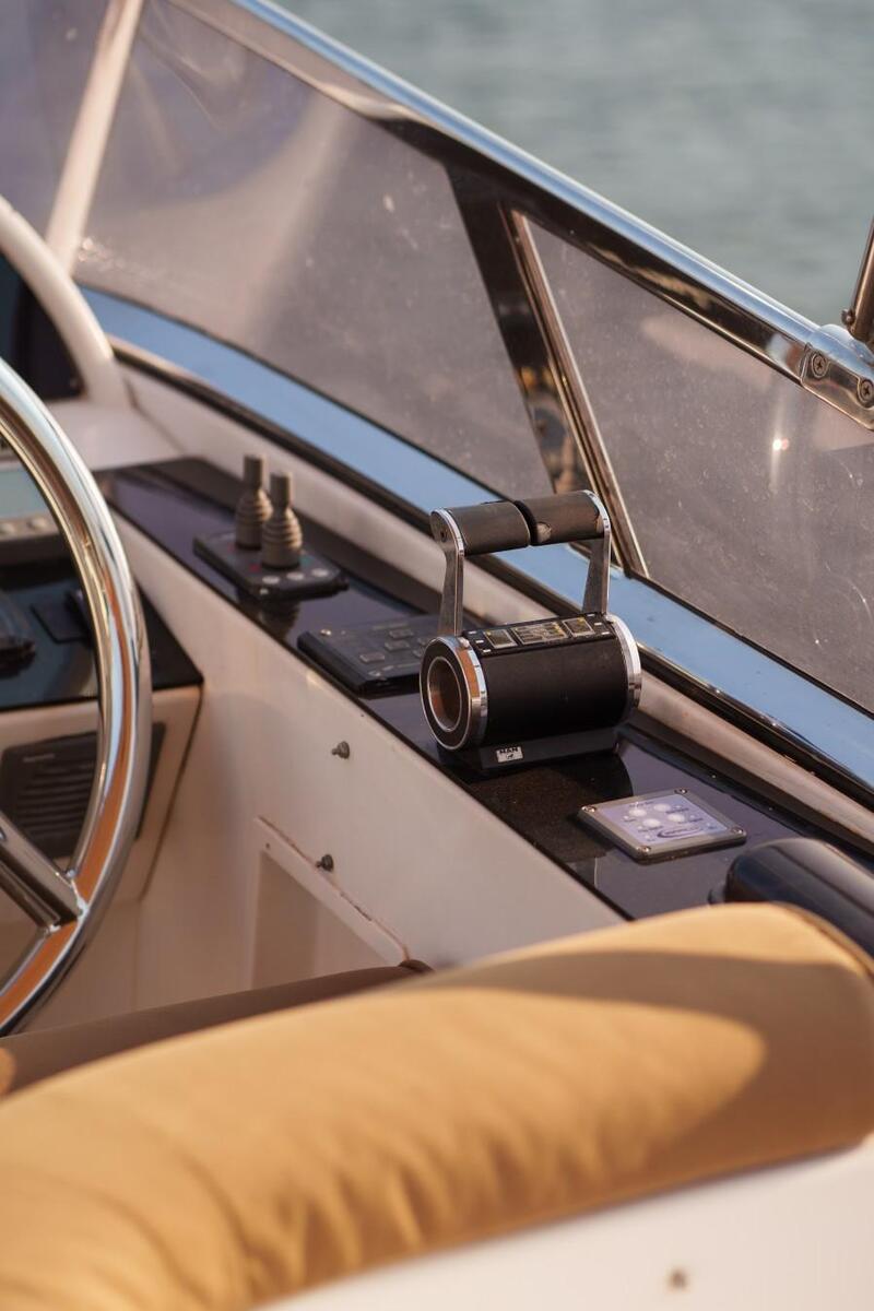 A cocktail bar area has been carved out at the back of the fly, equipped with a refrigerator and grill, to enjoy a totally relaxing and refreshing drink. The yacht also provides an enormous swim platform and a very powerful swivel crane that is used for boarding and lunching a large tender. The cockpit was designed to house a large rectangular table, providing room for 6-8 guests. From the cockpit we enter the large salon, which offers a pleasant area for conversation with a comfortable sofa. The spacious galley is located only two steps down from the salon floor near the main entrance.