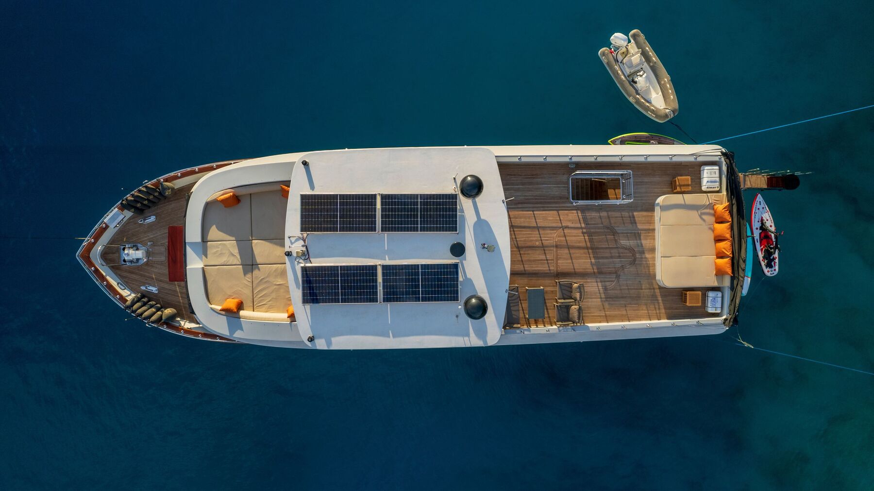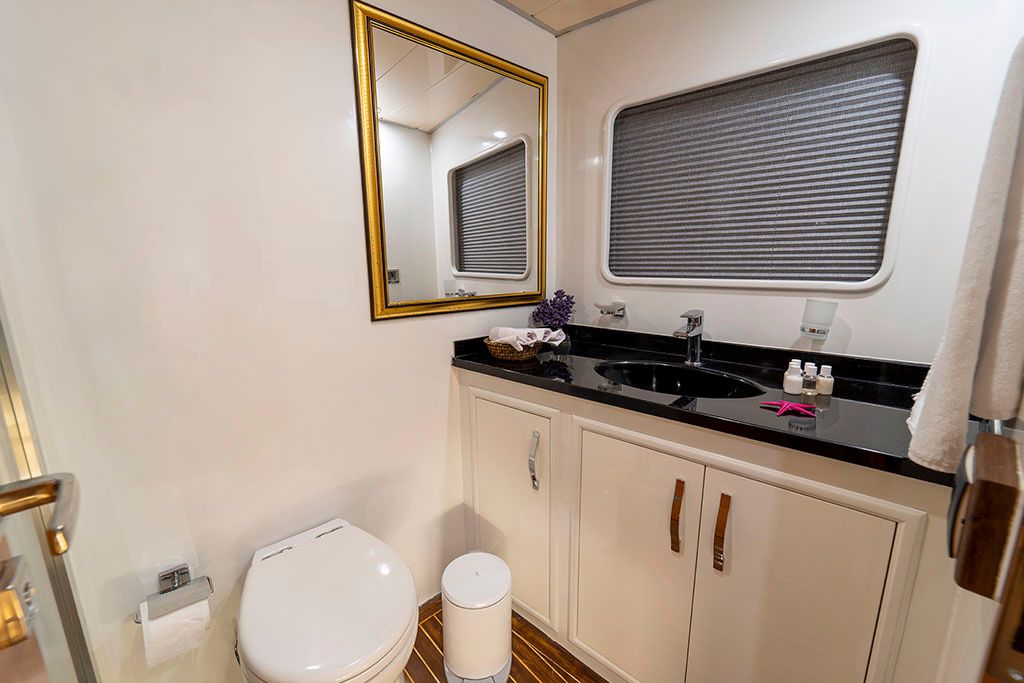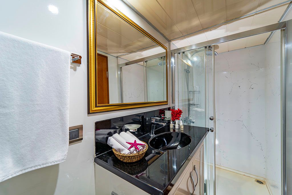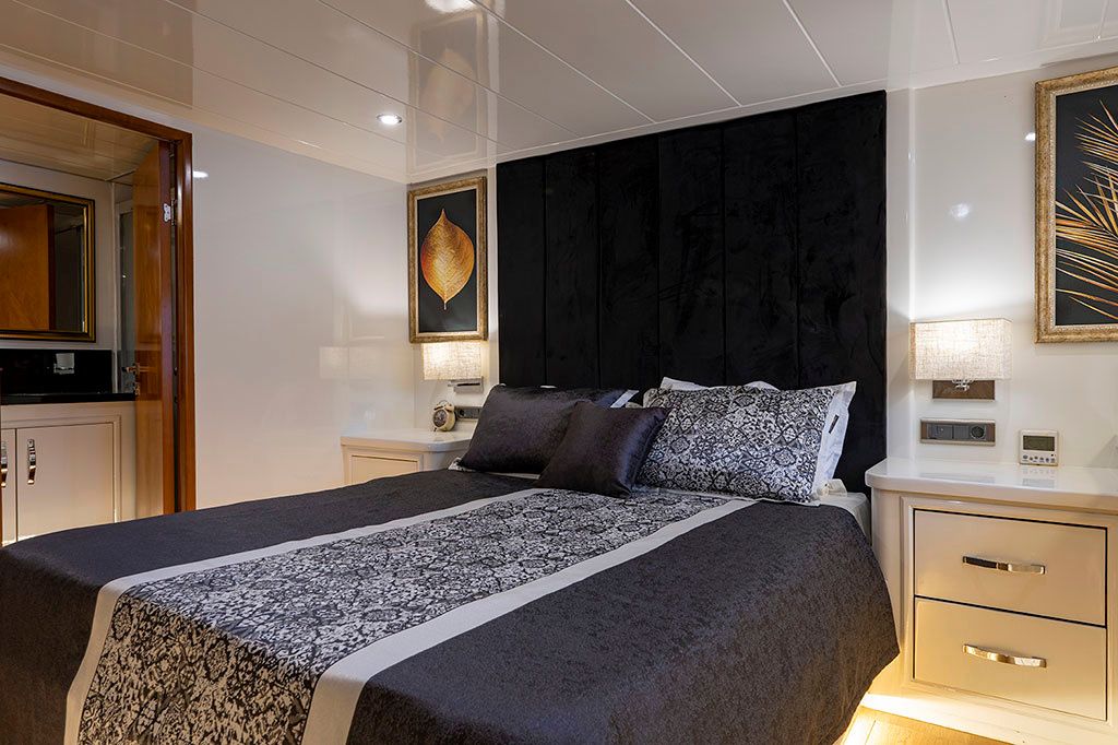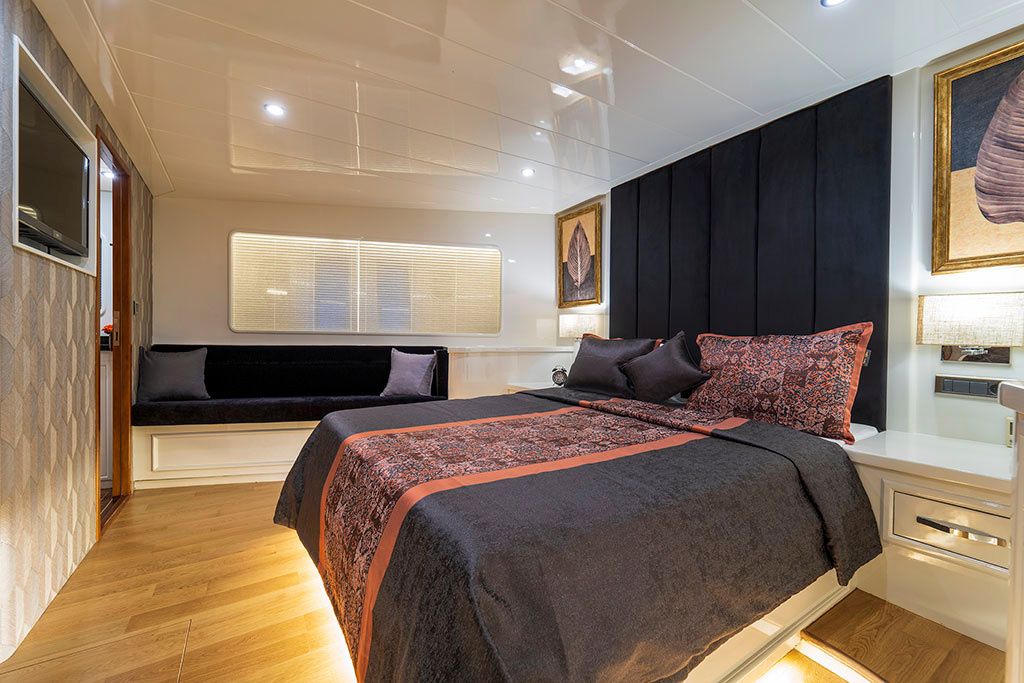 5 cabines invités accueillant jusqu’à 10 passagers, dont 3 cabines armateur et 2 cabines twin, toutes avec salles de bains privatives. Salon intérieur lumineux avec coin détente et espace TV, salle à manger intérieure et extérieure, large flybridge avec bain de soleil et espace repas, pont arrière convivial avec accès facile à la mer.