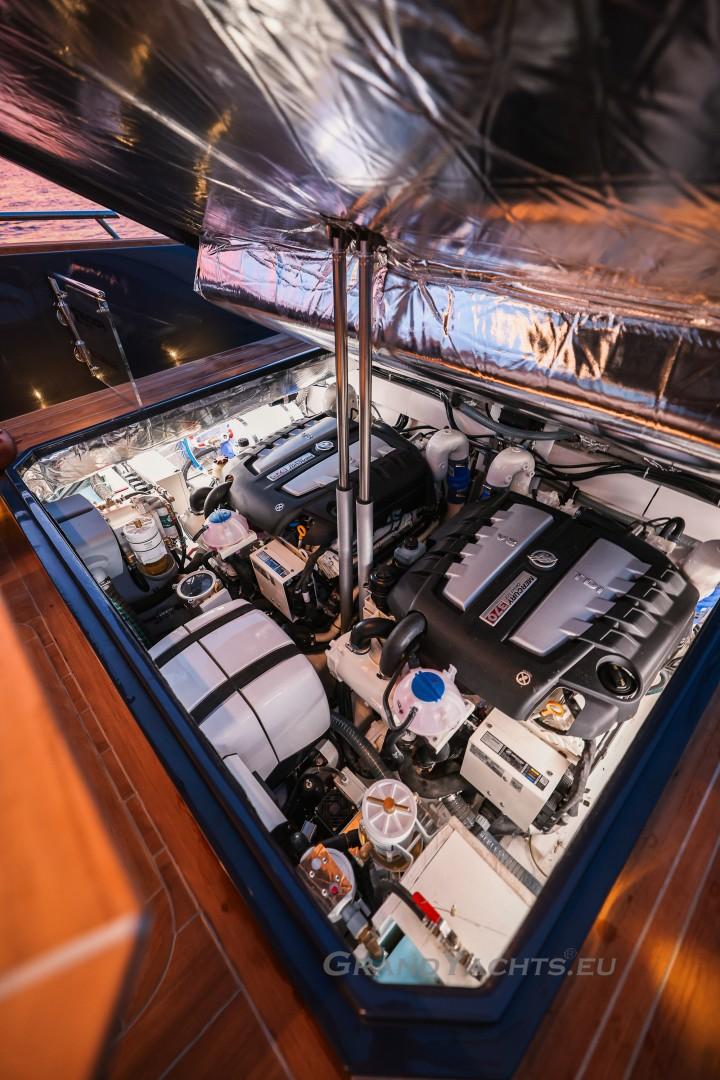 Engines The beating heart, or rather hearts, of this vessel are the twin engines rated at either 270, 320, 370 or 600 horsepower a piece, with all options having the boat feel powerful, each latter one obviously even more so than the former. The engine bay also houses a powerful 4 kW generator and an optional gyro stabilizer. The engine room is either accessed from a hatch on the starboard side of the aft sunbed, or alternatively, with the touch of button, after which the deck lifts on an electrically actuated strut exposing the whole engine compartment and providing unlimited access. Well done Focus, bravo.