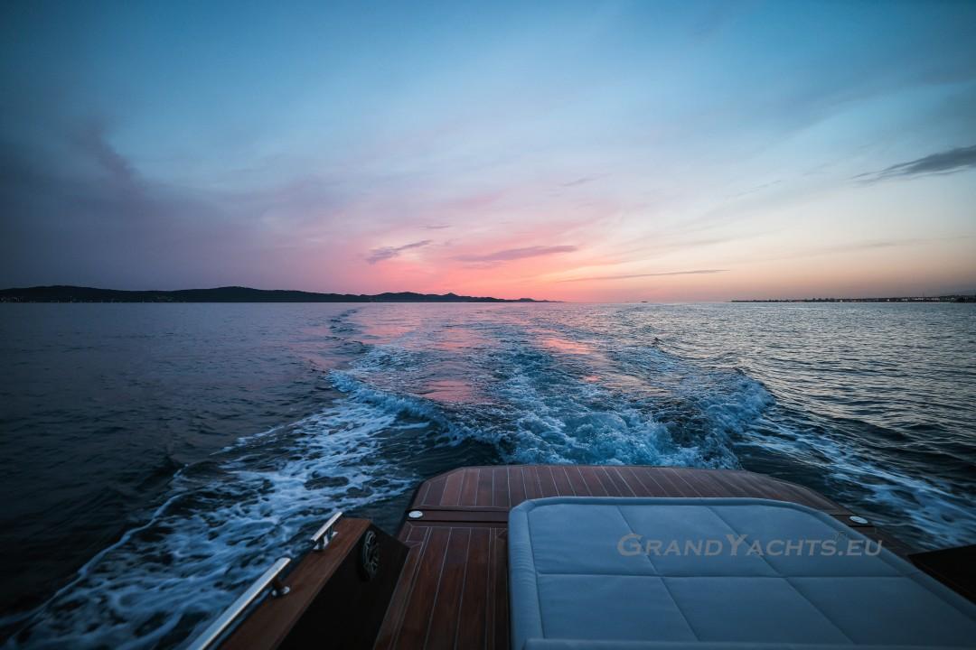 Handling She’s a fun boat to operate. She’s well-powered, overpowered even, which is beneficial for both fuel consumption and durability. Her handling is very direct, having sharp turning angles characteristic of smaller, stern-driven boats. Her sharp, modified V-hull really hooks into the water, making it possible to turn without sliding at all, as if she were attached to rails. I was able to perform a 180-degree turn at 28 knots in just six seconds and with a turn radius of about two boat lengths, which is a super tight turn by any boating standards. No other manufacturer even comes close in this respect. She feels like a fast ship. That’s probably because she is. When you get her up on plane – a solid plane, not just at minimum planing speed – start trimming the engines to push the bow back down and she'll pick up speed easily.