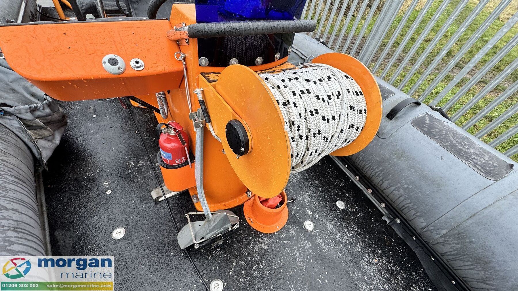 Deck: GRP orange hull with grey Hypalon tubes. Mooring cleats. Rope handles. Grab handles. A-frame. Manual windlass with anchor, chain and rope on front of console. Oars. Fishing rod holders.