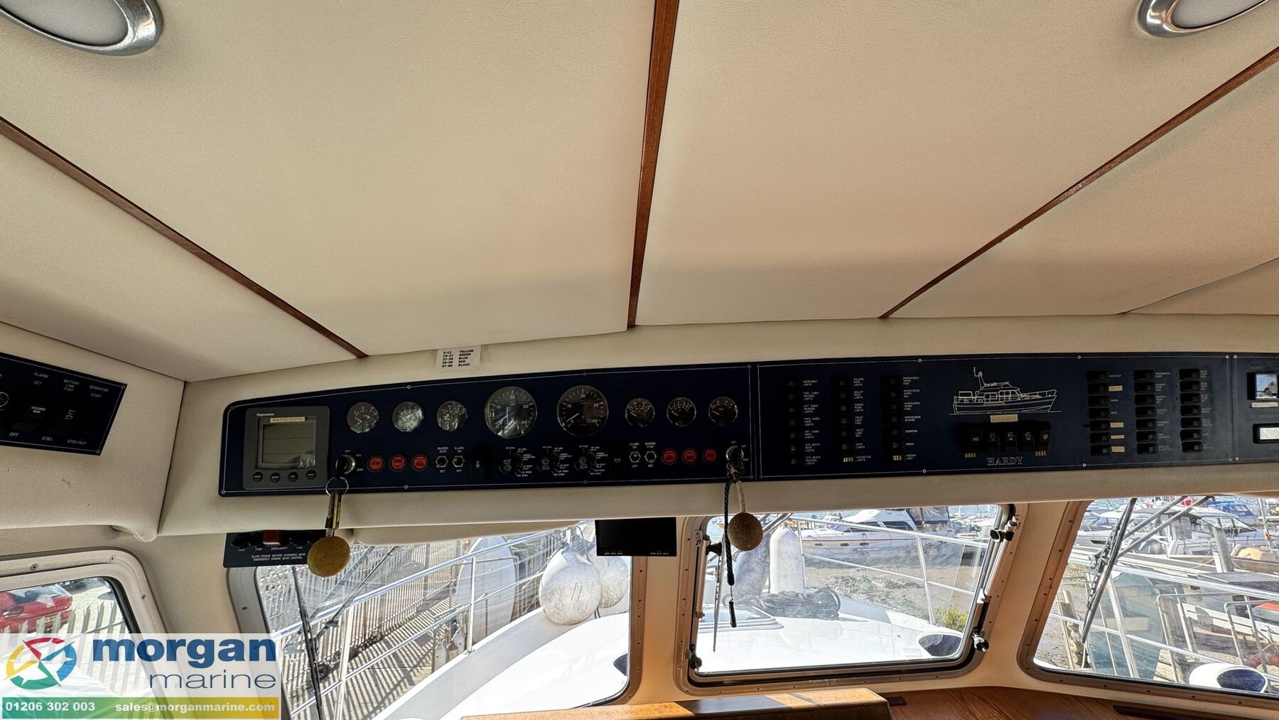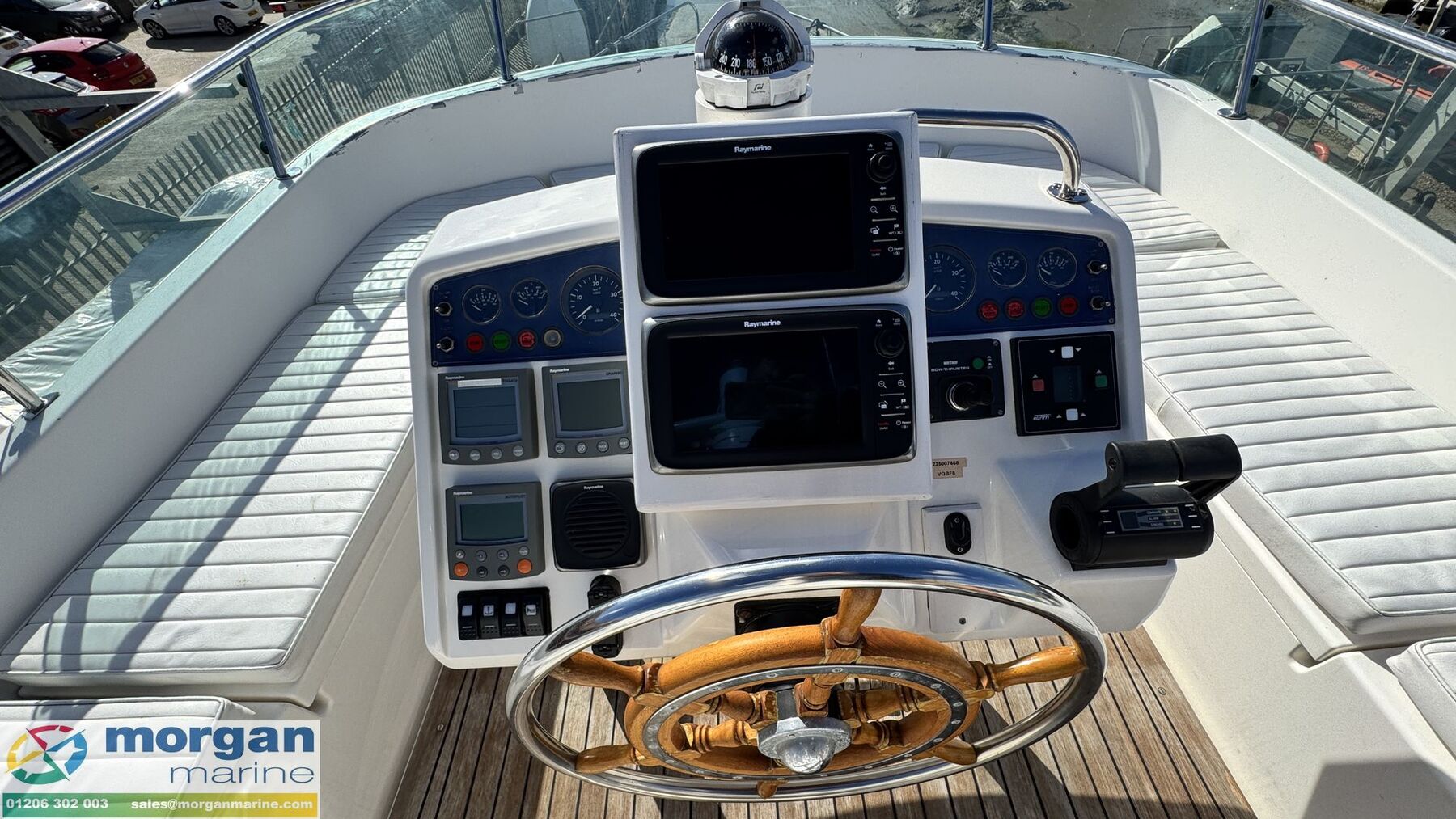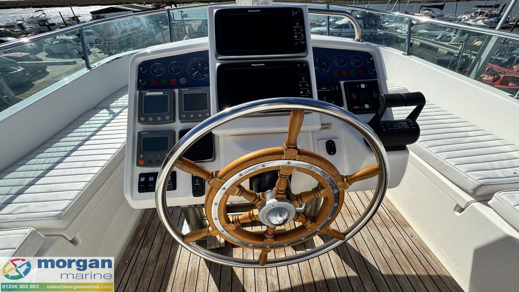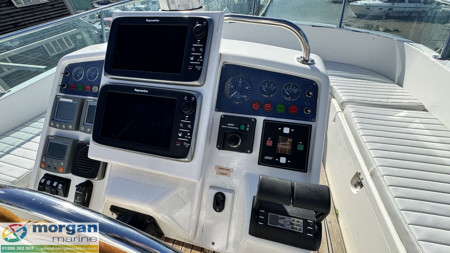 Electronics: Wheelhouse electronics include: Twin 12 inch Raymarine C series 125 chart plotters. Navtex Mcmurdo ICS Nav6. Raymarine engine digital gauge. Raymarine VHF radio. Raymarine autopilot. Raymarine water depth digital gauge. Rear digital camera. Engine gauges. 12v socket. Sony radio. Generator. Horn. Navigation lights. Anchor light. Interior lights. Compass. Vetus bow thruster controls. 240v Shore power. Flybridge electronics include: Twin 9 inch Raymarine C series 95 chart plotters. Vetus bow thruster controls. Raymarine VHF radio. Raymarine autopilot, Tridata and Graphic digital display. USB port. Horn button. Electric windlass control button. Compass. Engine gauges. Throttle controls.