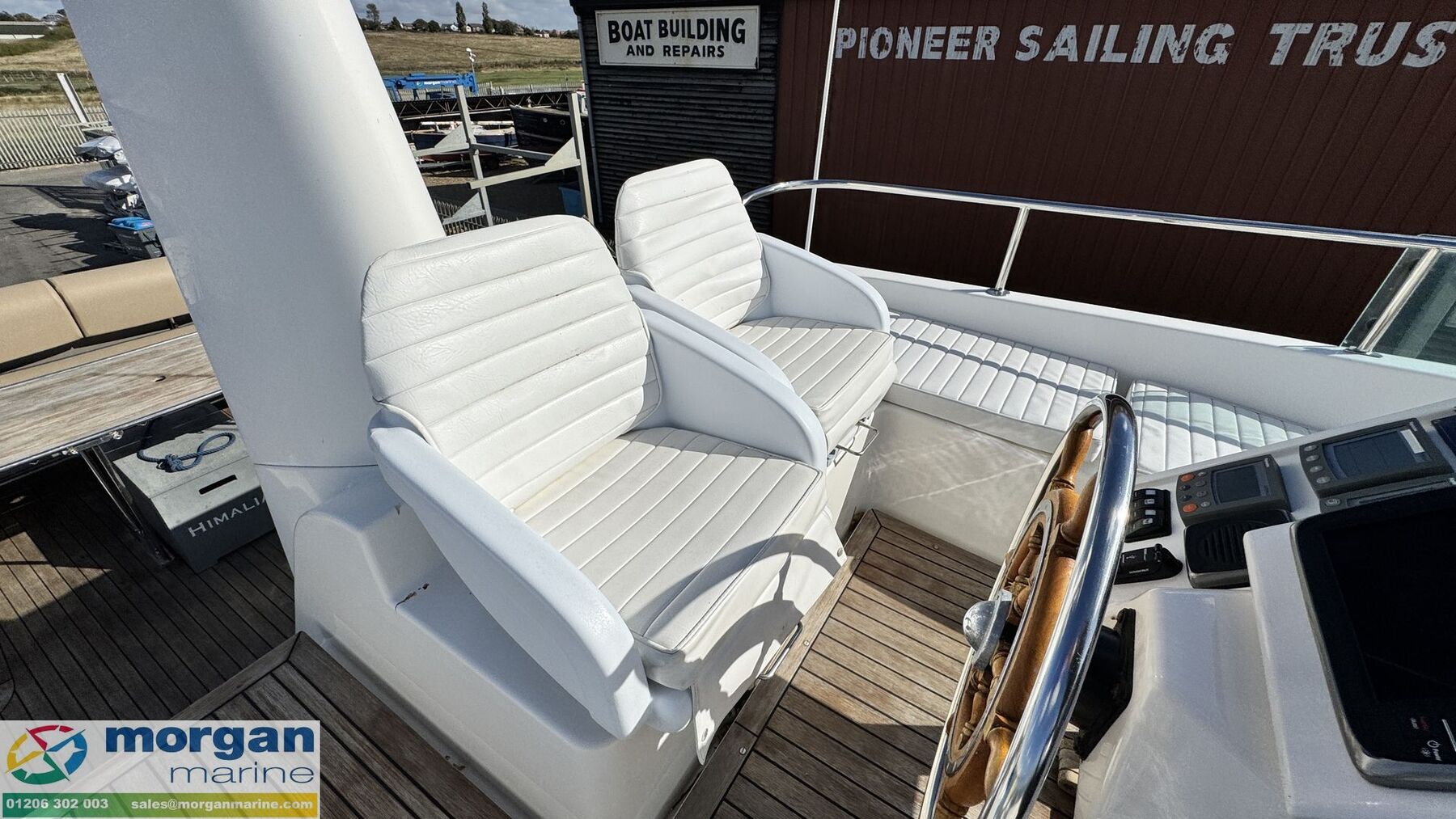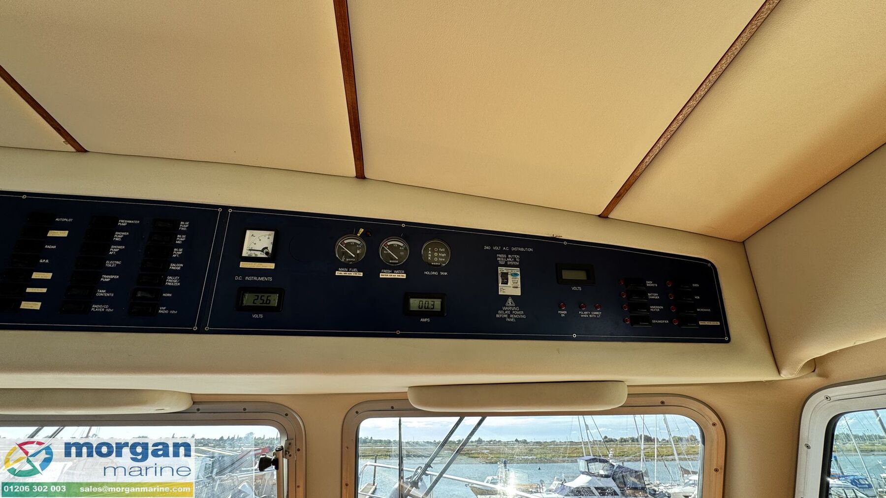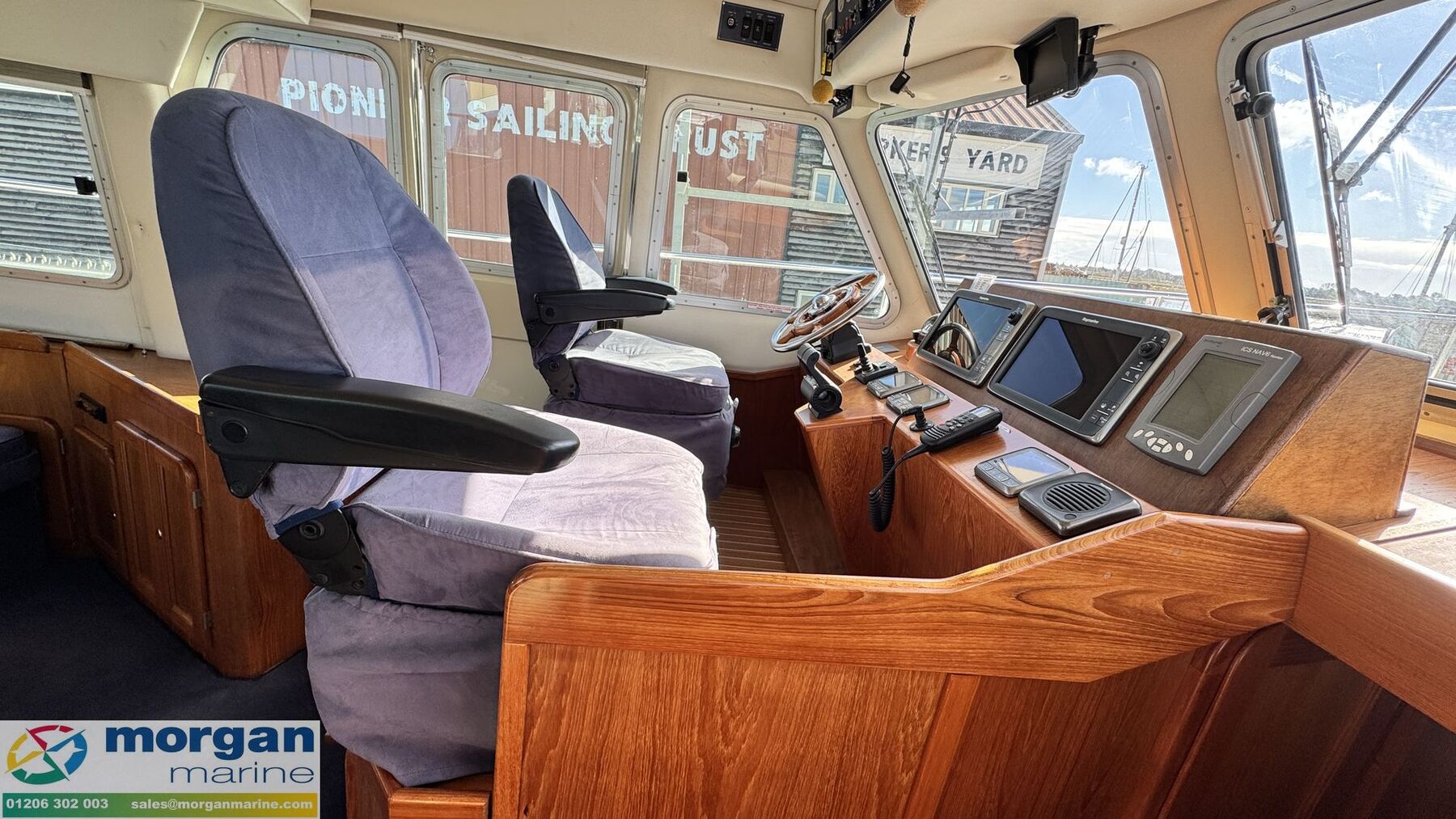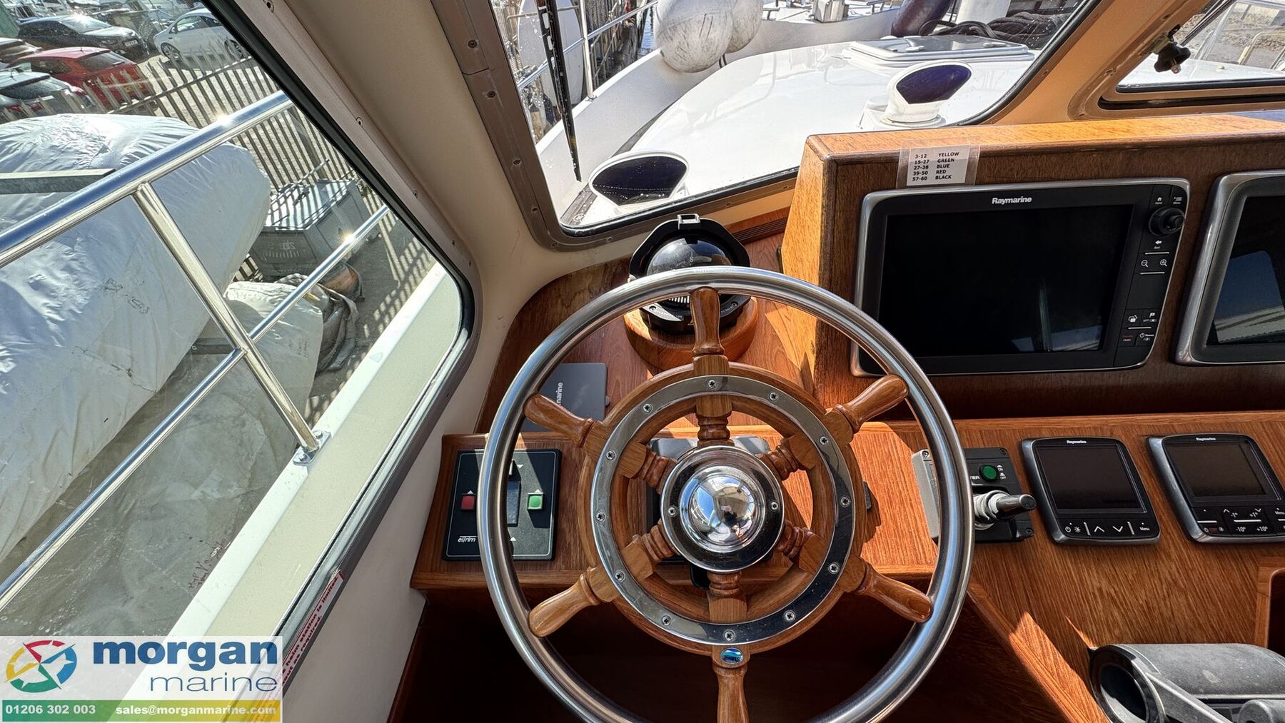 Electronics: Wheelhouse electronics include: Twin 12 inch Raymarine C series 125 chart plotters. Navtex Mcmurdo ICS Nav6. Raymarine engine digital gauge. Raymarine VHF radio. Raymarine autopilot. Raymarine water depth digital gauge. Rear digital camera. Engine gauges. 12v socket. Sony radio. Generator. Horn. Navigation lights. Anchor light. Interior lights. Compass. Vetus bow thruster controls. 240v Shore power. Flybridge electronics include: Twin 9 inch Raymarine C series 95 chart plotters. Vetus bow thruster controls. Raymarine VHF radio. Raymarine autopilot, Tridata and Graphic digital display. USB port. Horn button. Electric windlass control button. Compass. Engine gauges. Throttle controls.