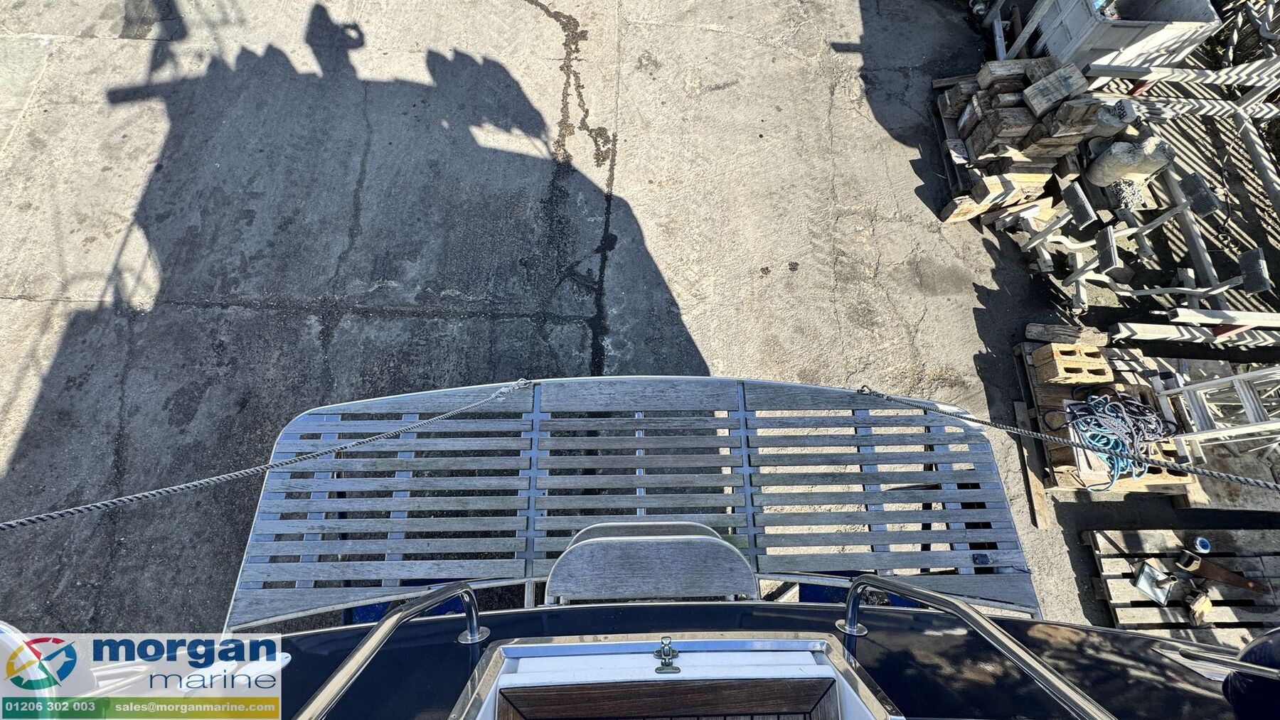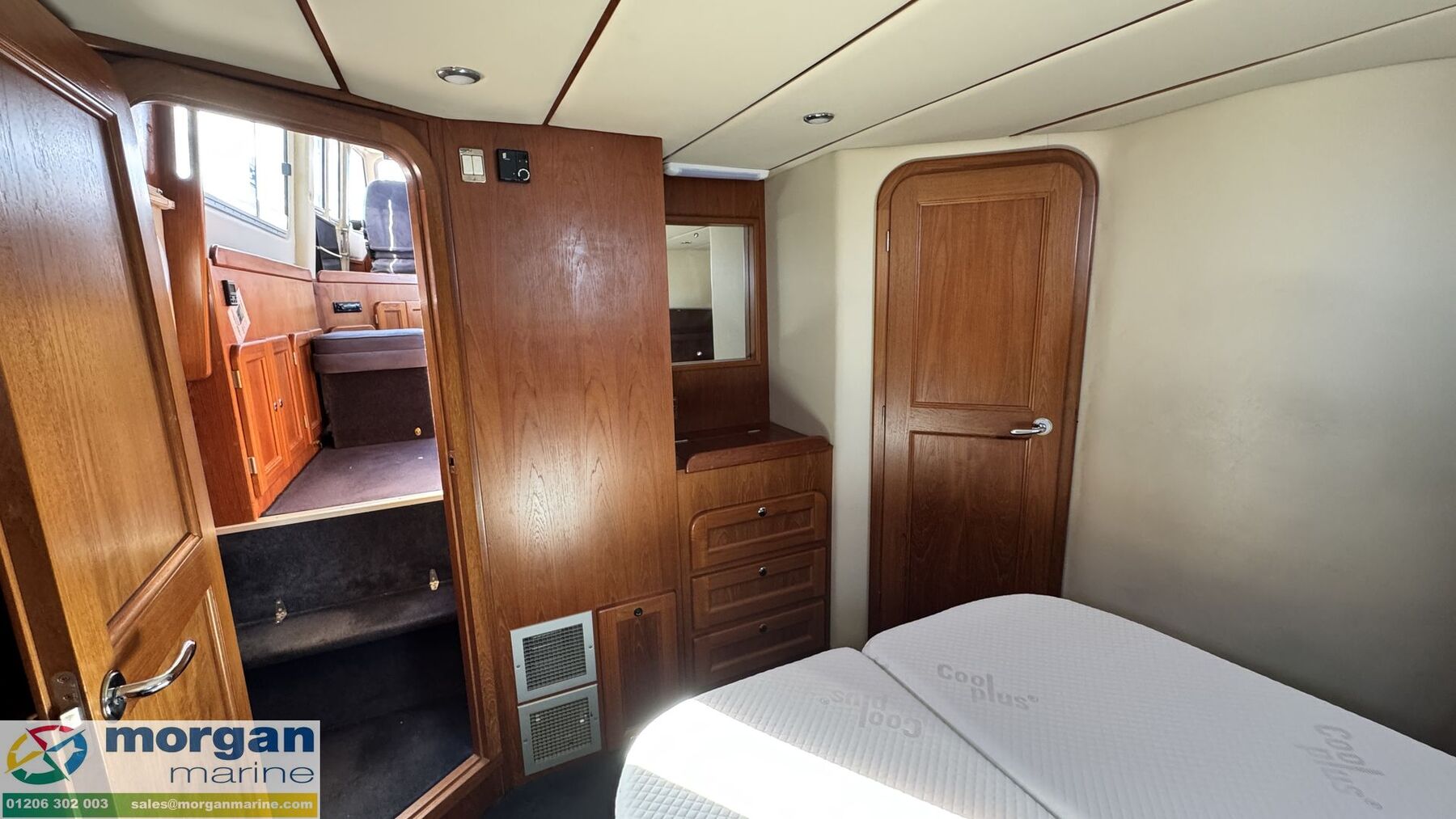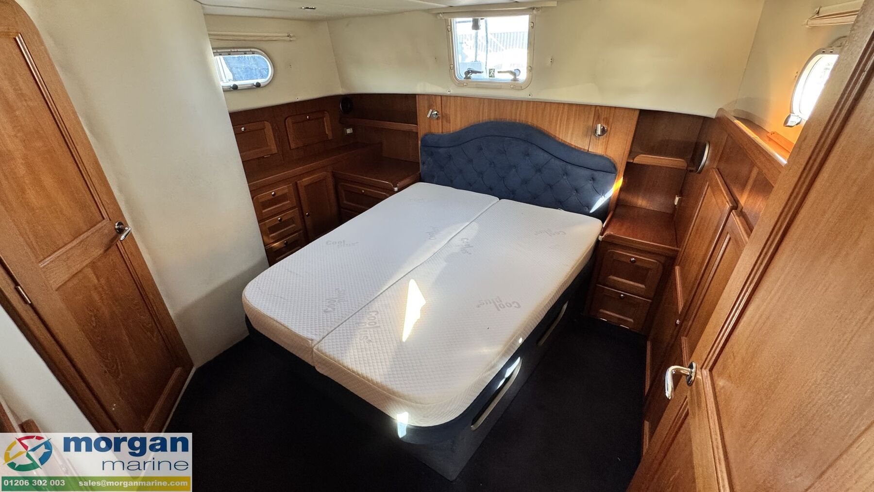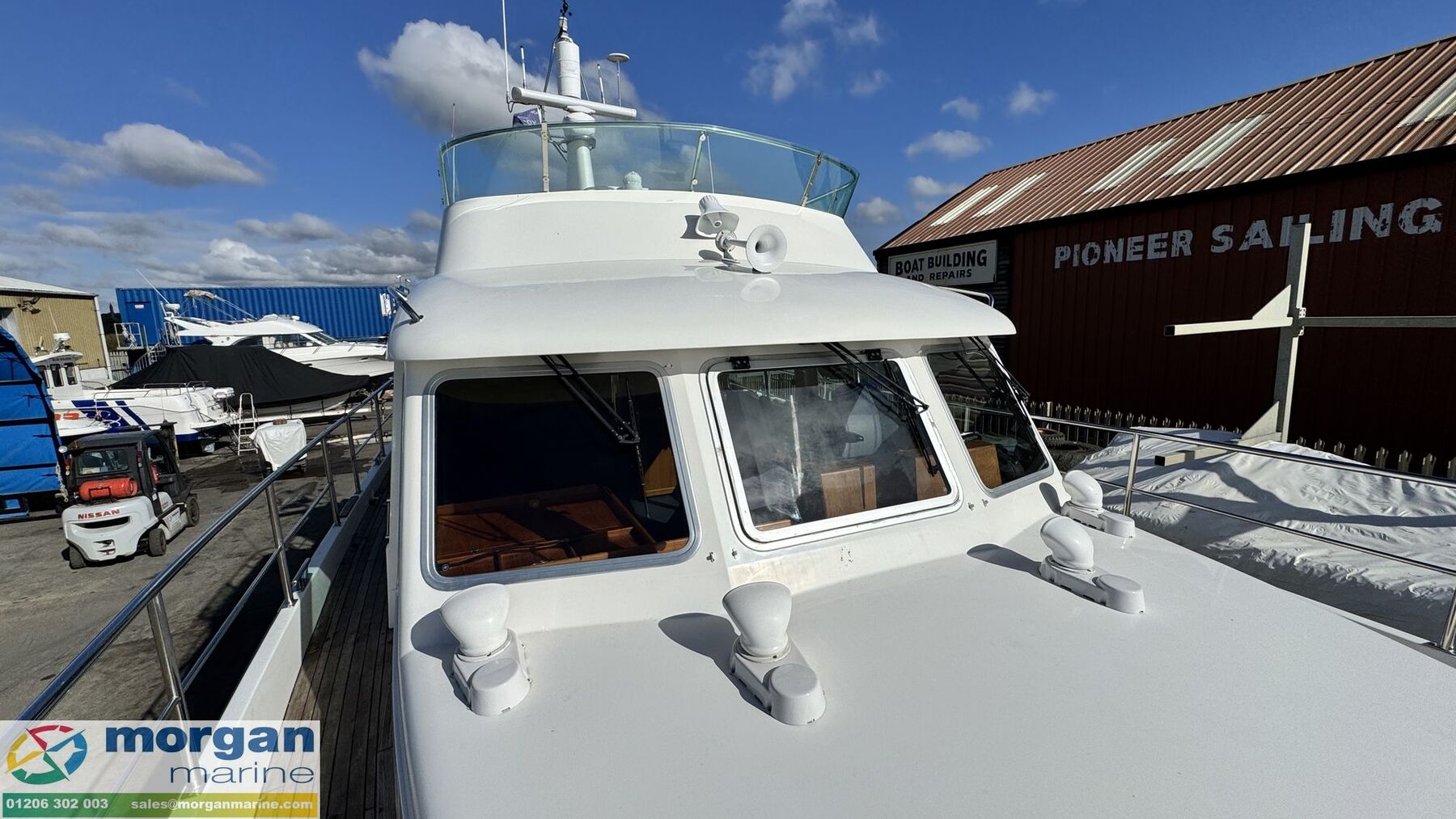 Electronics: Wheelhouse electronics include: Twin 12 inch Raymarine C series 125 chart plotters. Navtex Mcmurdo ICS Nav6. Raymarine engine digital gauge. Raymarine VHF radio. Raymarine autopilot. Raymarine water depth digital gauge. Rear digital camera. Engine gauges. 12v socket. Sony radio. Generator. Horn. Navigation lights. Anchor light. Interior lights. Compass. Vetus bow thruster controls. 240v Shore power. Flybridge electronics include: Twin 9 inch Raymarine C series 95 chart plotters. Vetus bow thruster controls. Raymarine VHF radio. Raymarine autopilot, Tridata and Graphic digital display. USB port. Horn button. Electric windlass control button. Compass. Engine gauges. Throttle controls.