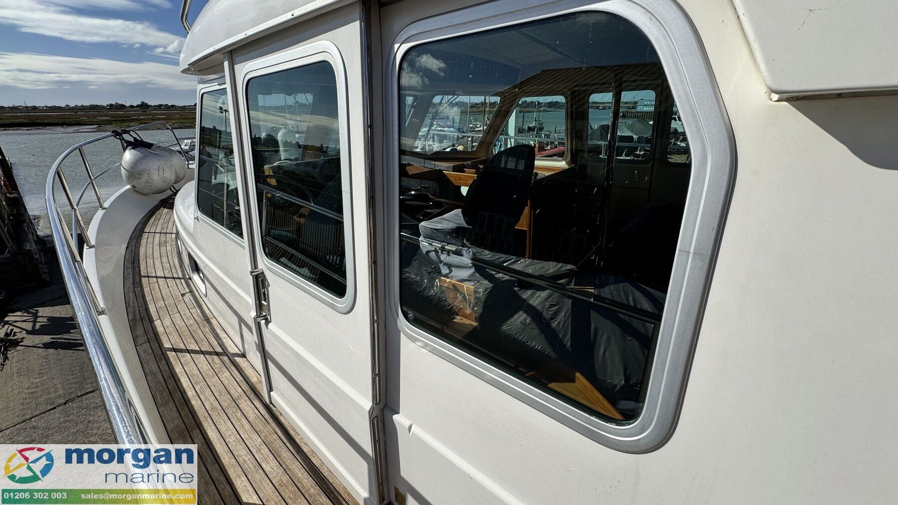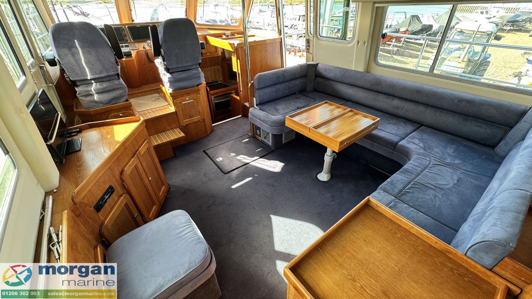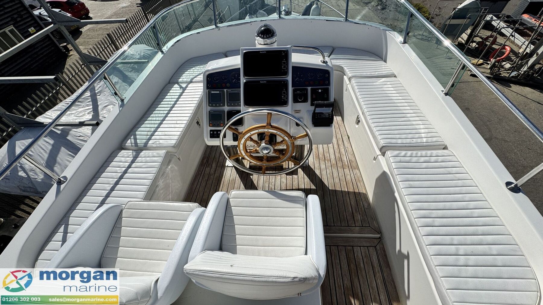 Cockpit: Walkaround teak laid side decks, aft coach roof and flybridge. Wheelhouse and flybridge steering and engine controls. Adjustable, sprung pilot and co pilot seat in wheelhouse. Pull up seat from saloon becoming a forward facing co pilot bench seat. Electric windscreen wipers with screen wash and electric demisters on front windscreen. Flybridge U-shaped cushioned seating with backrest. Pilot and co-pilot seating with engine dash display, steering wheel and engine controls. Flybridge stainless steel hand rails. 2nd aft cockpit seating with teak flooring, U-shaped bench style seating with storage and table.