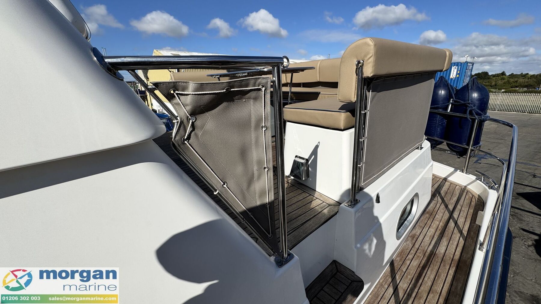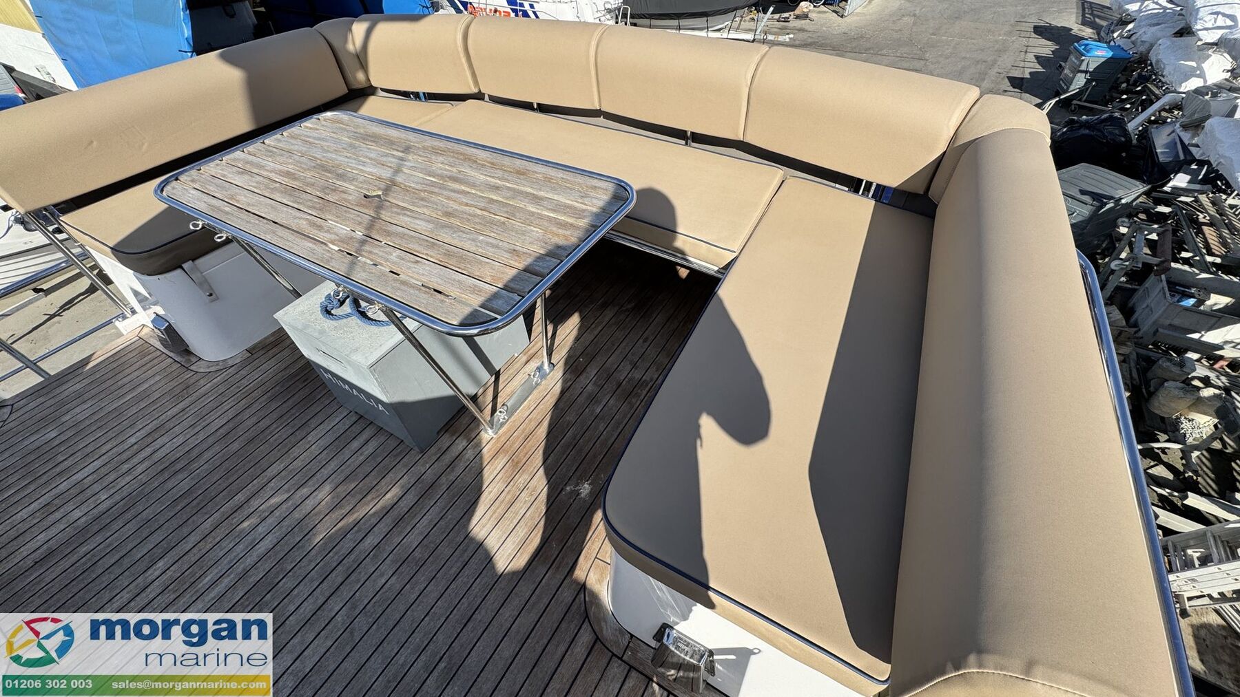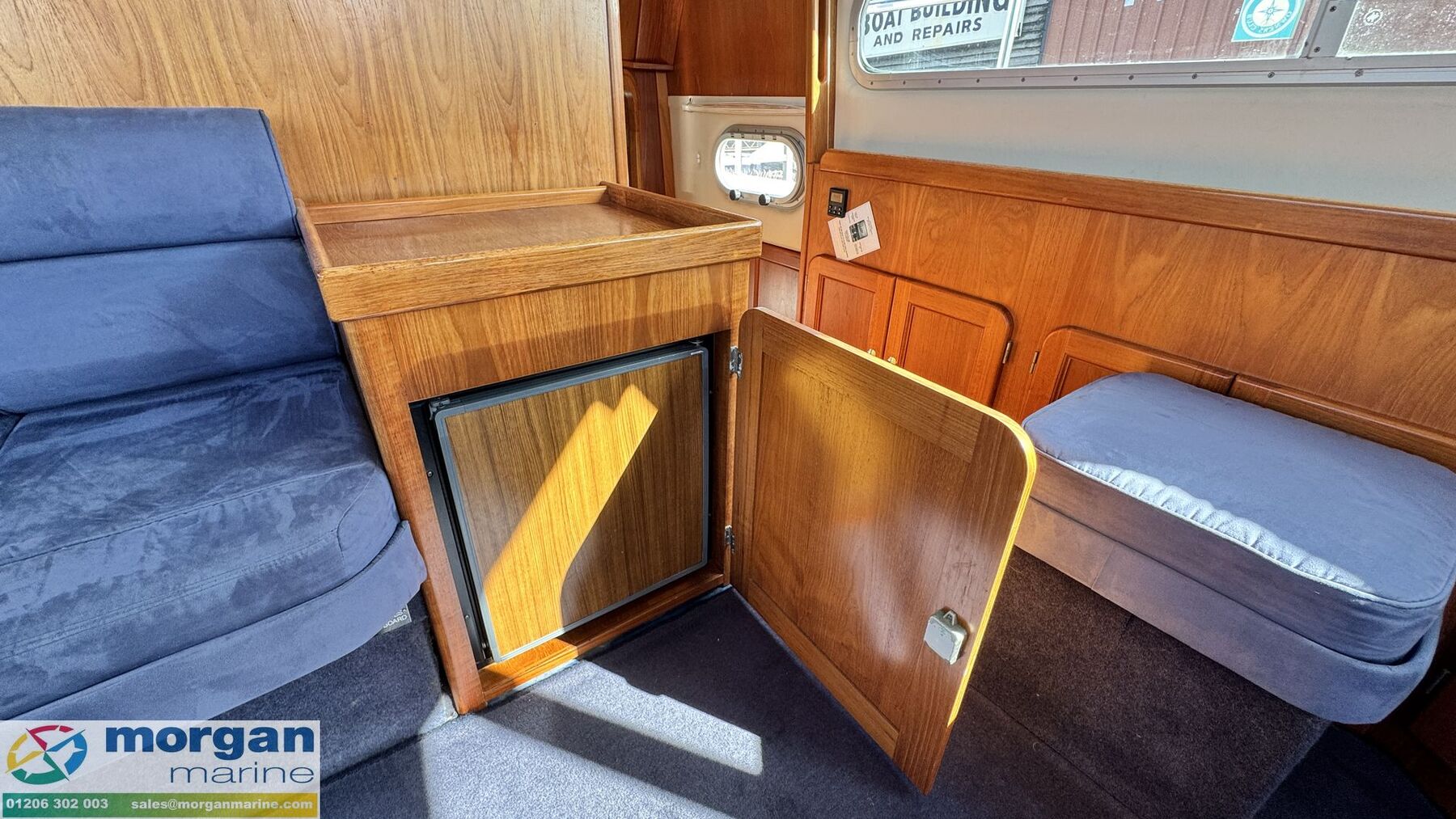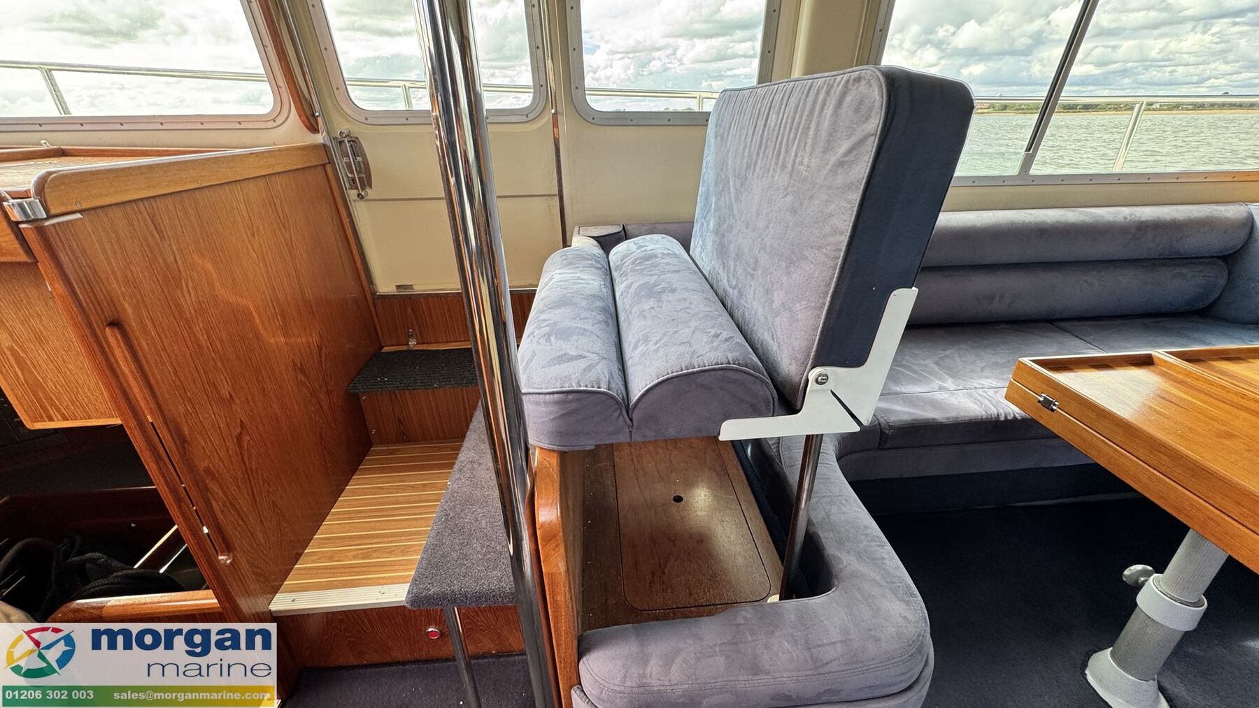 Cockpit: Walkaround teak laid side decks, aft coach roof and flybridge. Wheelhouse and flybridge steering and engine controls. Adjustable, sprung pilot and co pilot seat in wheelhouse. Pull up seat from saloon becoming a forward facing co pilot bench seat. Electric windscreen wipers with screen wash and electric demisters on front windscreen. Flybridge U-shaped cushioned seating with backrest. Pilot and co-pilot seating with engine dash display, steering wheel and engine controls. Flybridge stainless steel hand rails. 2nd aft cockpit seating with teak flooring, U-shaped bench style seating with storage and table.