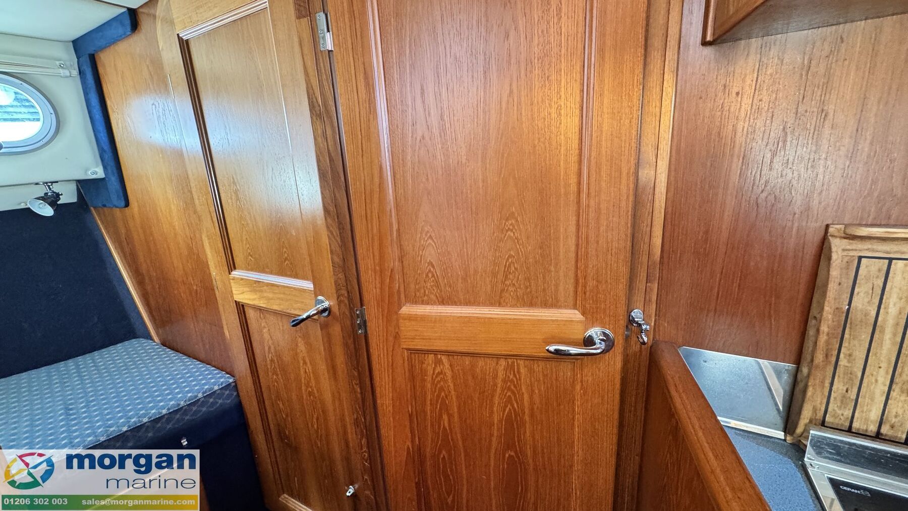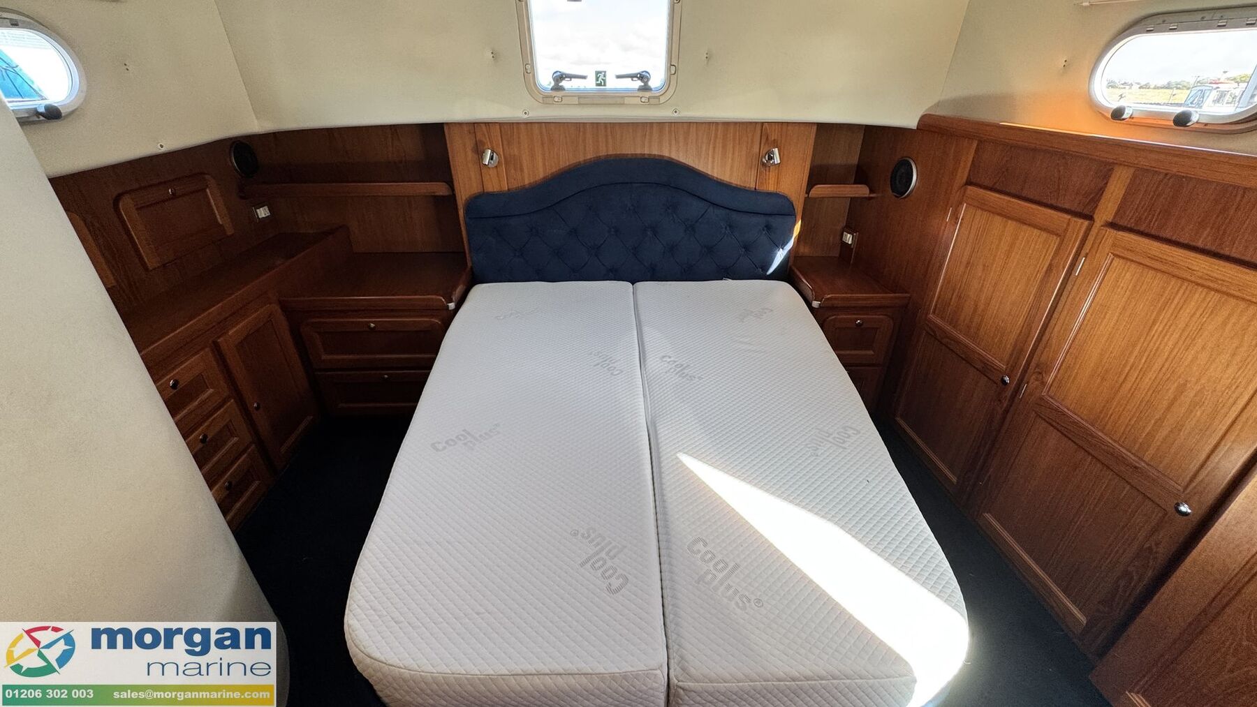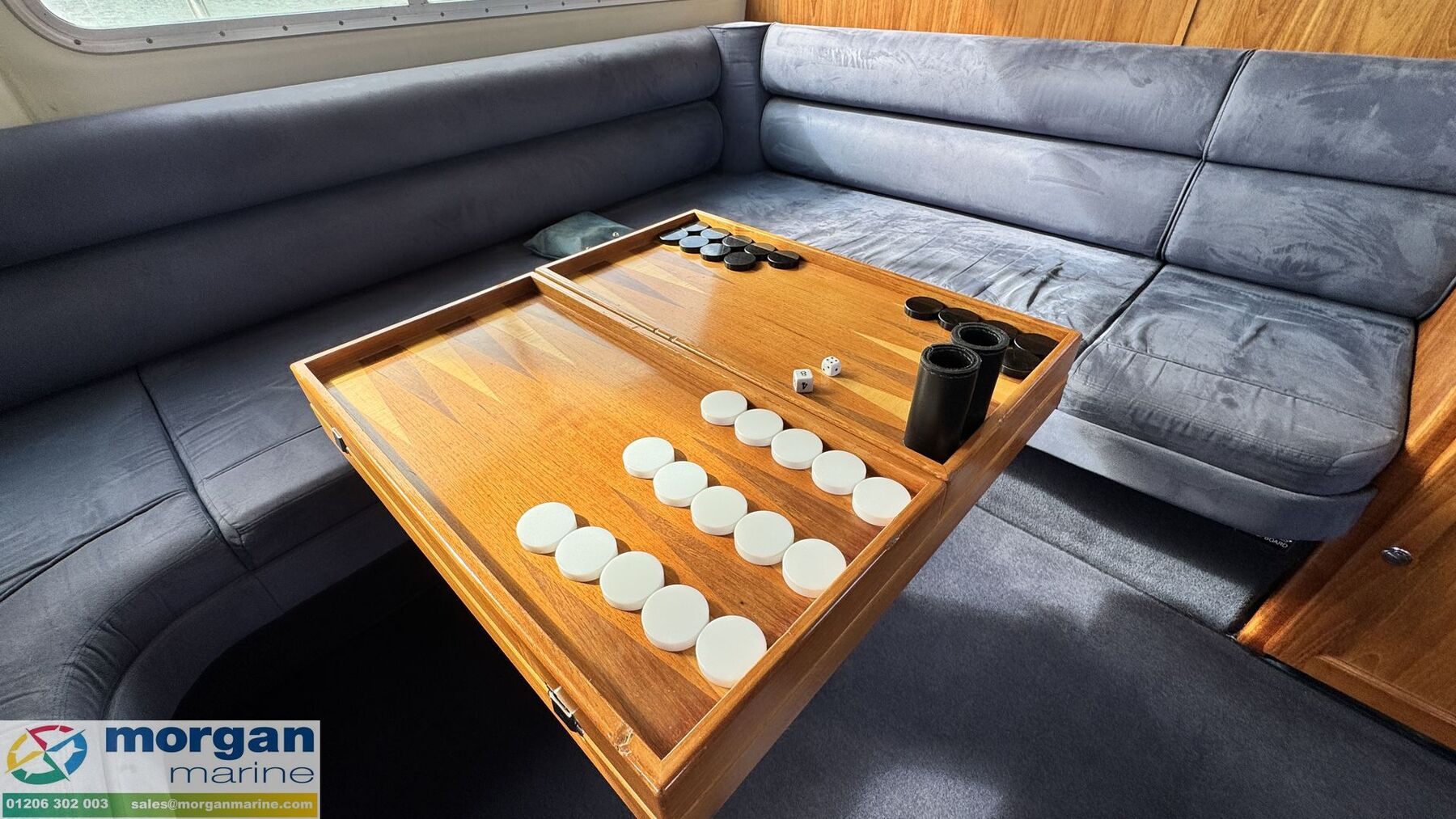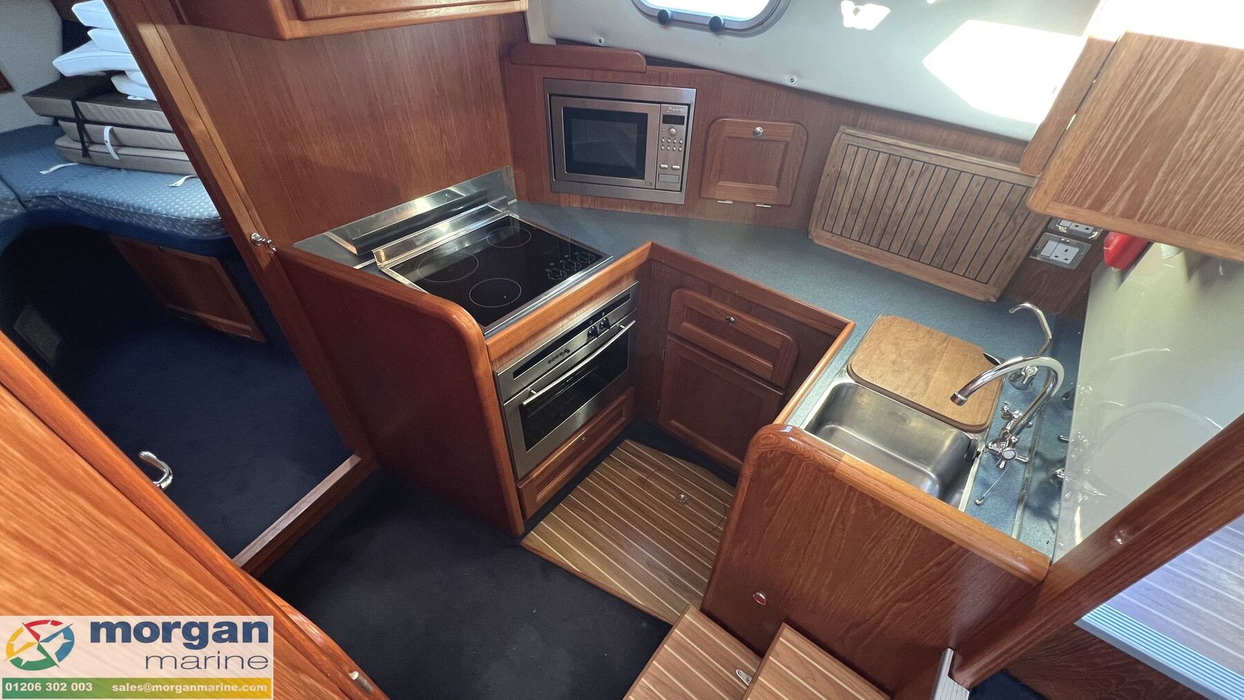 Cabin: Main master aft cabin with double berth, lots of storage and access to Ensuite toilet compartment with toilet, sink, shower, mirror and storage. Forward V-shaped double berth with infill cushion, storage, and roof hatch. Jack and Jill door to toilet compartment with toilet, sink, shower, mirror and storage. 3rd cabin with single berth, and storage. Large saloon U-shaped seating with table which owner has made custom made Backgammon game board on, TV and lots of storage. Extra fridge in saloon area. Galley with oven, hob, twin sink with hot and cold mixer tap, fridge, microwave and lots of storage. Overhead galley locker storage. Good amount of light from large windows.