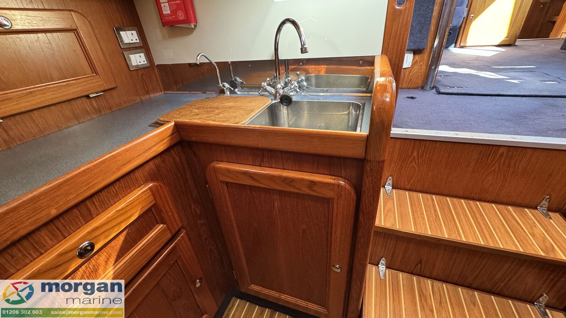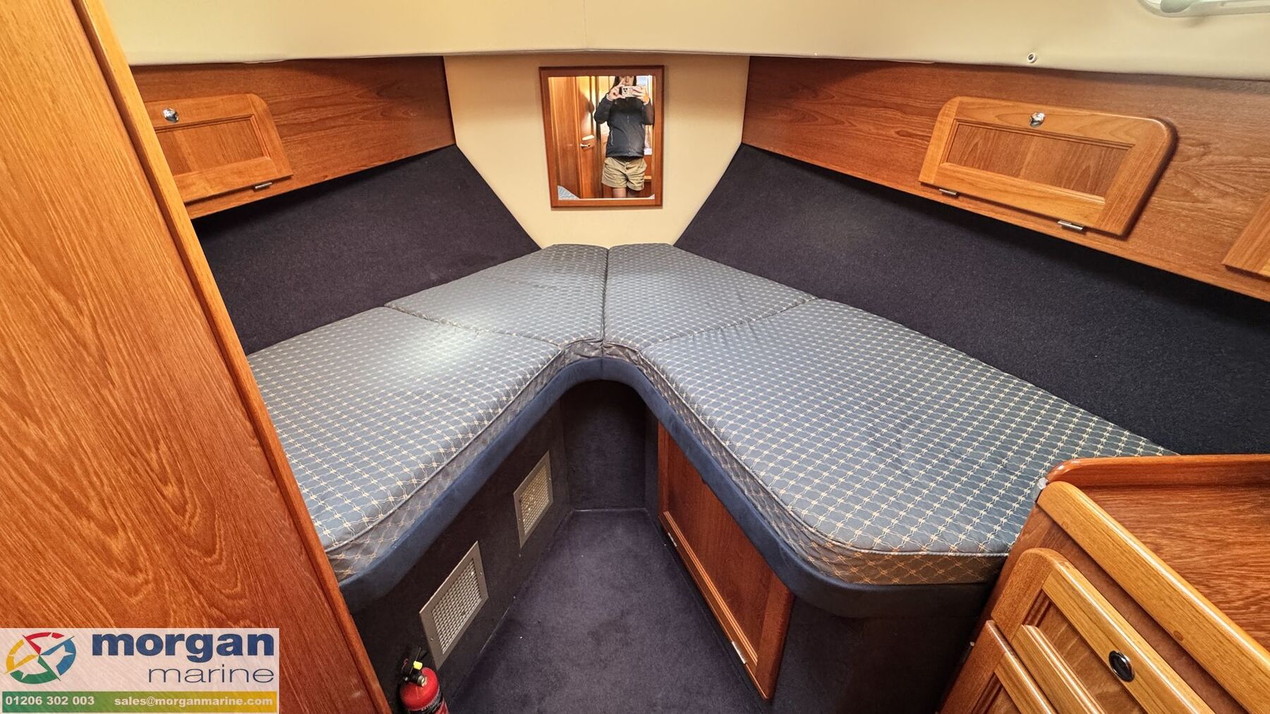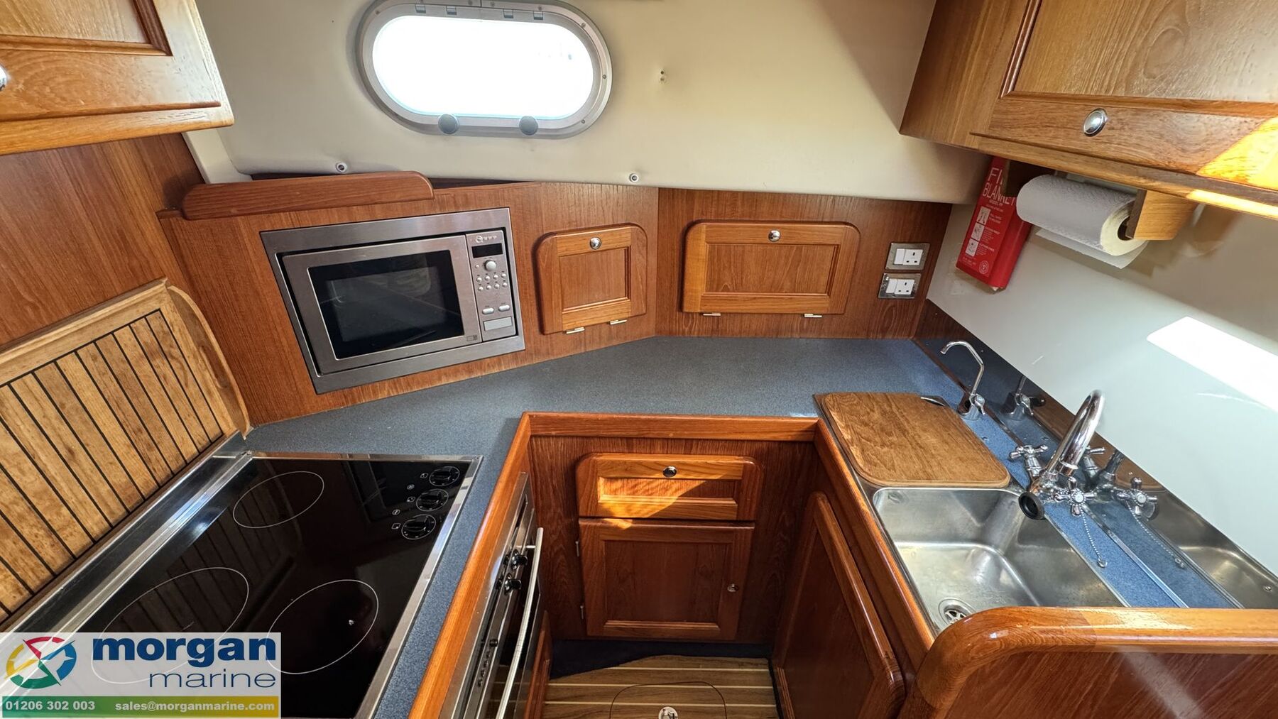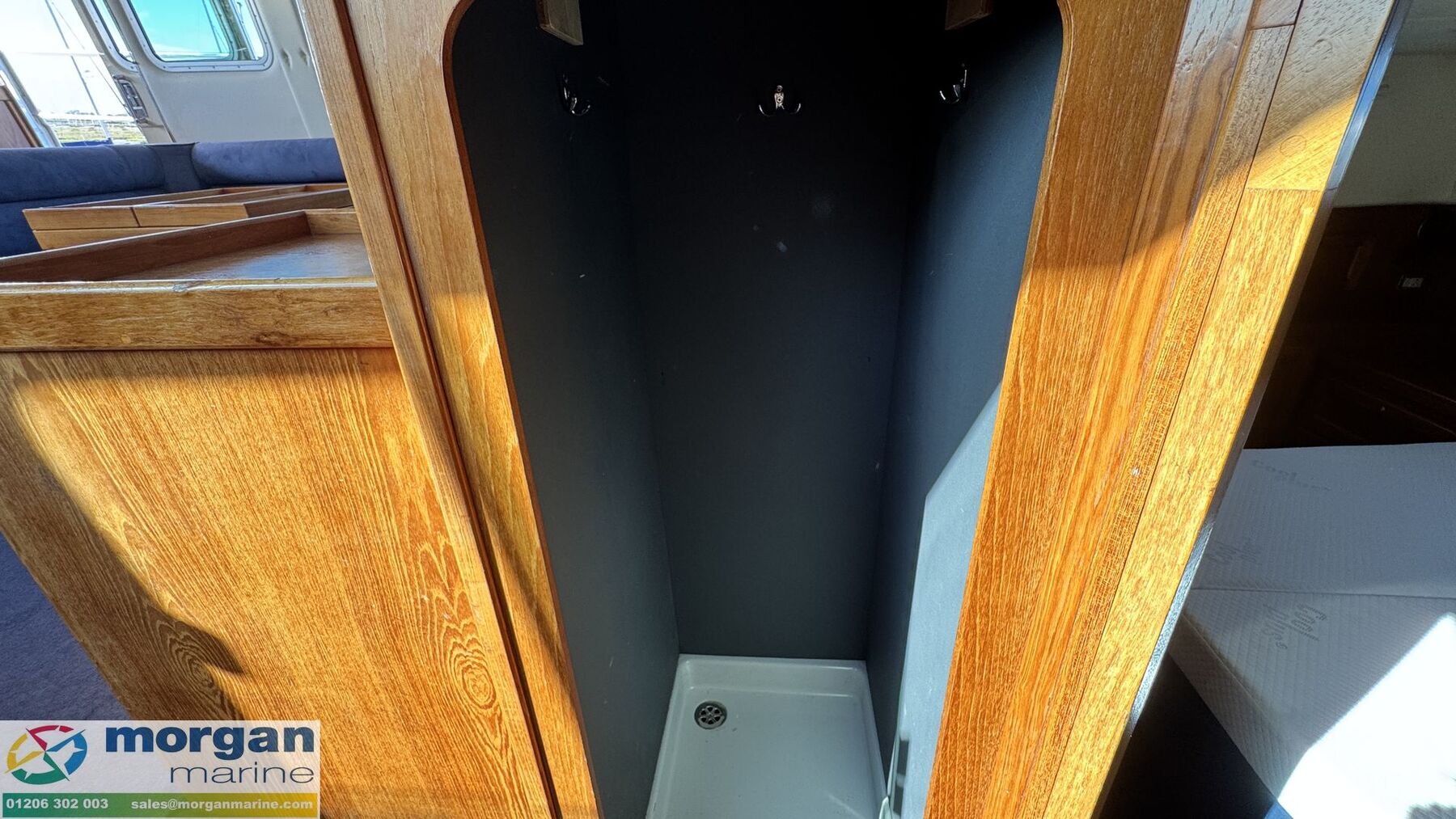 Cabin: Main master aft cabin with double berth, lots of storage and access to Ensuite toilet compartment with toilet, sink, shower, mirror and storage. Forward V-shaped double berth with infill cushion, storage, and roof hatch. Jack and Jill door to toilet compartment with toilet, sink, shower, mirror and storage. 3rd cabin with single berth, and storage. Large saloon U-shaped seating with table which owner has made custom made Backgammon game board on, TV and lots of storage. Extra fridge in saloon area. Galley with oven, hob, twin sink with hot and cold mixer tap, fridge, microwave and lots of storage. Overhead galley locker storage. Good amount of light from large windows.