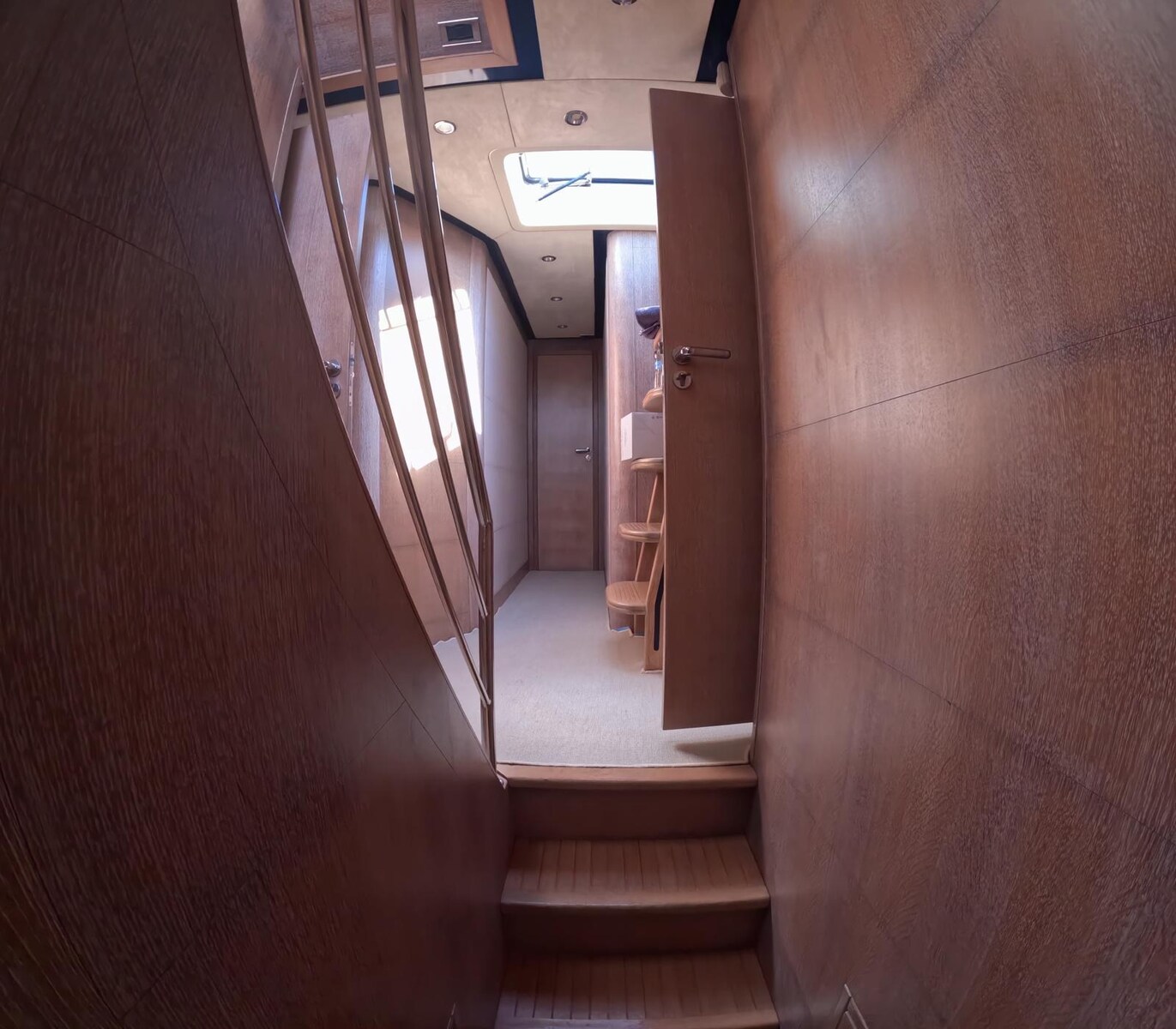 Diese AB Yachts Follia 75 wurde im April 1999 an ihren ersten und einzigen Eigner ausgeliefert und ist eine große und schnelle Sportyacht mit Hamilton Jet-Antrieb, die die höchsten Standards an Ausstattung und Verarbeitung mit hervorragendem Handling und Seetüchtigkeit kombiniert. Die Follia 75 ist ein Update früherer Designs, mit leistungsstärkeren Motoren und einem tiefen V-Rumpf, um ein schnelleres und komfortableres Segeln auf See zu ermöglichen. Zwei Deutz-Motoren mit je 1850 PS sorgen über Twin-Disc-Getriebe für die beeindruckende Kraft der Wasserstrahlen. Das Boot ist aus geschlossenzelligem Schaumstoff zwischen Schichten aus Verbundwerkstoff gebaut. Im Inneren des Laminats befindet sich eine Elastomerschicht, die die Abdichtung auch dann beibehält, wenn das Laminat bei einer Kollision beschädigt wird. Die Decks sind aus Aluminiumwaben gefertigt. Diese Konstruktion macht den Follia 75 sehr leicht, aber auch sehr langlebig. Zwei Achtertüren ermöglichen den Zugang zu den Beibooten. Ein weiteres Merkmal der Follia 75 ist das futuristische Cockpit-Design und die sehr intuitive Bedienung. Der Rückwärtsabweiser und die Drosselklappen werden mit einem einzigen Hebel gesteuert, und es stehen drei Leerlaufdrehzahlen zur Auswahl, um präzise zu manövrieren.
