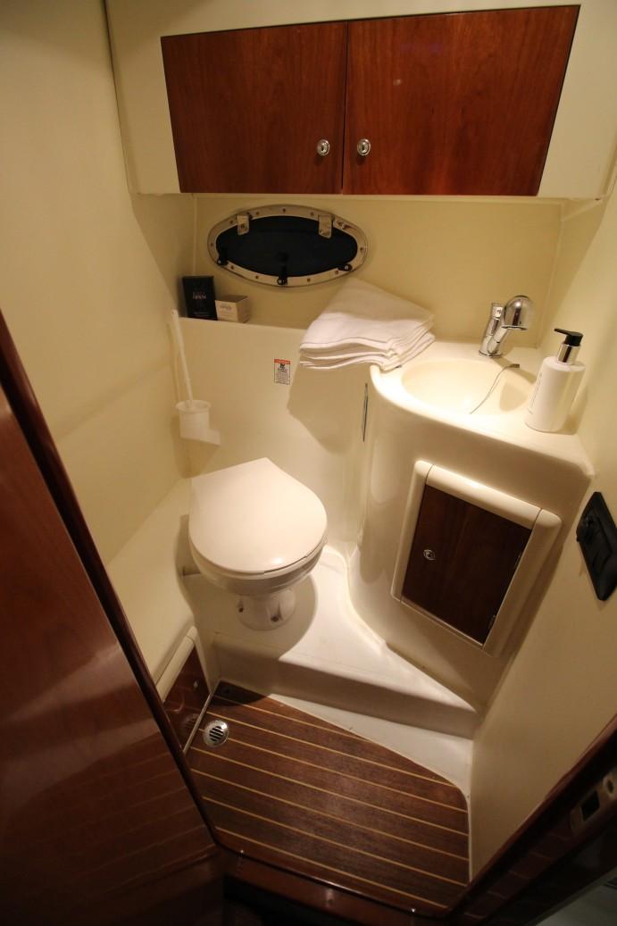 The electric marine toilet with macerator is hidden under a grp lid, furthermore you find a well sized marble top sink and plenty of storage.
