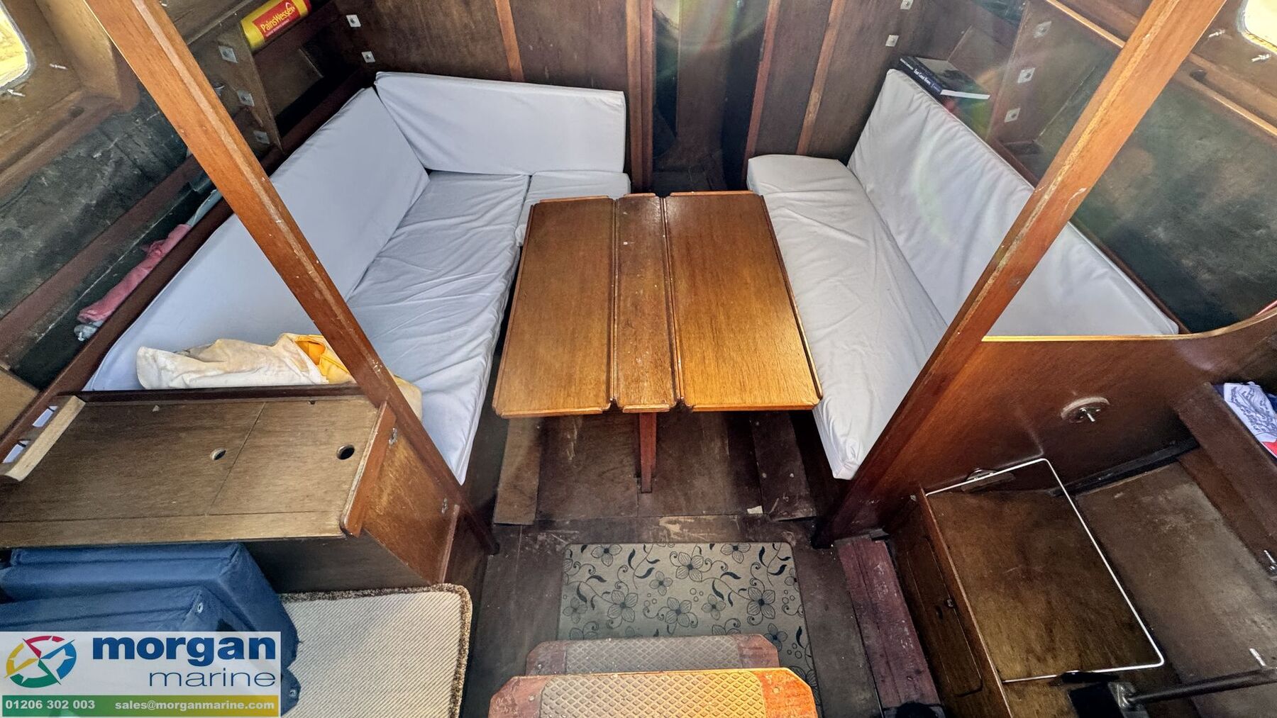 Cabin: Main forward V-shaped cabin with 2 berths. Saloon starboard and port side cushioned seating with fold up table - Can be used for another 2x single berths. Galley with 2x sinks and lots of storage. - Space for gas burner. Forward toilet compartment with sea toilet and storage. Chart table. Engine lid compartment from lift up steps.