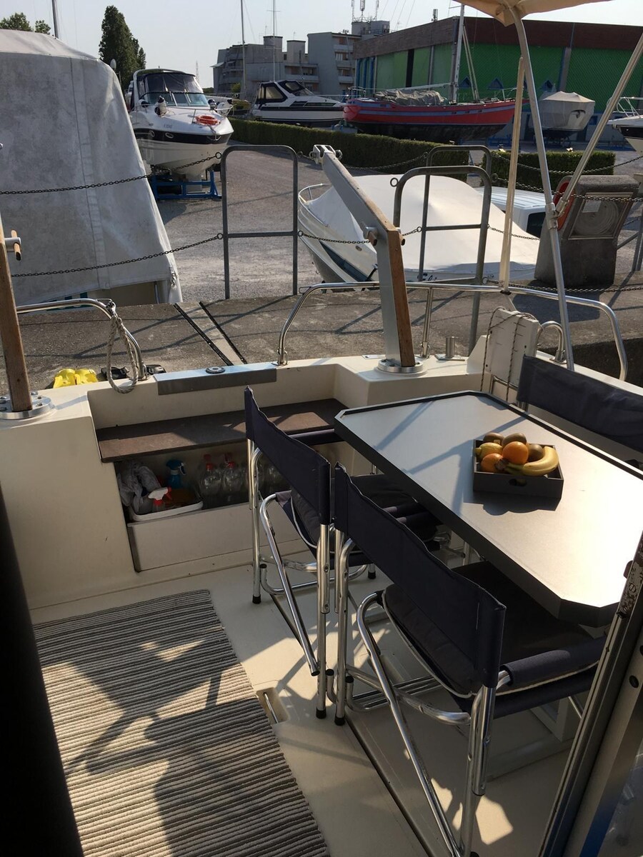 Motor Alarm, Alternator, Waterdruk systeem, Walstroomkabel, Buitendouche, Kraan voor bijboot (BESENZONI), Anker (ketting) spoelsysteem, Zonnepanelen, Stootwillen, Loopplank, Platform, Automatische bilgepomp, Walaansluiting 230V, Elektrische ankerlier, Zwemtrap, Kuiptafel, Bijboot (ZAR).