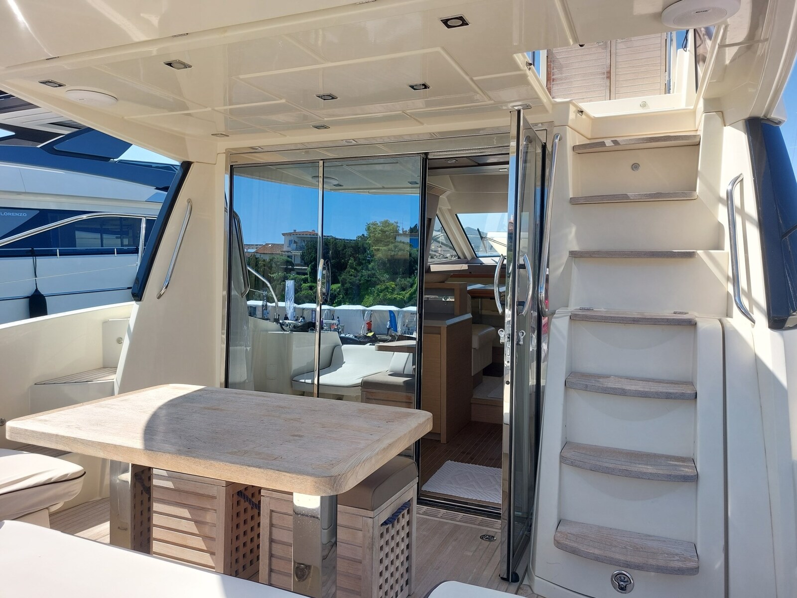 Rook-/gasmelder, 2 Motor Alarm, Bilge Alarm, Waterdruk systeem, Buitendouche, Dubbele besturing, Zoeklicht geïnstalleerd op spiegel, Elektrische trimflappen, 2 Trimflappen indicatoren, Anker (ketting) spoelsysteem, Wasbak in de kuip, Sfeerverlichting, Loopplank, Platform, Automatische bilgepomp, 2 Elektrische bilgepomp, Handmatige bilgepomp, Ingangsdeur, Teak in kuip, 2 Walaansluiting 230V (230 V - 50 Hz 63A con cavo di 15m), Walaansluiting voor water, City-/Water-connection, Elektrische ankerlier, Zwemtrap, Kuiptafel, Opklapbare salontafel, Bijboot, Hoorn, Hek lier, Boeglier.