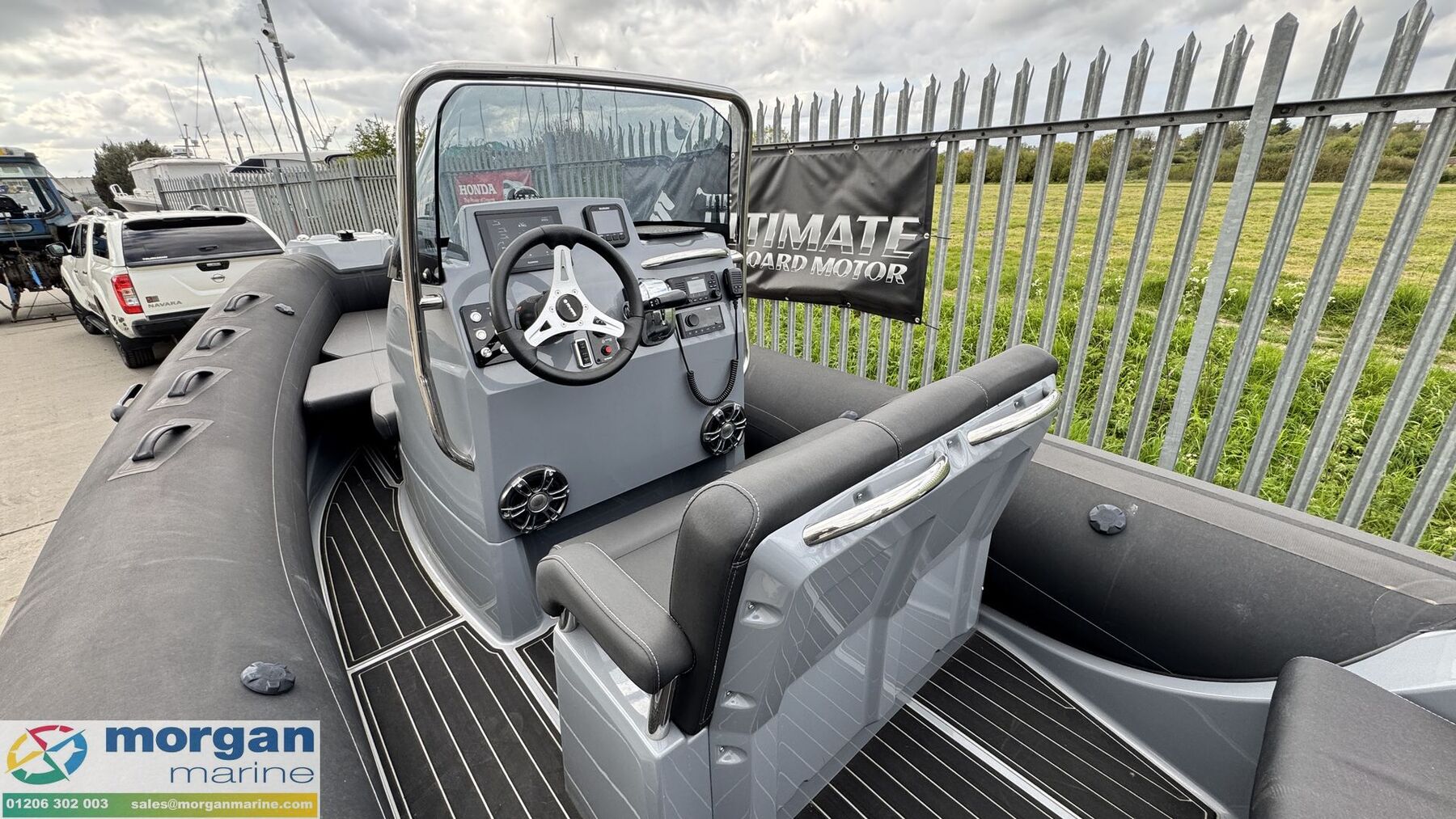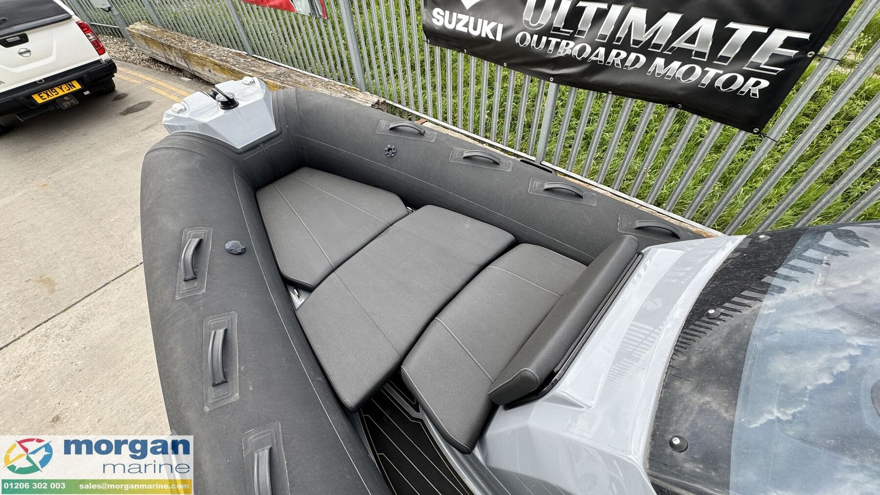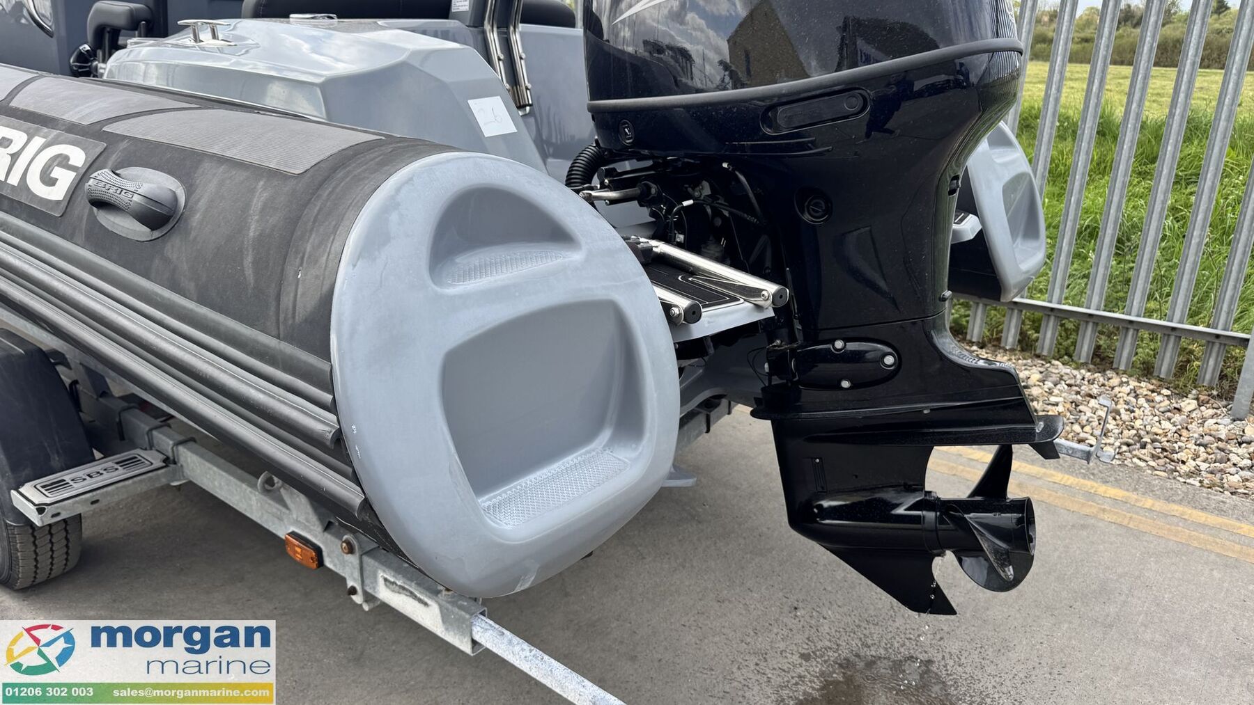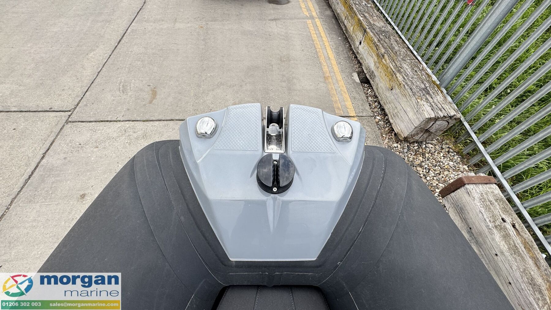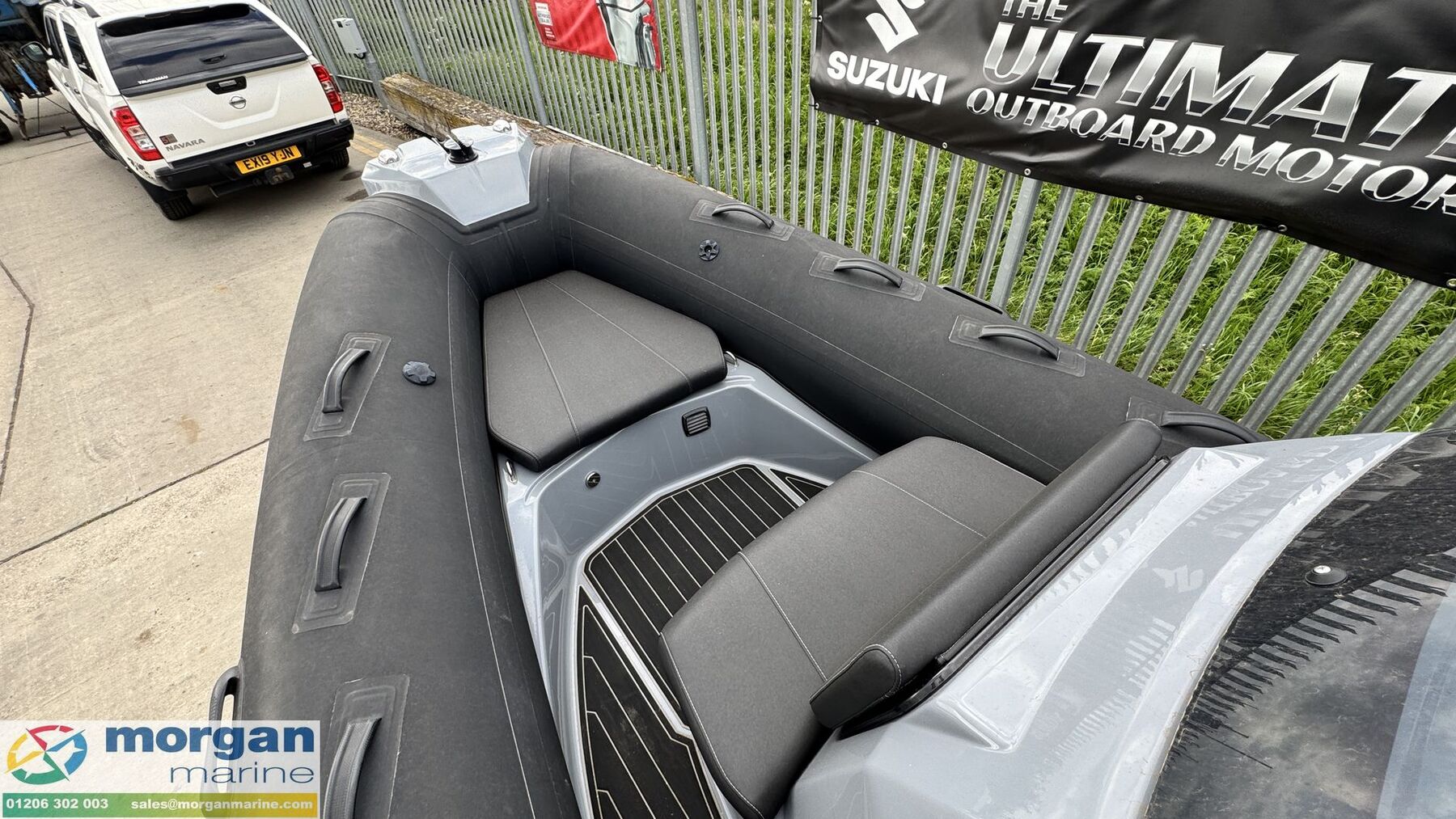 Deck: Deep GRP V-hull with black Hypalon tubes. Rubbing strake. Anti skid decking. Safety handles and carrying handles. Hard tube end with 2x anti skid steps on each. Bow locker. Hull ventilation system. Water ski mast. Twin self bailing unit. Front towing bow ring. Pop up mooring cleats. Built in davit lifting points. Bow roller. Deck shower. Bow step plate. Overall mooring. Swim platform with stainless steel telescopic boarding ladder.