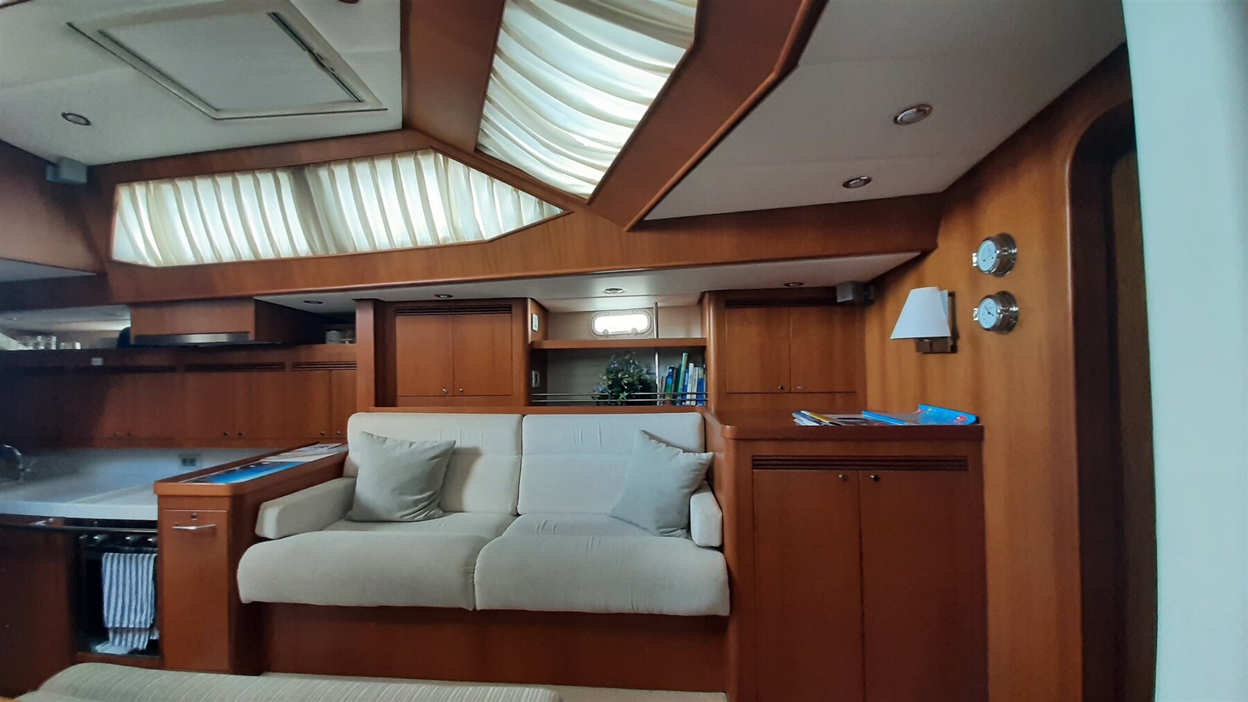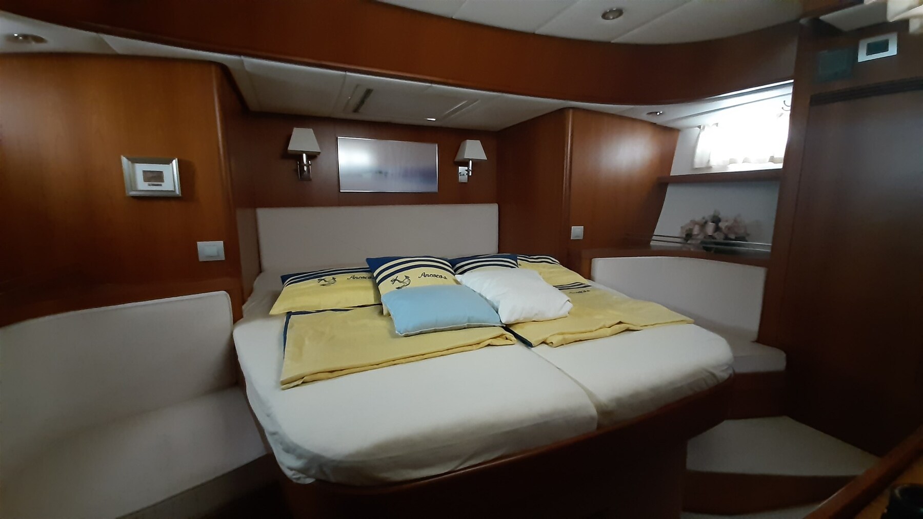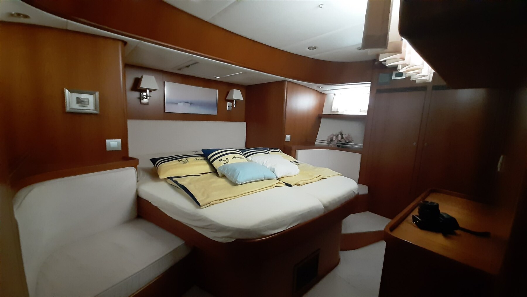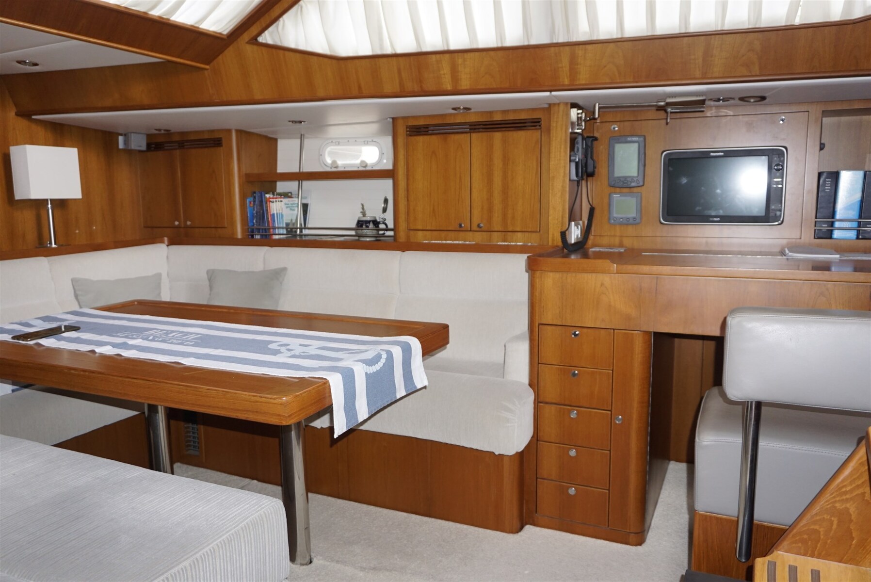 Barril de madera con tira de acero inoxidable, reflector de radar CYCLOPS II, luz estroboscópica y luz tricolor en la cabeza del árbol, todos los ojos de buey con persianas y mosquiteras, hélice GORI de 3 palas, extractor de humos en la cocina,