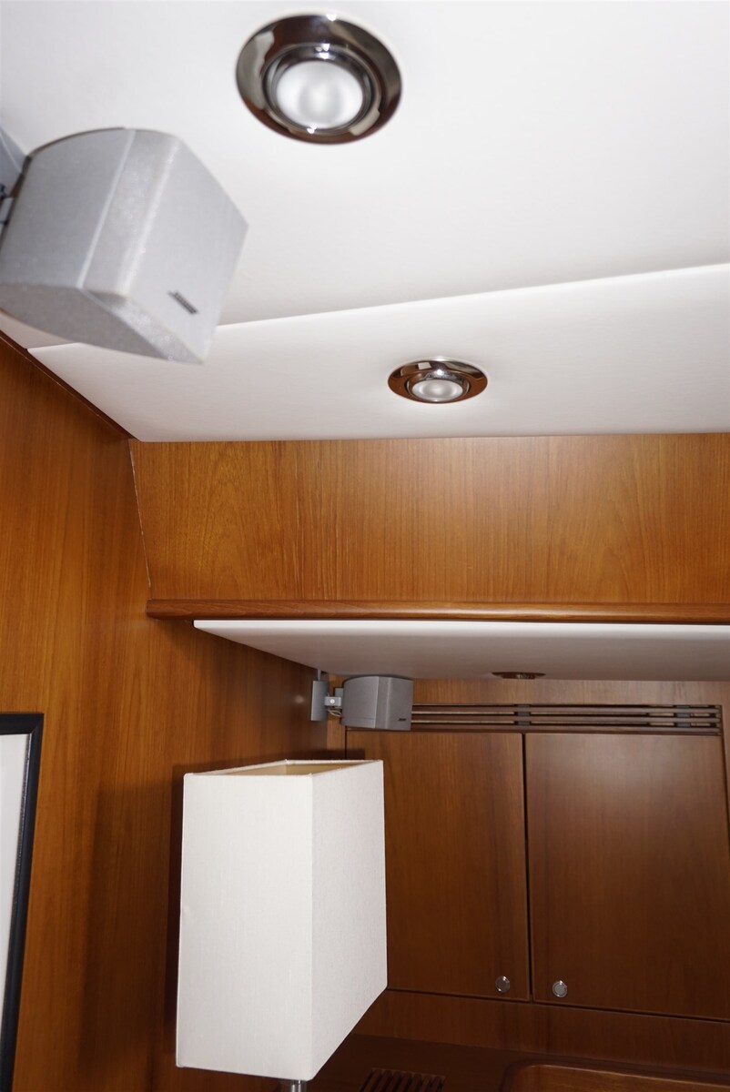 Houten dek met roestvrijstalen strip, CYCLOPS II radarreflector, stroboscooplicht en driekleurig licht op de masttop, alle patrijspoorten met jaloezieën en muskietennetten, GORI 3-bladige schroef, rookafzuiger in de keuken,