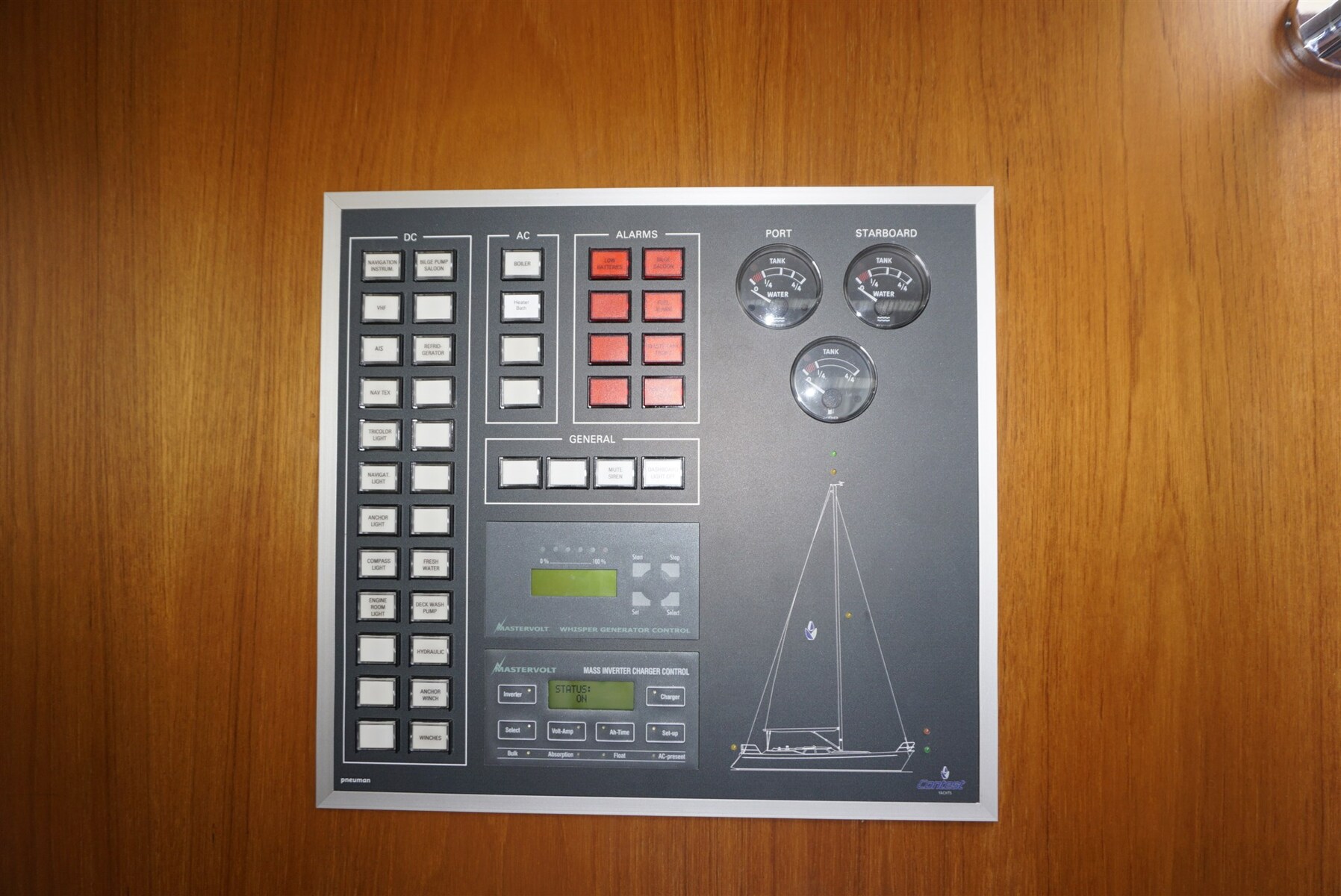 Деревянная бочка с полосой из нержавеющей стали, радиолокационный отражатель CYCLOPS II, легкий строб и трехцветный свет в голове дерева, все иллюминаторы с жалюзи и москитными сетками, 3-лопастной пропеллер GORI, вытяжка дыма на кухне,