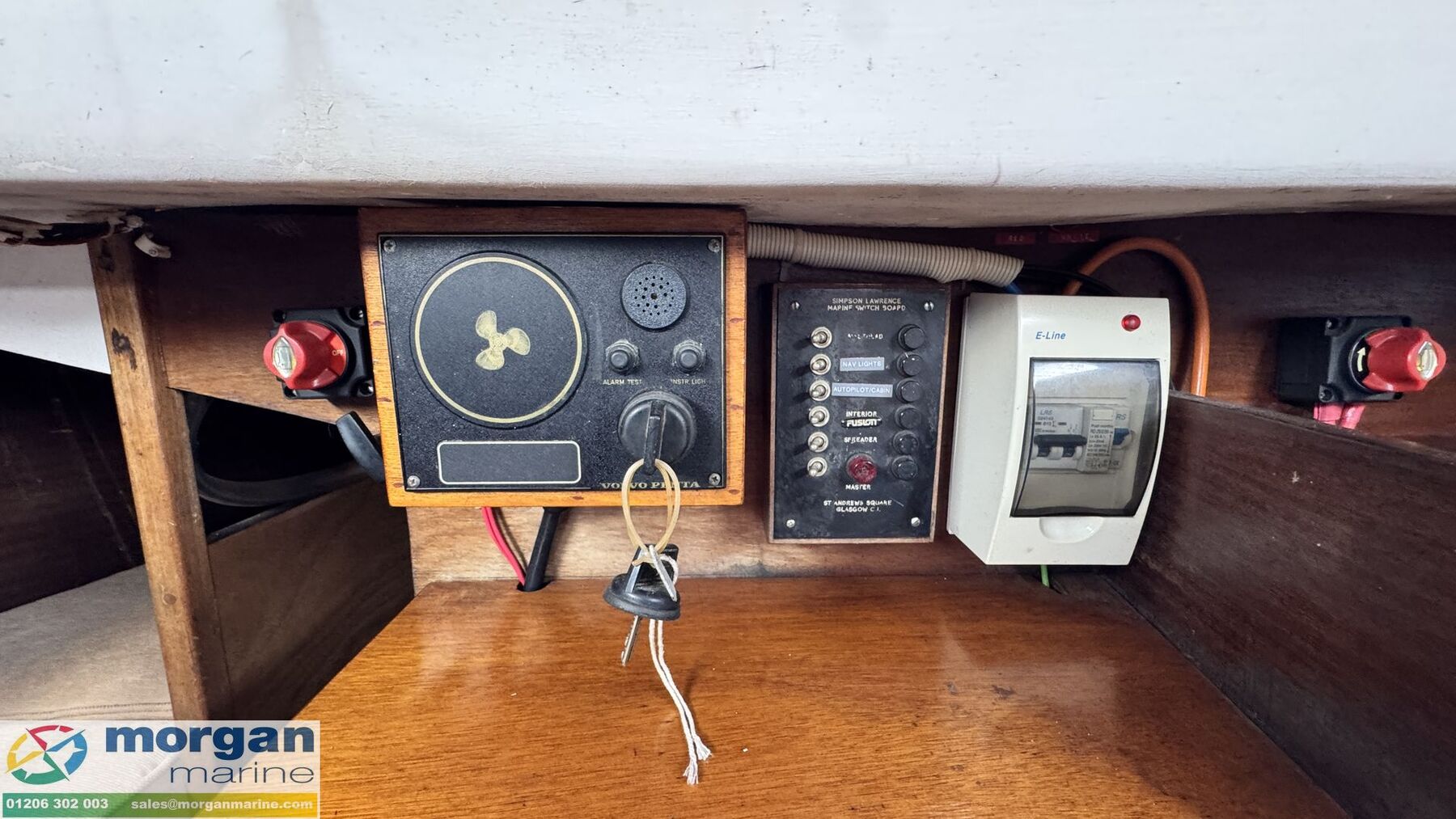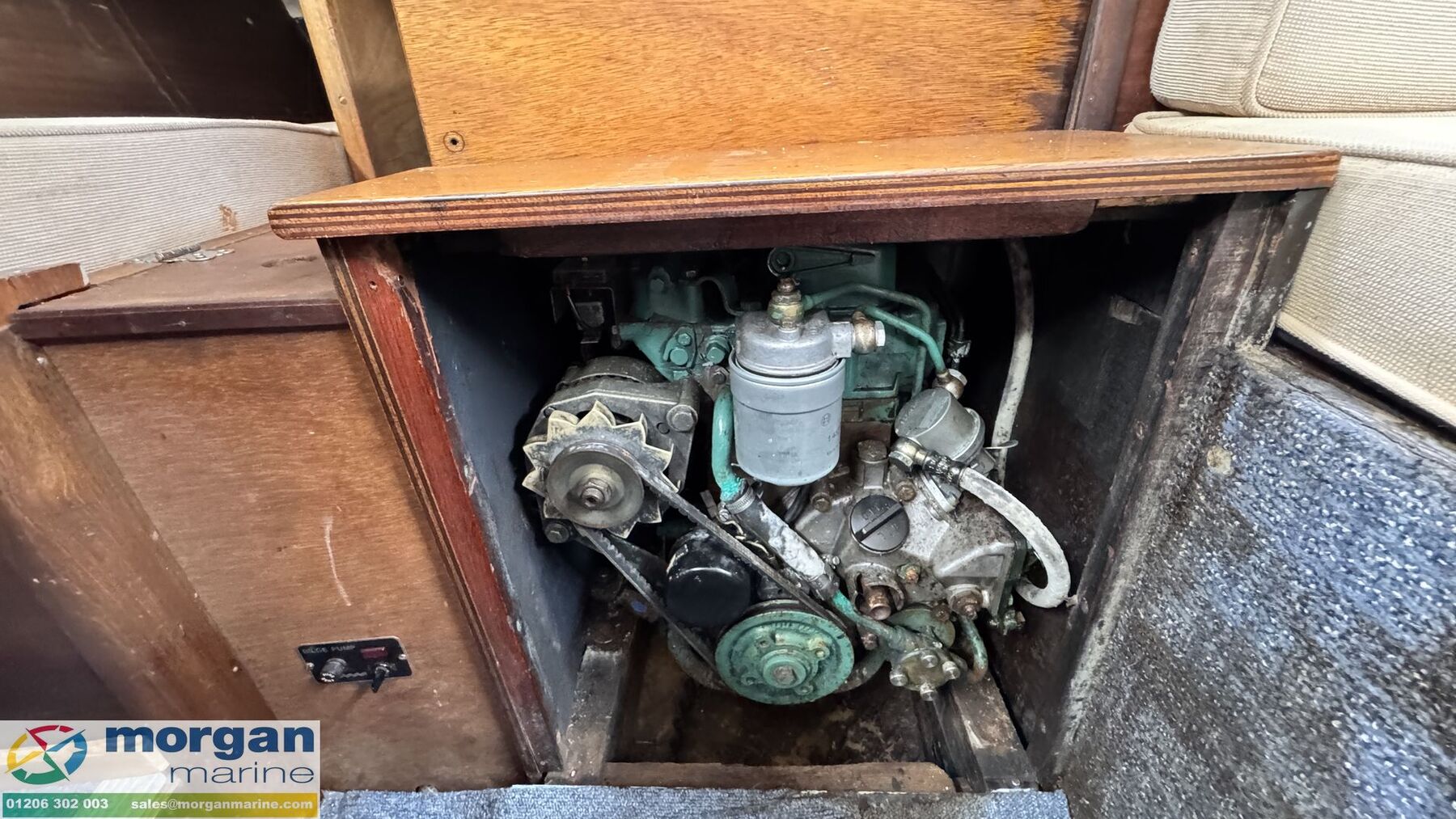 Machinery: Volvo Penta 2002 series 18hp twin cylinder diesel engine, believed to have been new mid 80's. Sea water cooling. Electric start with single lever control. Reversing reduction gearbox with shaft driven two bladed fixed propeller. Steel fuel tank in cockpit locker. Flexible fresh water tank. Manual bilge pump.
