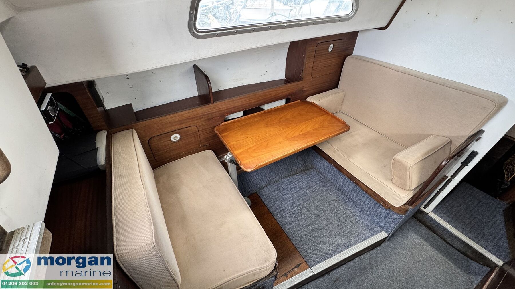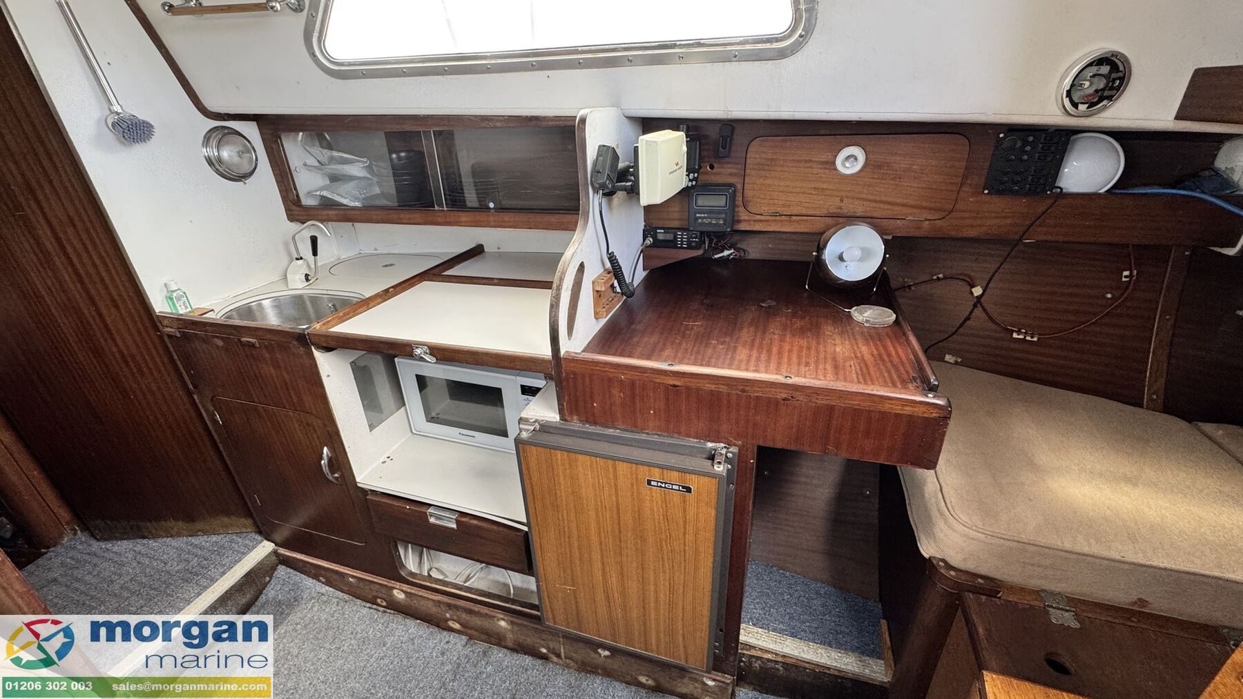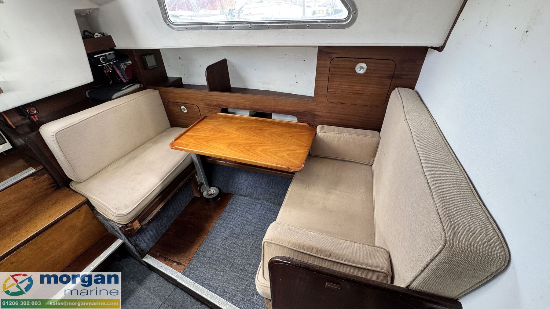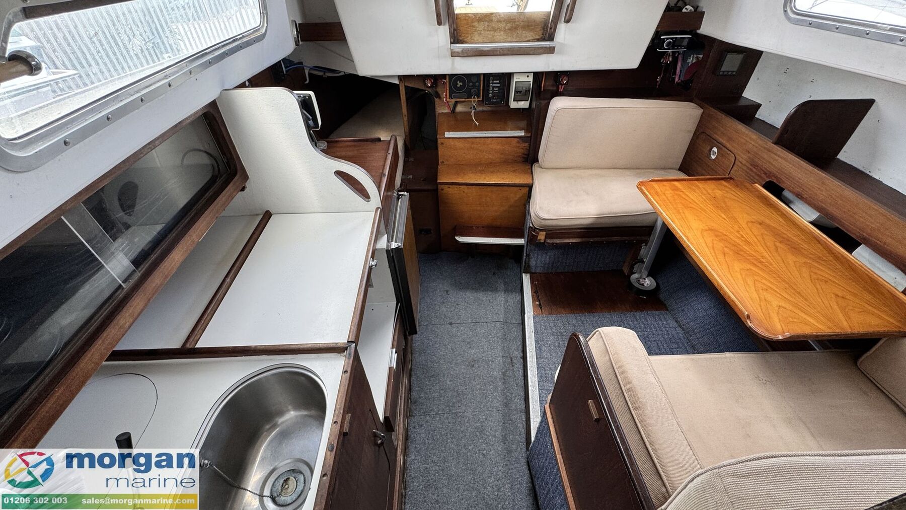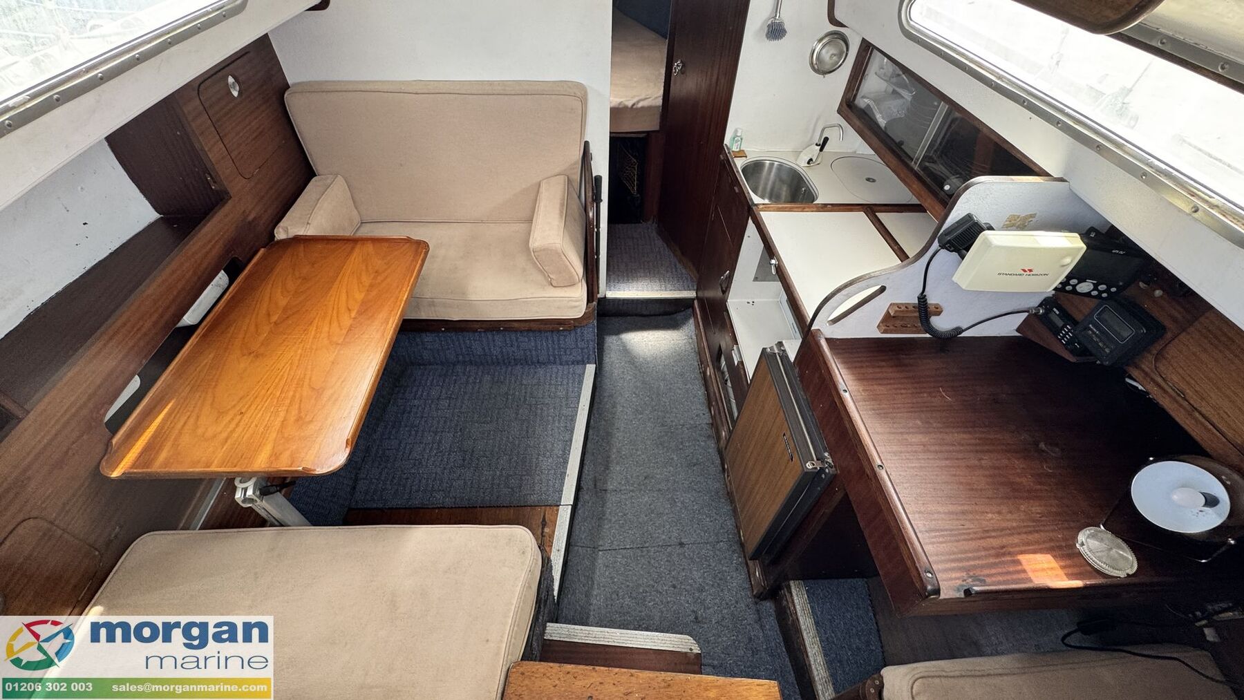 Cabin: Steps down into saloon area. Large saloon area with dinette to port side with lowering table converting into berth. Saloon with 5ft 10in headroom. Galley to starboard side with 240v microwave oven, 240v single hob, sink with cold water supply, Engel 12v fridge and large amounts of storage. Saloon and cabin upholstery in beige tweed new in 2009. Chart table to starboard side with quarter berth aft. Forcabin with Vee berth with opening deck hatch. Port side toilet compartment with manual sea toilet, mirror and port hole.