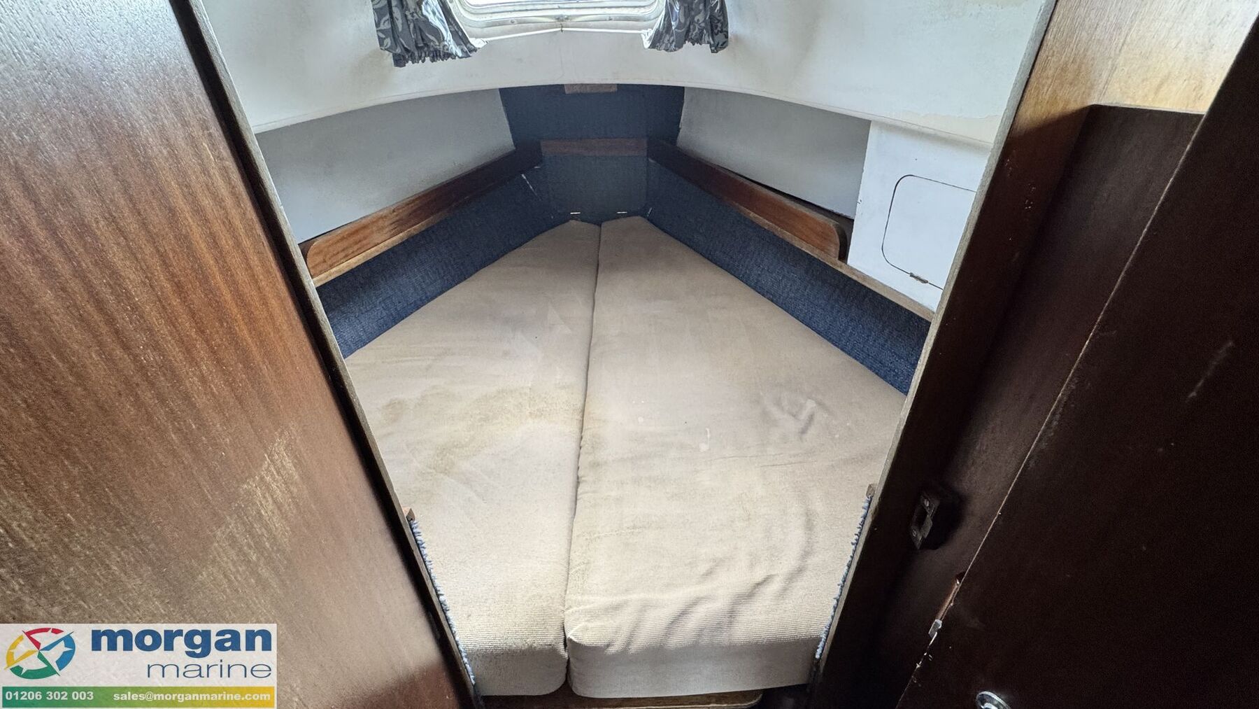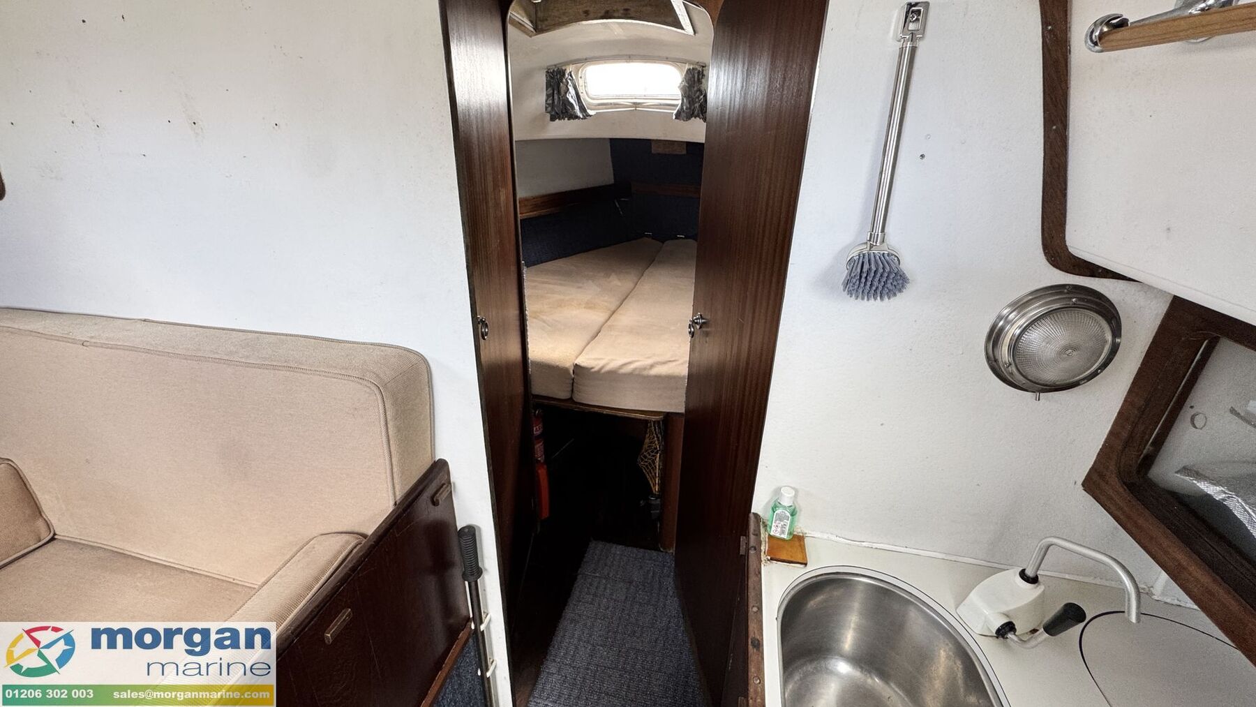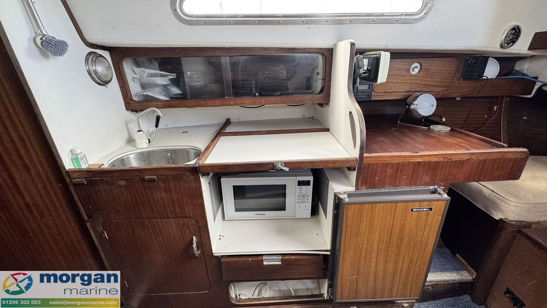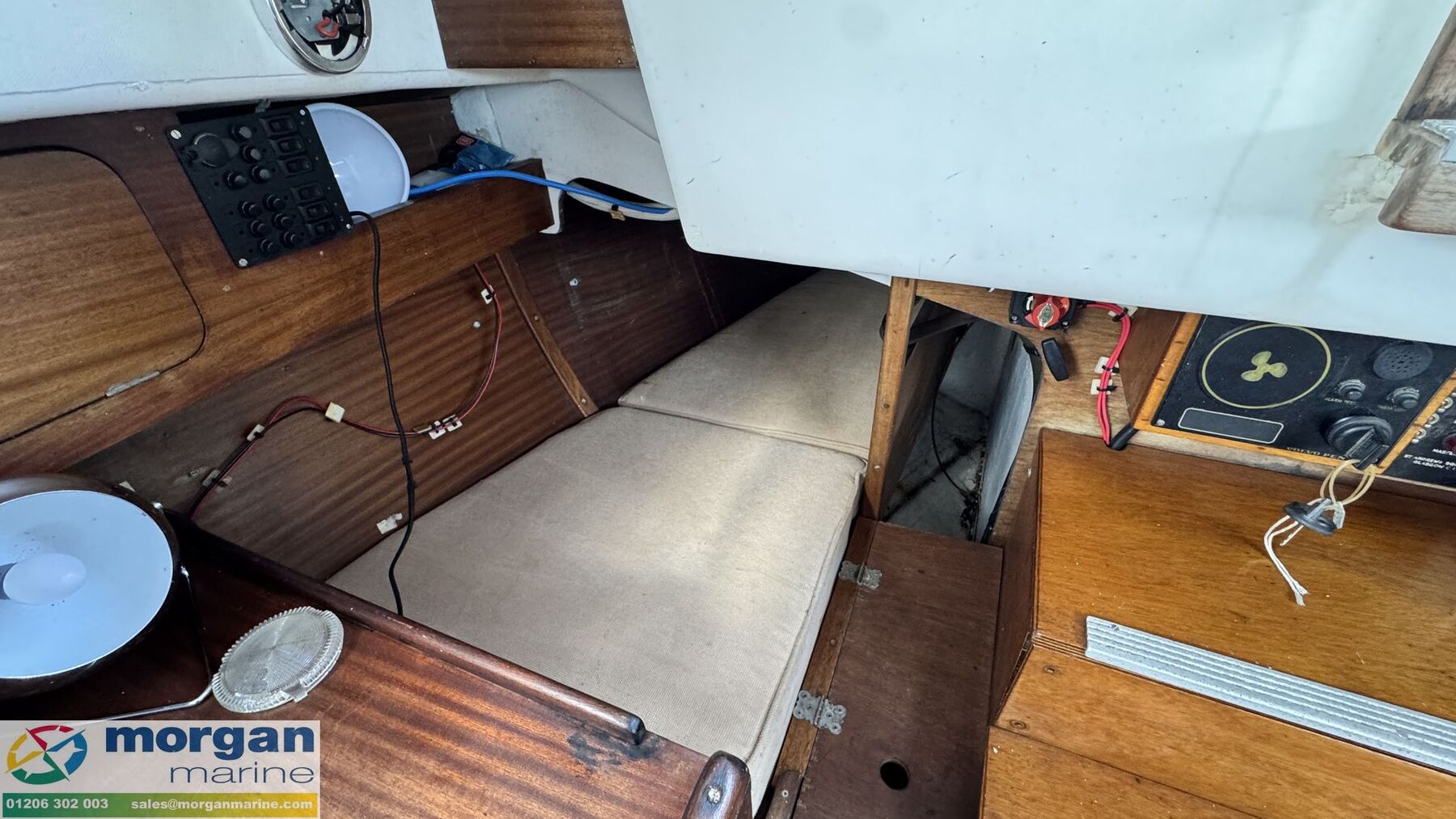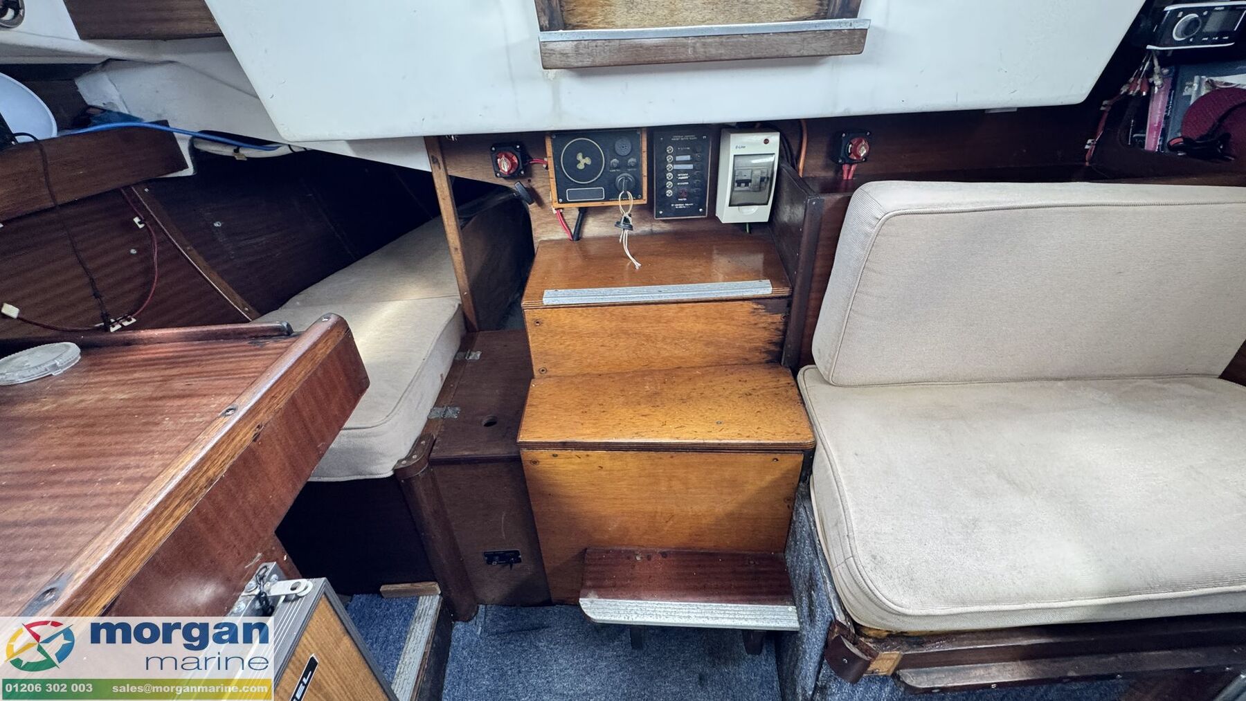 Cabin: Steps down into saloon area. Large saloon area with dinette to port side with lowering table converting into berth. Saloon with 5ft 10in headroom. Galley to starboard side with 240v microwave oven, 240v single hob, sink with cold water supply, Engel 12v fridge and large amounts of storage. Saloon and cabin upholstery in beige tweed new in 2009. Chart table to starboard side with quarter berth aft. Forcabin with Vee berth with opening deck hatch. Port side toilet compartment with manual sea toilet, mirror and port hole.