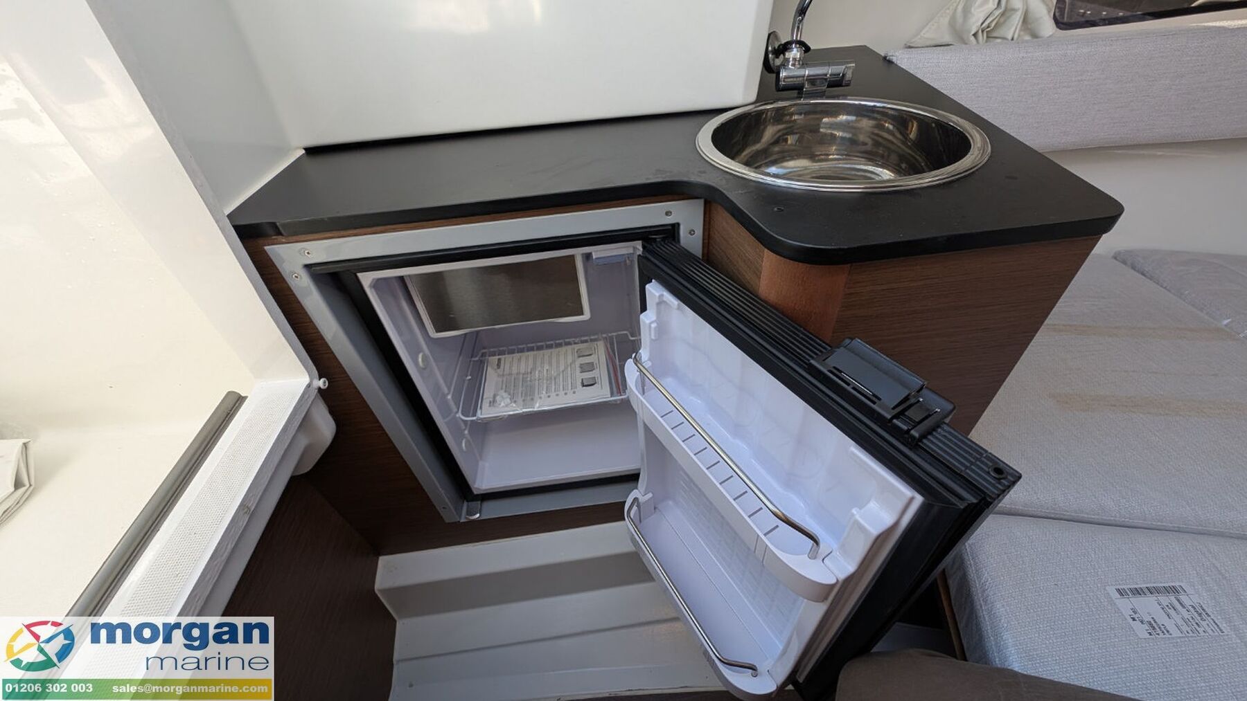 Cabin: Black transparent sliding plexi door. 2 berth cabin with storage + shelves, cushions, overhead lights, opening deck hatch, curtains and hull windows + porthole in console. Separate compartment on starboard side with marine toilet. Port side galley with stainless steel sink and 40L fridge.