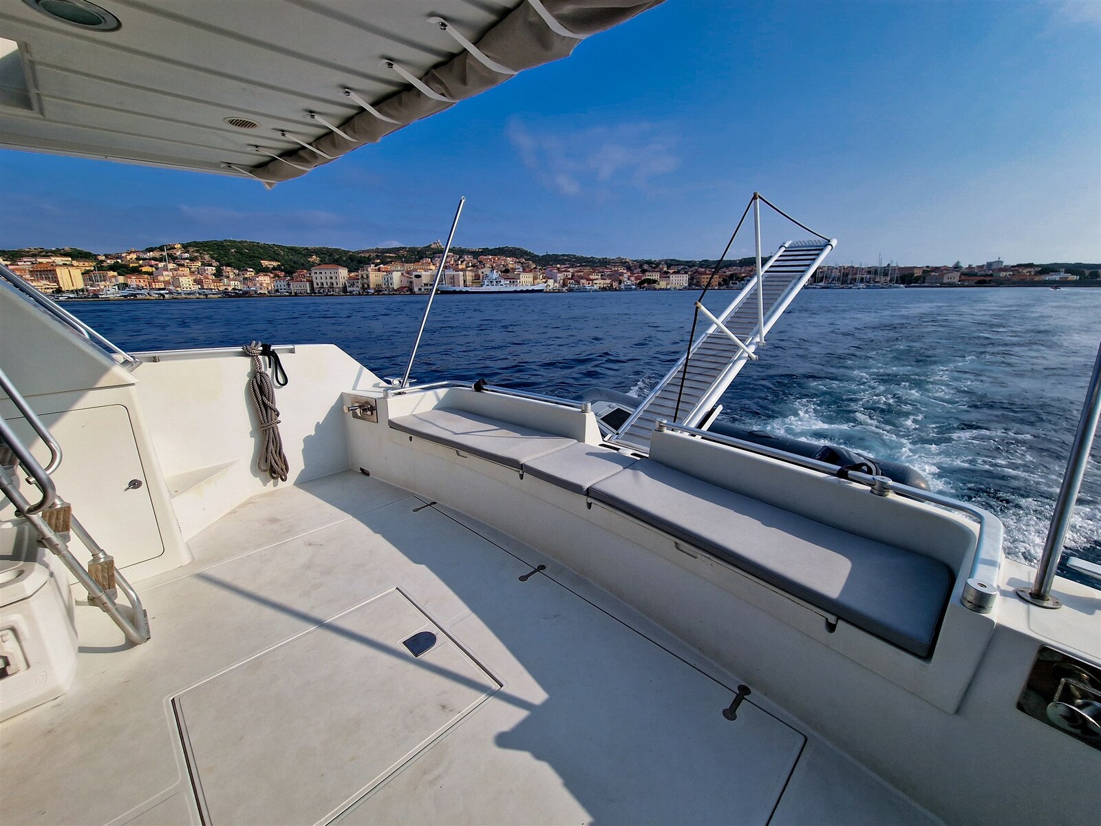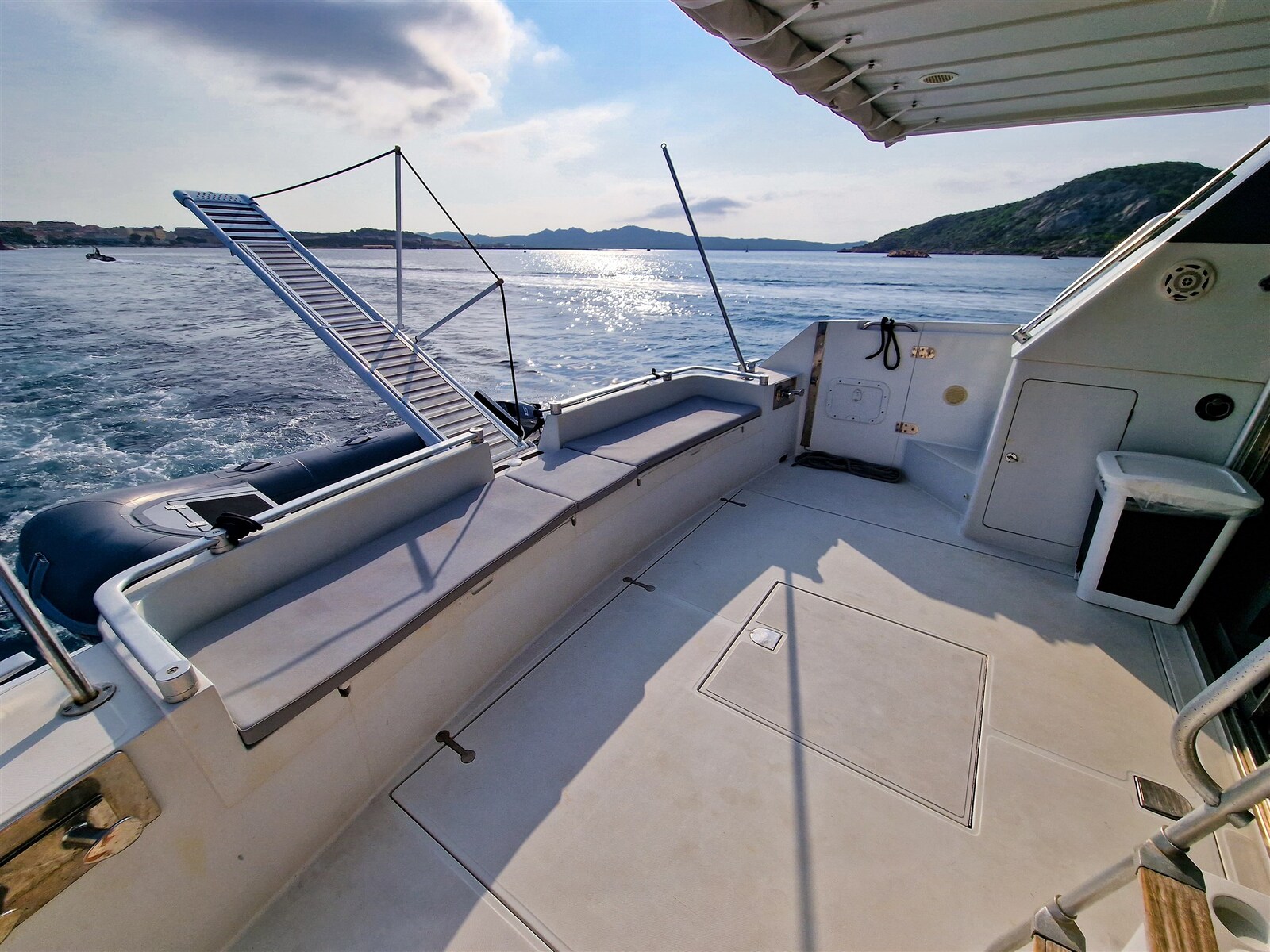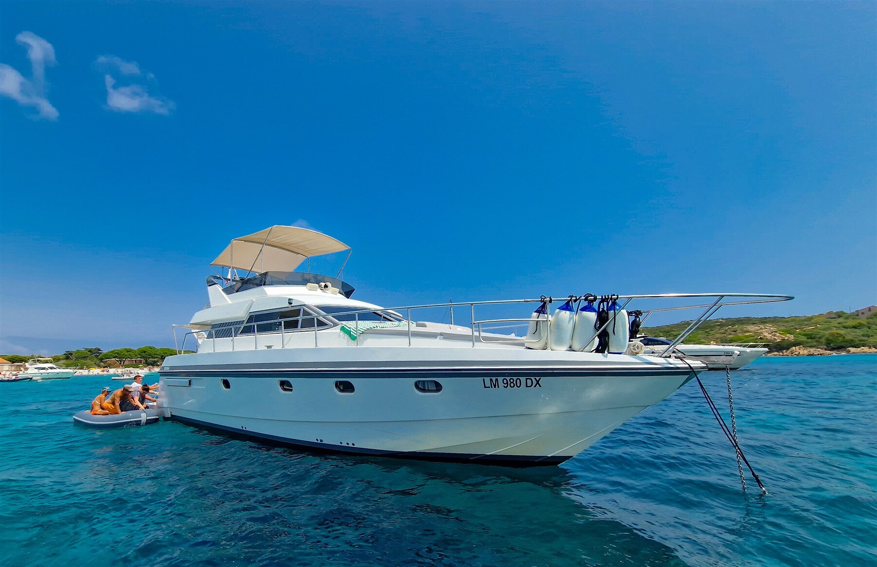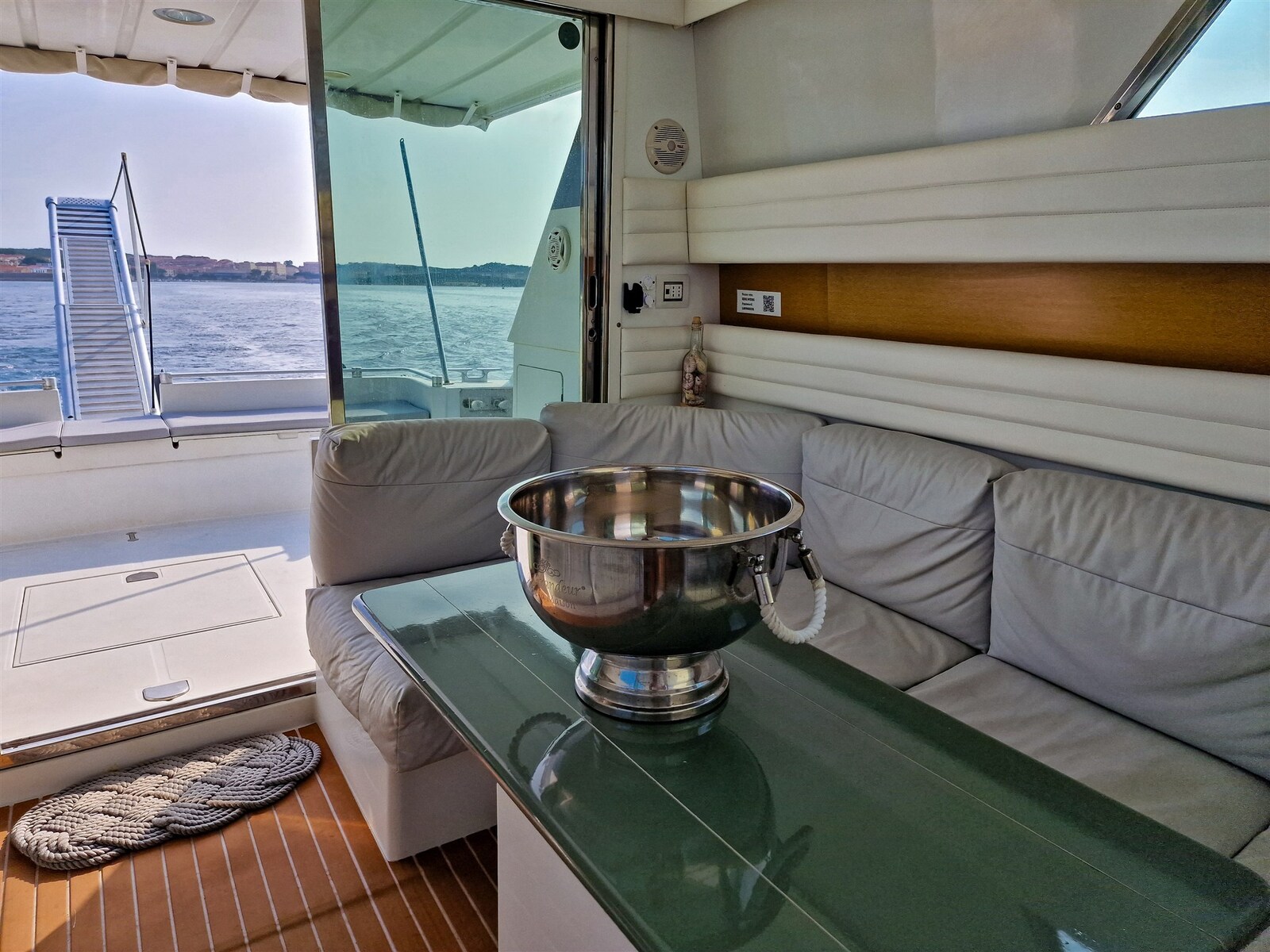 Allarme fumo/gas, 2 Allarme motore, Allarme sentina, Autoclave, 6 Batterie (150ah), Cavo corrente di banchina, Corrimano, Doccia esterna, Doppia timoneria, Fari fissi a poppa, 2 Flap elettrici, 2 Indicatori Flaps, Lavaggio catena, Lavandino nel Pozzetto, Luci di cortesia, Parabordi, Passerella, Piattaforma, Pompa di sentina automatica, Porta ingresso, Presa 220V banchina, Presa acqua banchina, Salpa Ancore Elettrico, Scaletta da bagno, Tavolo pozzetto, Tavolo Salone Abbattibile, Tientibene con cancelletti, Tromba, Winch tonneggio di prua.