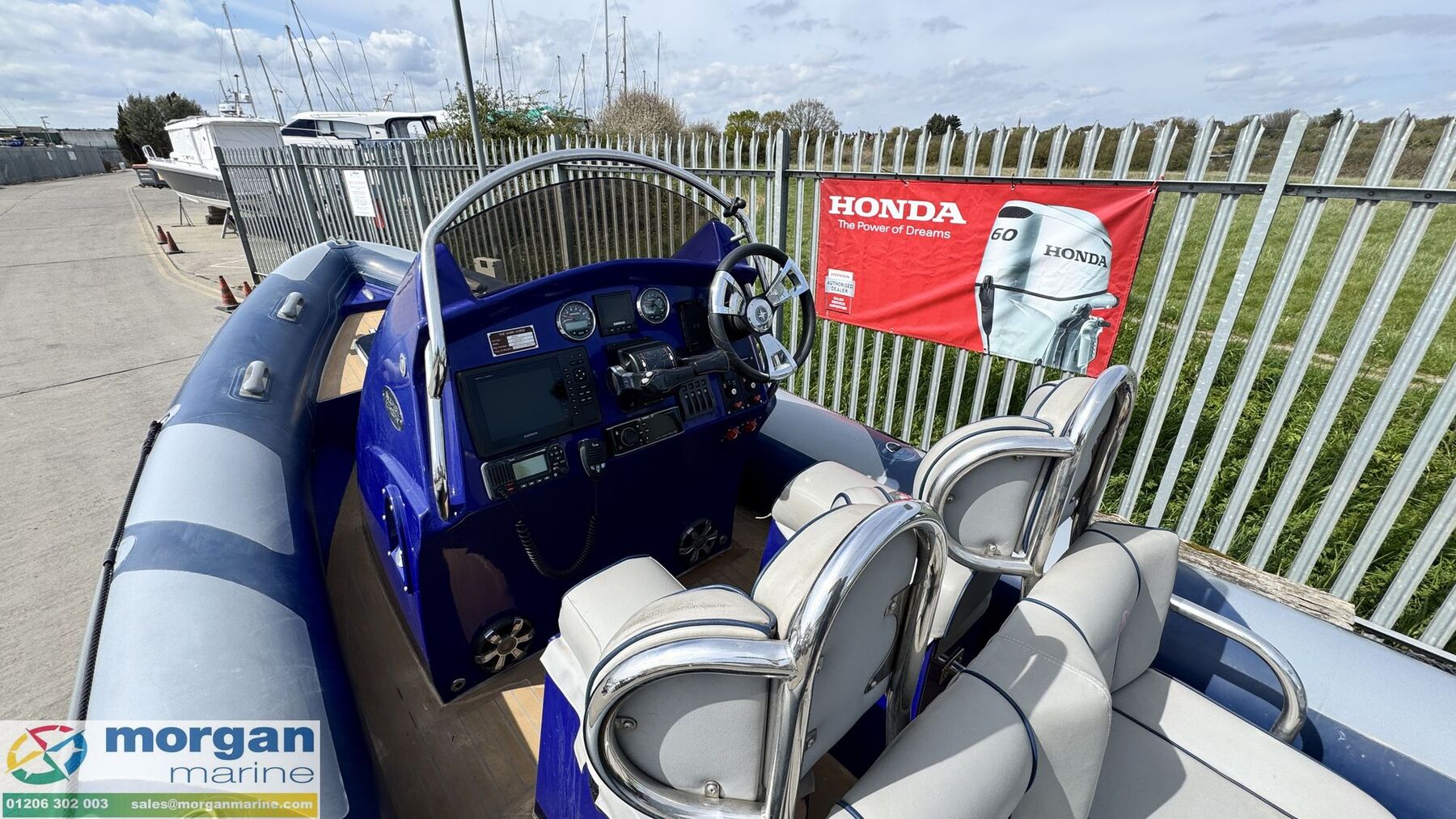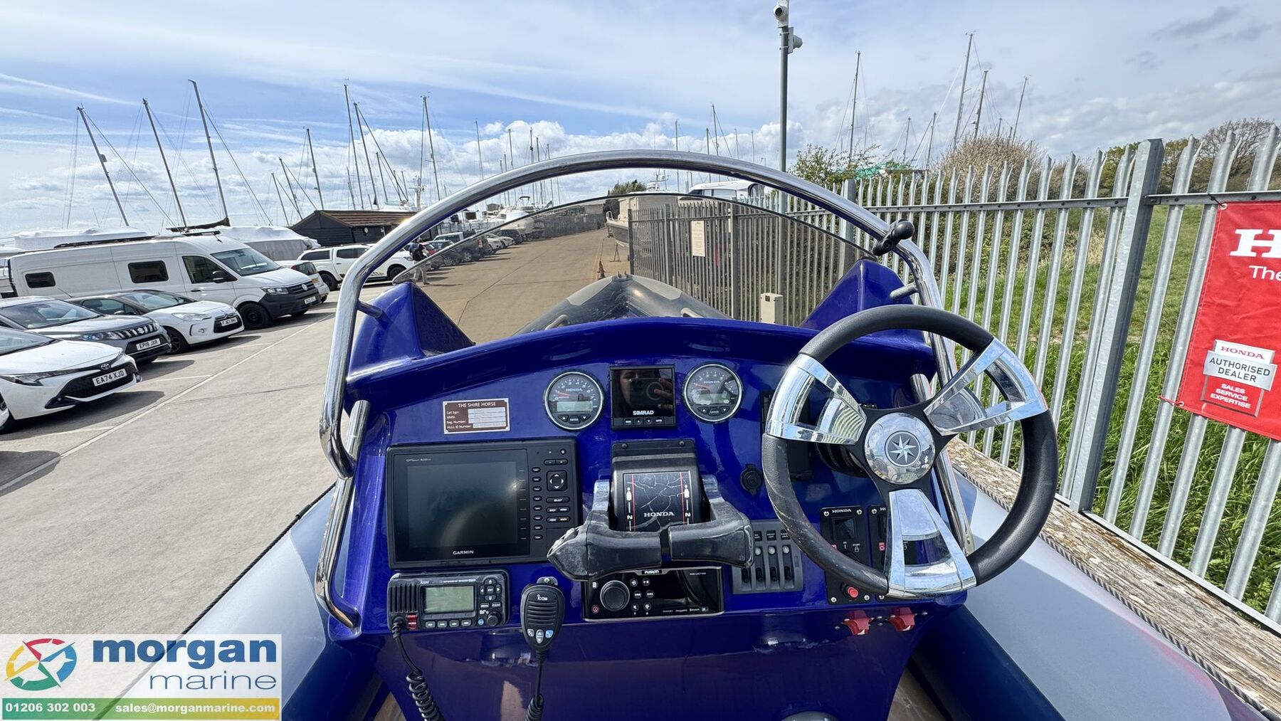Electronics: Garmin GPSMap 820 XS chart plotter. Icom VHF radio. Fusion audio with speakers. Simrad IS35 digital gauge NMEA 2000. Honda gauges. Switch panel with circuit breakers. Battery marine isolators. Automatic and manual bilge pump. Navigation lights. Anchor light. 12V Socket. Scanstrut wireless phone charger.