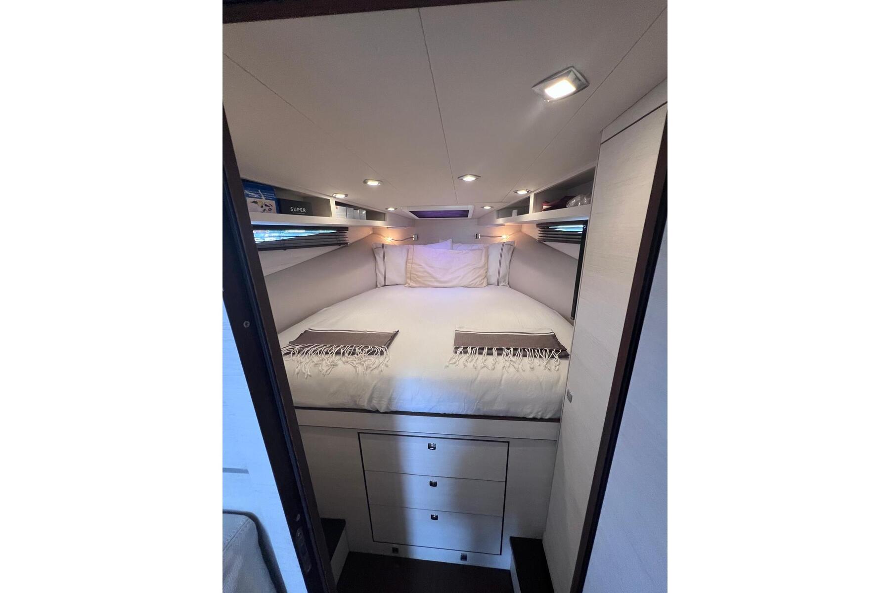 Interior consists of forward master cabin with generous closets and storage rooms; aft cabin with double bed on floor; Dinette with table that converts to bed; separate bathroom room with electric toilet and shower stall; galley room with dishwasher, refrigerator, oven, sink, custom cabinetry for dish service.