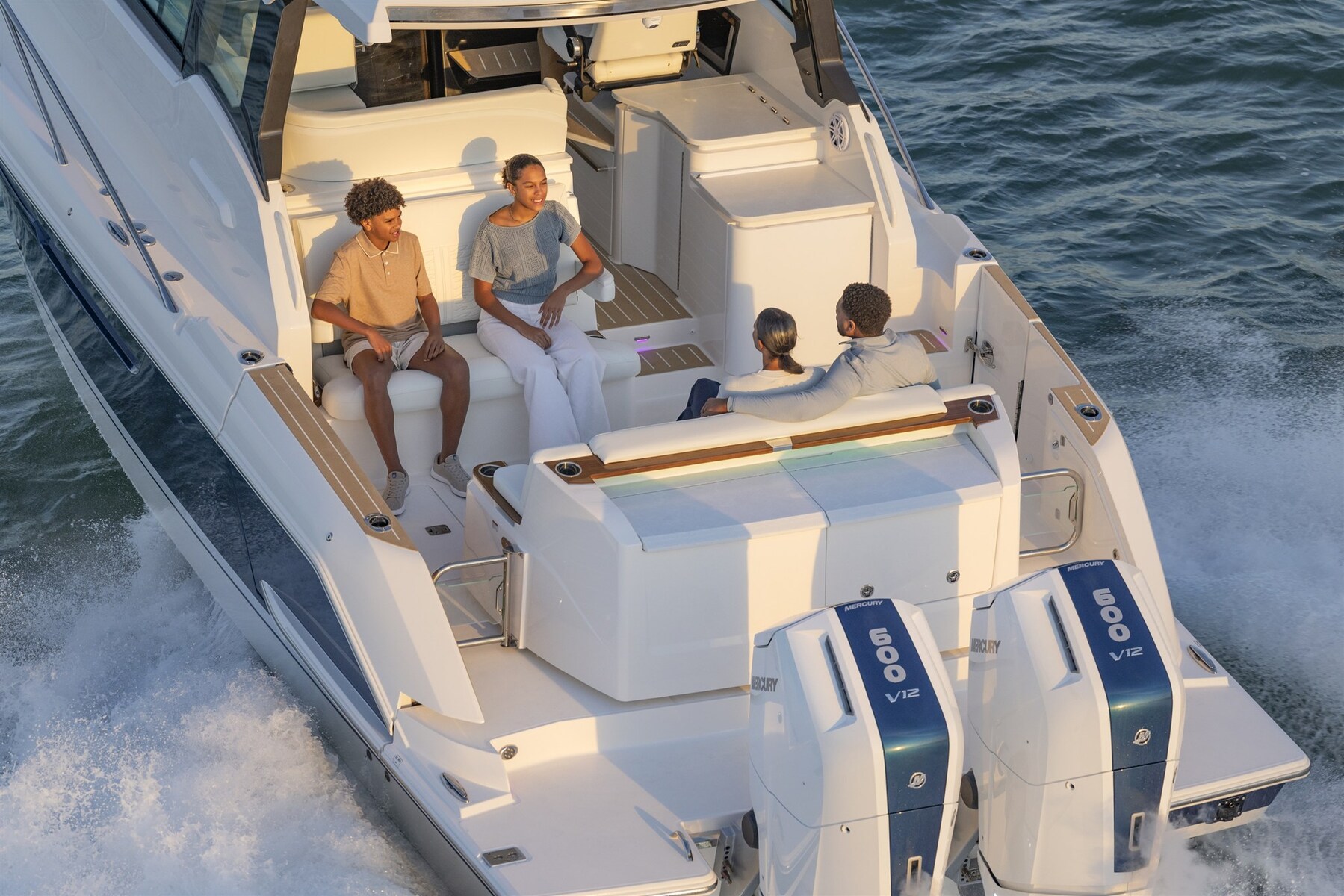 The 39 LE lives at the intersection of legacy and luxury; rooted in the LE Series pillars of innovation and versatility while remaining committed to the heritage of Tiara Yachts’ timeless design. Featuring a salon social zone with versatile seating, the helm seat rotates inward while the companion seat adjusts to form a comfortable L-shaped lounge, ideal for entertaining. The aft cockpit offers a customizable experience, featuring your choice of the Buffet Lounge or the Adventure modules. The aft facing cockpit seat with storage complements either module. The galley is thoughtfully positioned below to enhance the social space above deck. Outfitted with a sink, microwave, cooktop, and premium amenities, the space is designed to support effortless entertaining. Two well-appointed sleeping quarters offer comfort on longer cruises and a three-zone head complete the space.