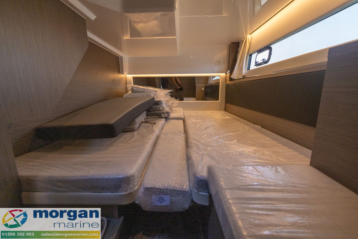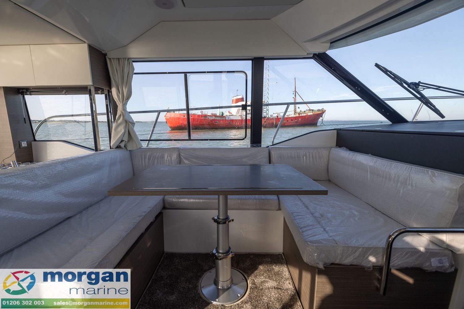Cockpit: Wheelhouse with aft sliding door, starboard side sliding door, port side sliding window, front glass windscreen with port and starboard windscreen wipers + screen wash. Adjustable pilot bolster bench seat. Fabric upholstery in saloon. Wheelhouse saloon on port side with U-shape seating (with lockers under) around table. Aft galley with sink (electric pressurised hot water), 144L fridge, electric stove + oven, bar, storage and overhead lockers. Wheelhouse curtains. Flybridge with second helm position (with full engine controls) + windscreen + large bolster pilot seat + co-pilot bench, stainless steel pulpit, table and aft sundeck cushions + fridge.