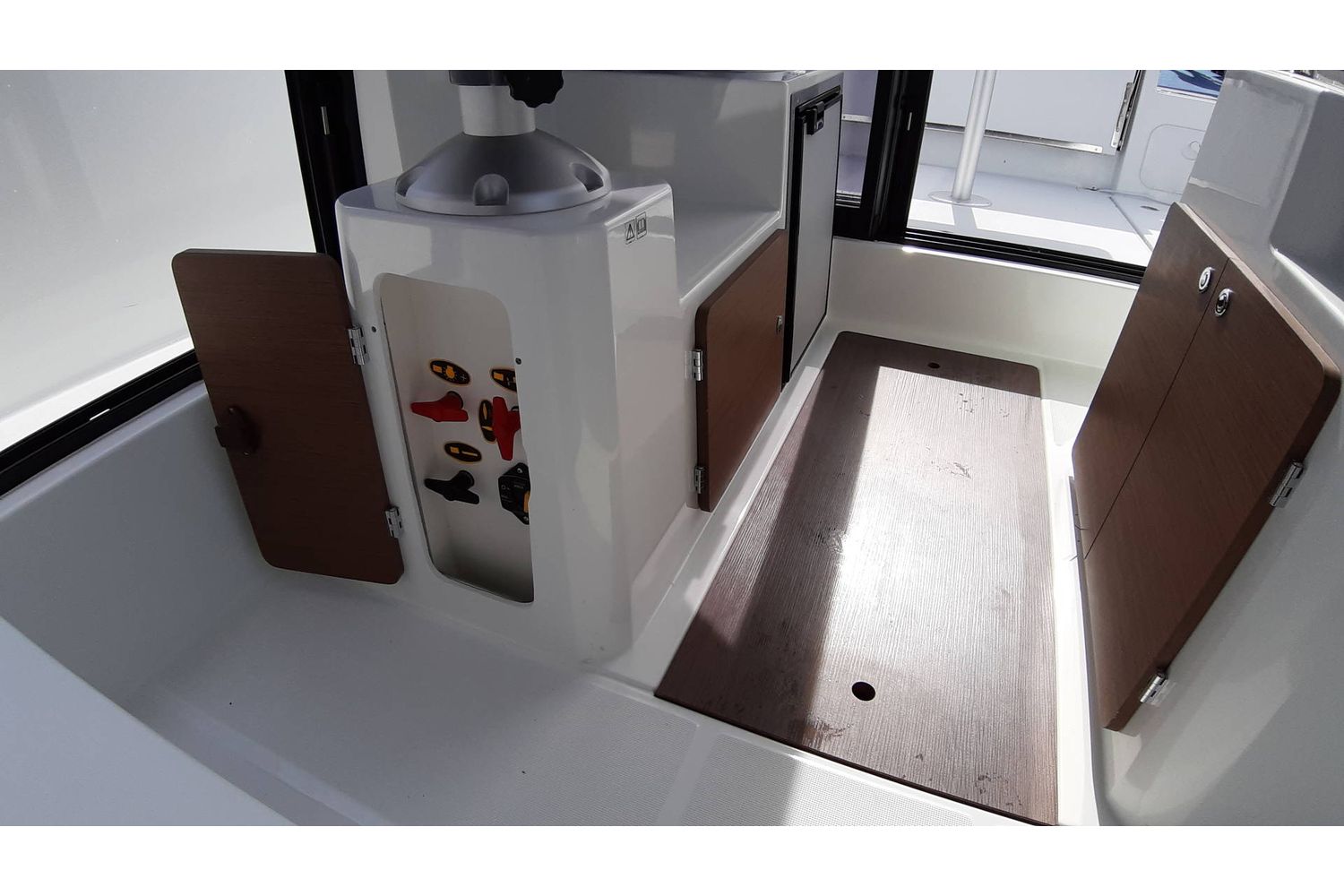 Machinery: Honda BF200 XDU – Drive By Wire outboard engine. Hydraulic steering. Bow thruster. Pressurised fresh water system, water tank, cockpit shower, tap in galley, tap in toilet compartment. Volcano engine lock. Manual and electric bilge pumps. Fuel capacity: 280L (with outside fill). Water capacity: 100L.