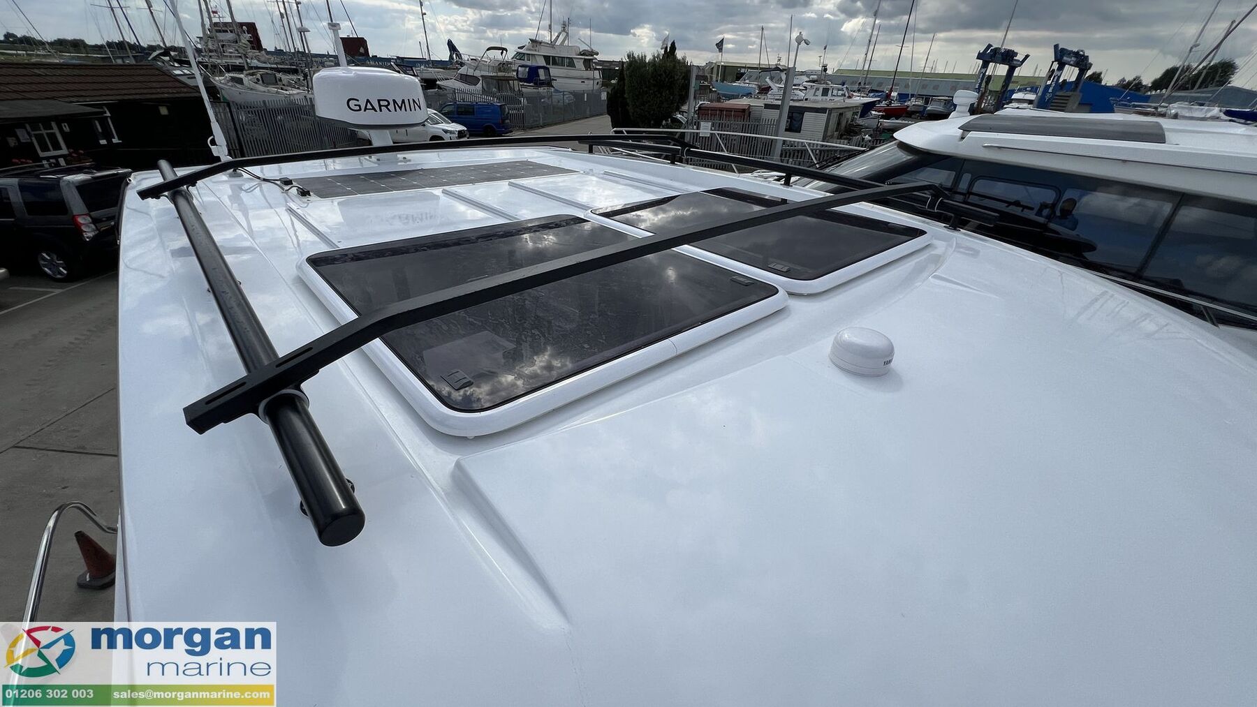 Electronics: Upgraded Garmin Electronic Pack: Garmin GPSmap 1223xsv, GT15M-IH transducer, display of engine information on Garmin screen. Garmin VHF 215i AIS. Garmin GMR 18HD3 radar installation including Scanstrut tower and lightbar. Fusion Audio Pack: Fusion RA210 + bluetooth + USB and 4x loudspeakers. LED lights in cockpit floor, saloon and cabins. Shore power + battery charger. 220v water heater. Navigation lights. 100W Smart solar panel charger system - fully integrated to boat battery
