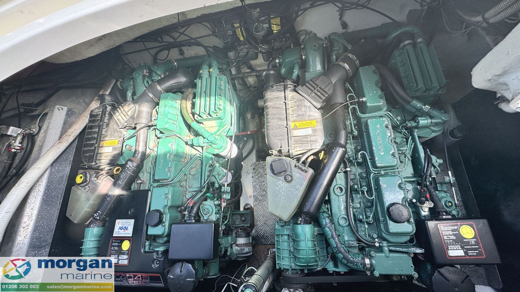 Machinery: Twin Volvo Penta KAD 43P 230hp outdrives diesel engines. Manual and electric bilge pumps. Webasto diesel heating. Fuel capacity - 700 litres 2x tanks. Water capacity - 300 litres.