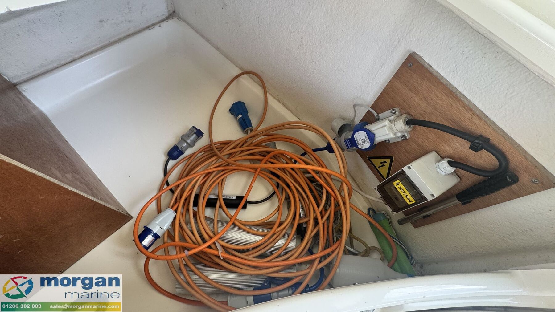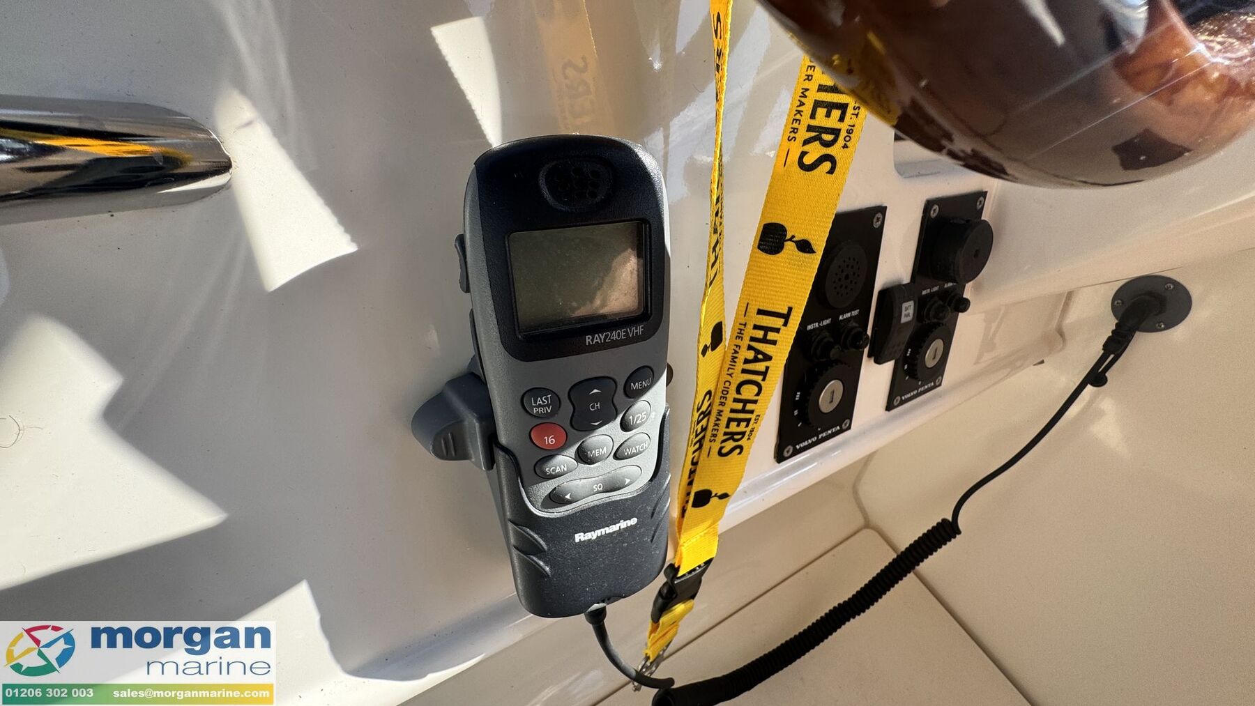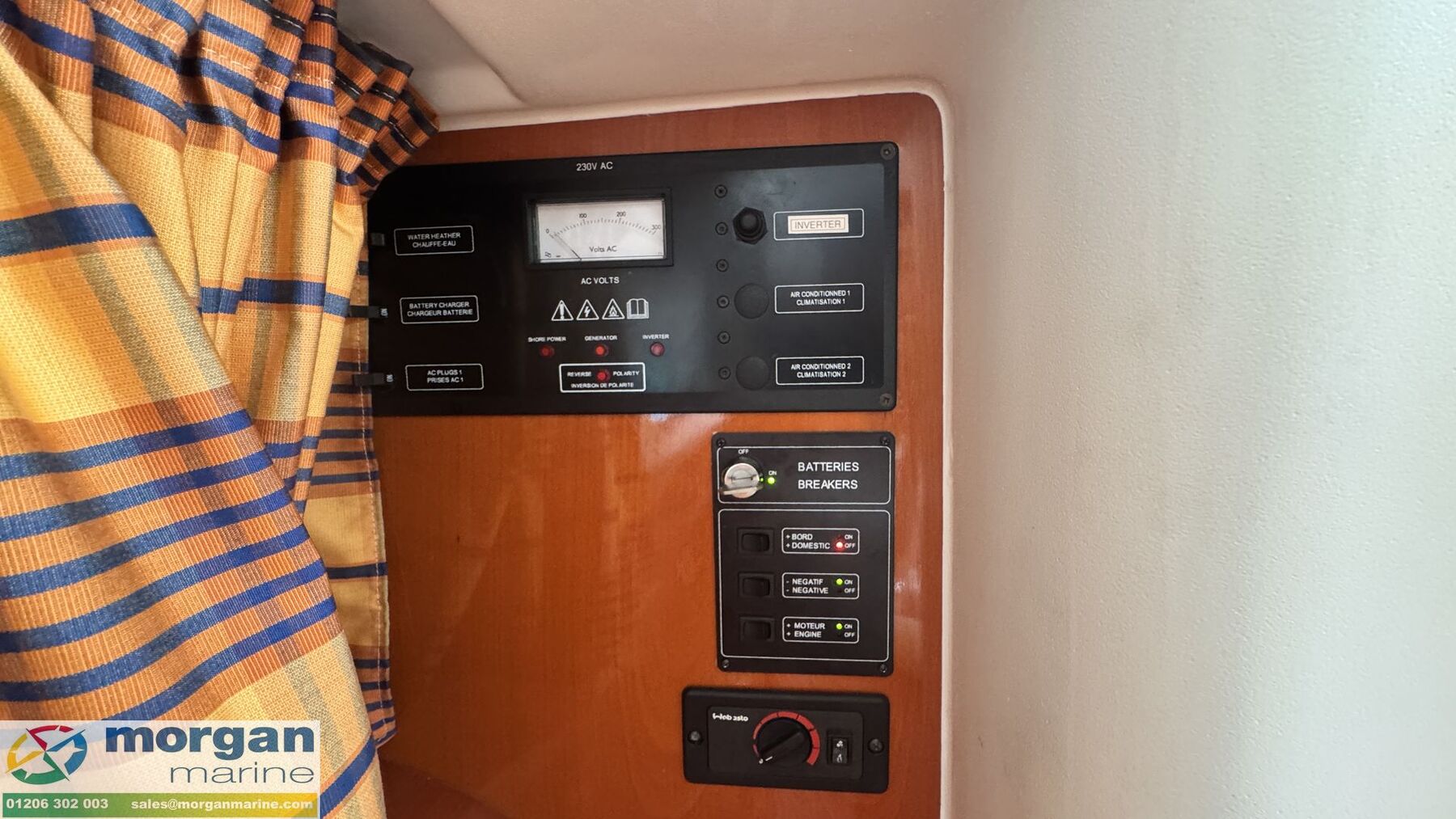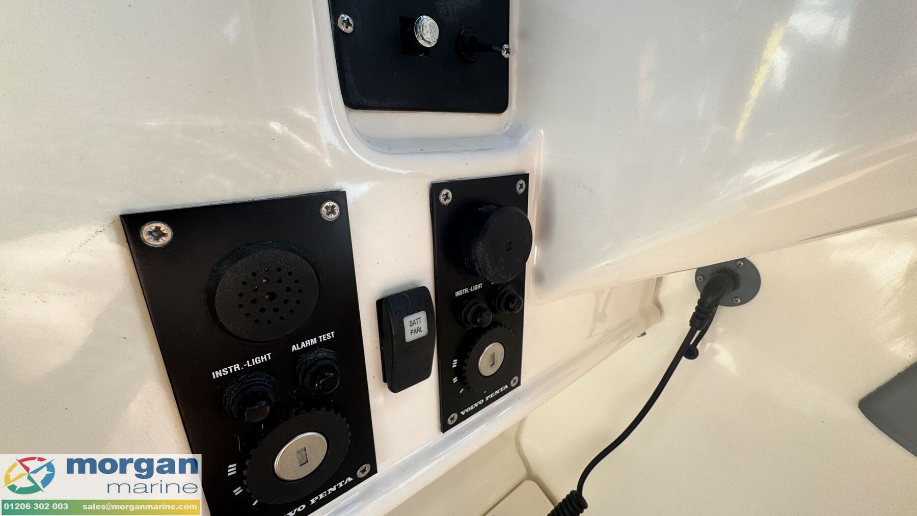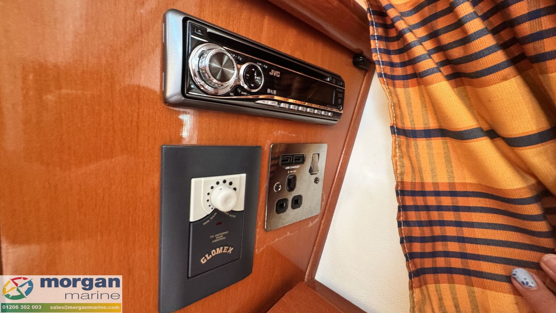 Electronics: Raymarine chart plotter. Raymarine radar. Raymarine ST60 depth display. Raymarine Ray240E VHF radio. Raymarine ST6001 autopilot. JVC sound system with speakers. Alternator charging to 4x 12 batteries. Shore power. Battery charger and inverter. Galvanic isolator (2024). Navigation lights. Anchor light. LED interior lights. Horn. Searchlight. Engine gauges including ( RPM, temperature, oil level, voltage, fuel tank - all 2x). Glomex TV antenna. UK plug sockets. Compass.