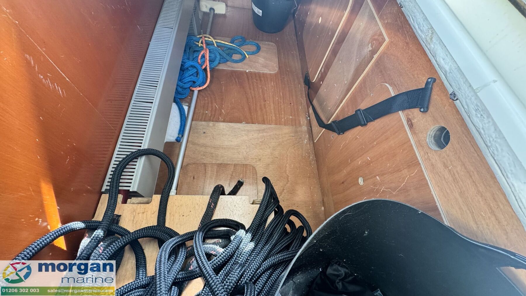Cabin: Main forward cabin with double berth, storage, mirror and deck hatch. Standing head room - 1.90m. Aft cabin with large double berth and storage. Standing head room 1.83m. Toilet compartment with electric flush marine toilet (head renewed in 2023), stainless steel basin with hot and cold water, shower, mirror and storage. Standing head room 1.83m. Saloon L-shaped leather cushioned seating to starboard side with table, TV with remote plus TV aerial, shelves and cupboards. Standing head room in saloon 1.90m. Galley to port side with 3x burner stove with cover, microwave, sink, fridge, synthetic resin counter top and lots of storage. Removable saloon carpet. Interior curtains. Fire extinguisher (2023). Auto fire extinguishers (2023). Smoke detector.