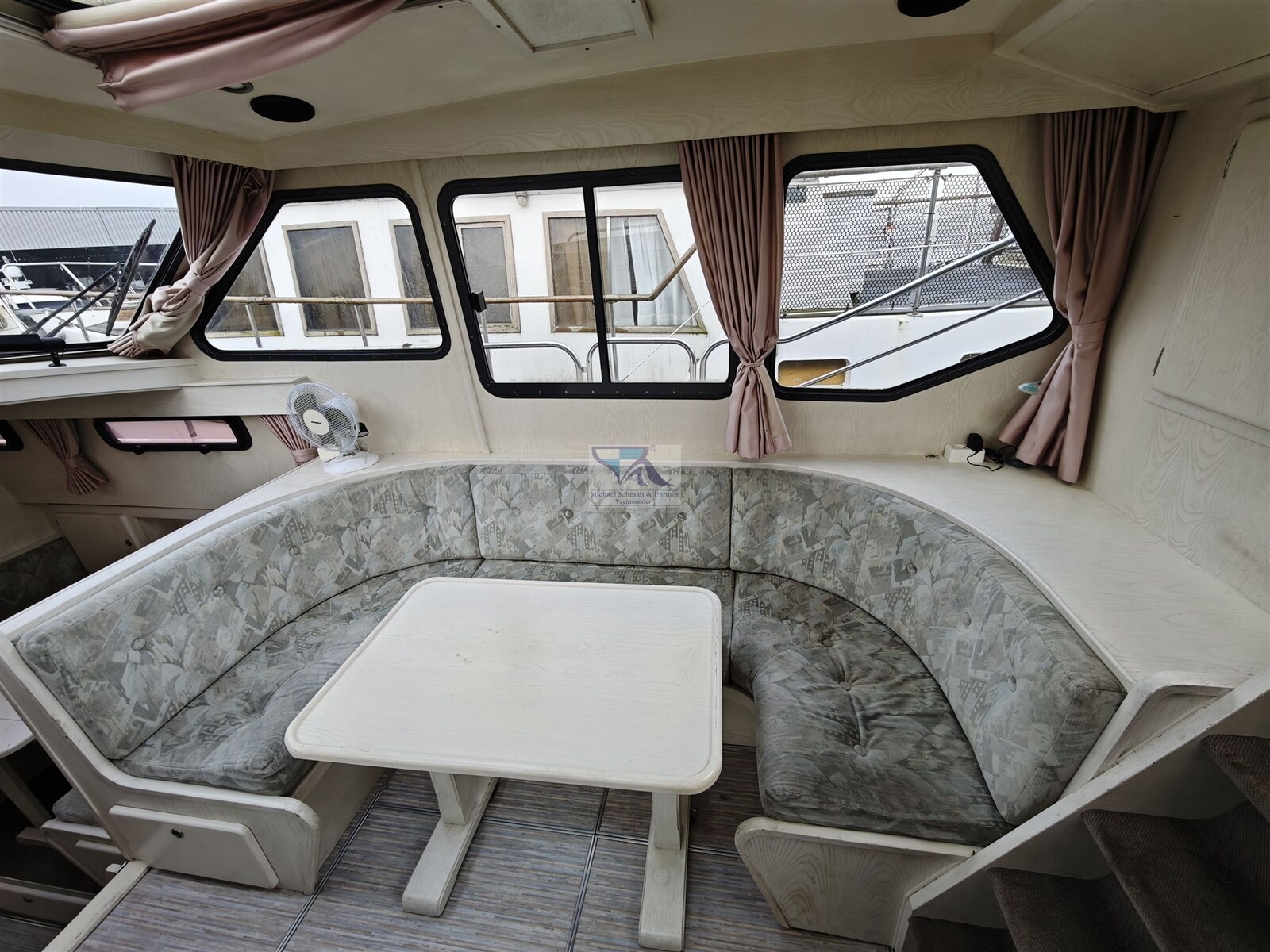 Het heeft een stalen constructie met teakhouten dek, ramen en dekluiken in aluminium frames en een roestvrijstalen reling. Het ruime achterdek met stuurpositie en zitplaatsen nodigt u uit om te blijven hangen.