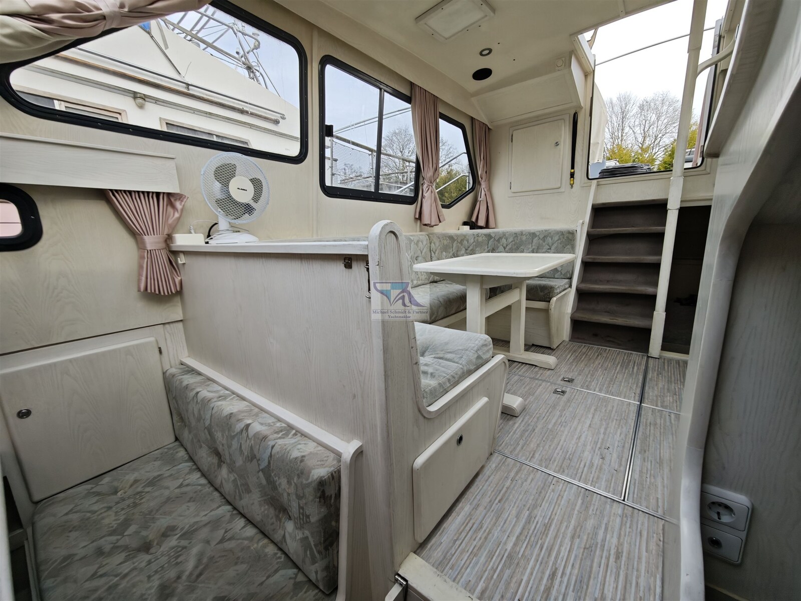 Sie verfügt über eine Stahlkonstruktion mit Teakdeck, Fenster- und Decksluken in Aluminiumrahmen sowie einer Reling aus Nirosta. Das großzügige Achterdeck mit Steuerstand und Sitzmöglichkeiten lädt zum Verweilen ein.