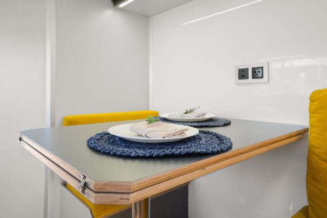 The salon includes a folding table for six, modular seating, 32’’ LED TV, Bluetooth audio system, and reversible air conditioning.