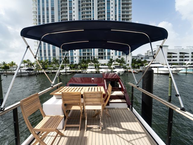 La terrasse extérieure offre un espace repas avec table en teck, douche de pont, accès arrière avec marches en teck et bimini en option.