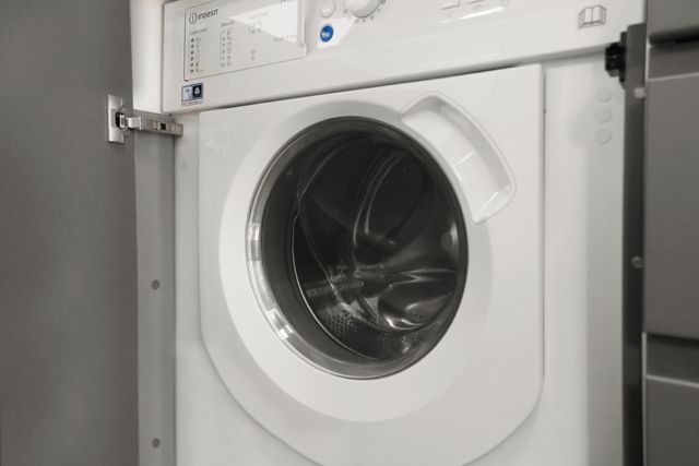La cuisine est équipée d’un plan de travail en bois naturel, réfrigérateur-congélateur, plaque à induction, hotte, micro-ondes et rangements hauts et bas.
