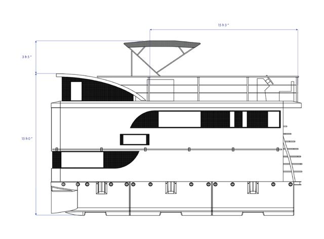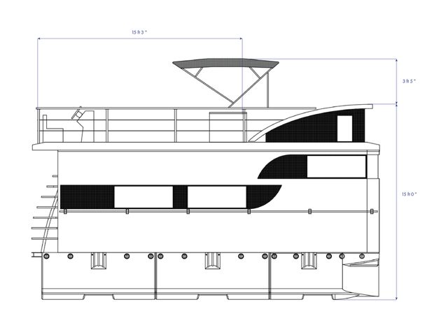 Propulsion is provided by two 15 or 20 HP outboard engines, with mechanical steering from the terrace, and two 40 L fuel tanks.