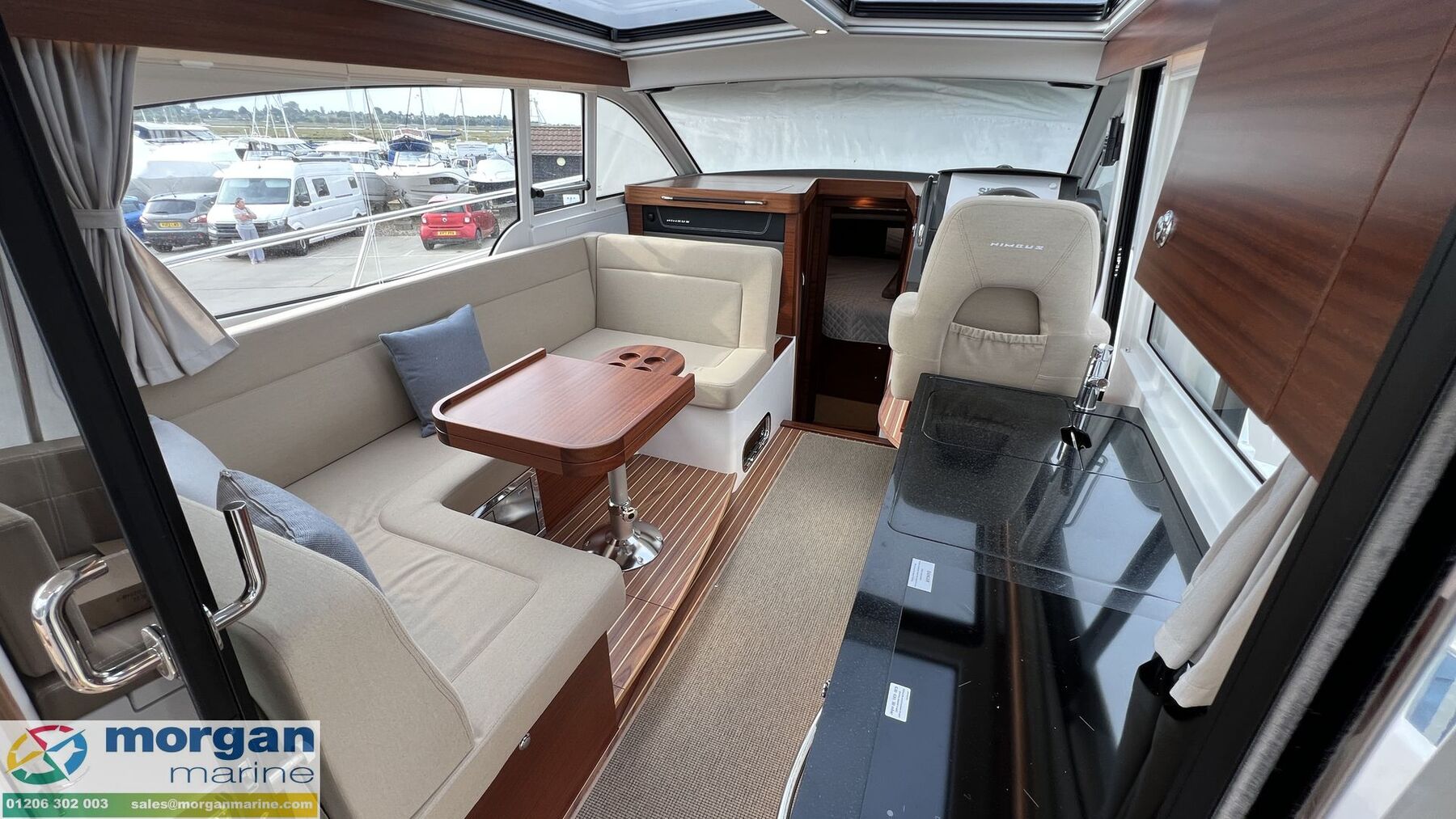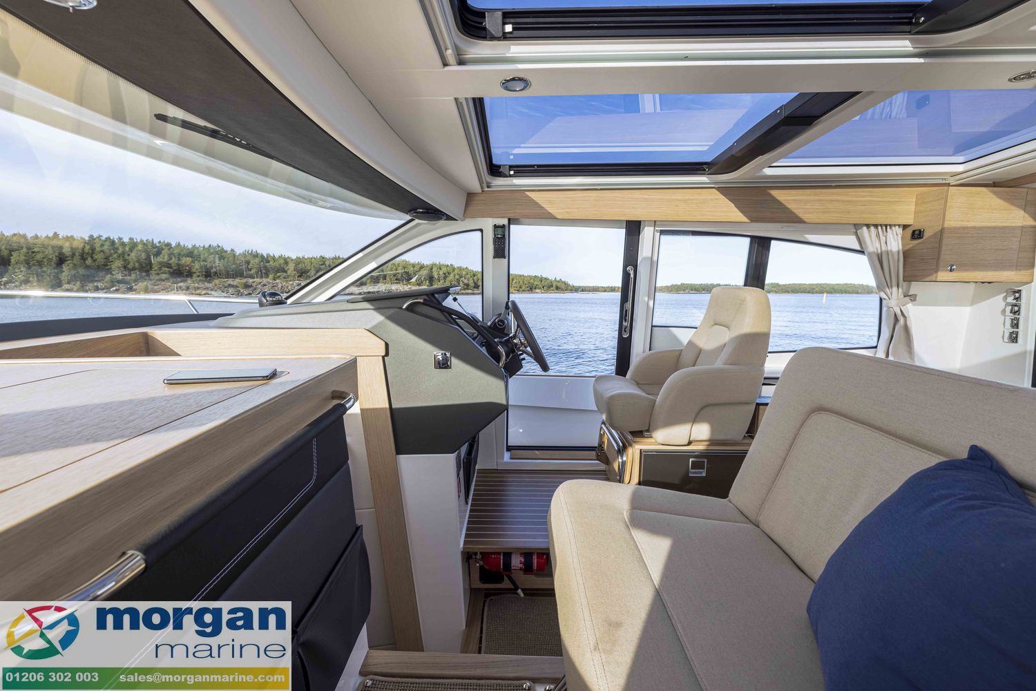 Cockpit: Large wheelhouse with laminated windows, large arched windscreen (with wiper + screen wash + defroster + canopy), aft door with electric window, starboard sliding door and port side opening window. Great visibility from the helm position and saloon + extra large glass roof and two large electric sunroofs (with blinds) for more natural light. Safety glass windows (glued in to minimise noise) + blinds. Reversible passenger sofa - converts to form U-shape seating at saloon table on port side. Matte surfaces are easier to clean and help to minimise reflections. Starboard side galley with gas cooker, sink, fridge and kitchen fan + Nimbus exclusive dinner set (for 6 people). Additional fridge under saloon sofa. Ergonomic helm seat (for sitting or standing) - folds for more space around galley + footrest. Dash with instrument panel, compass, electronics and cup holder. Interior cushions - blue.
