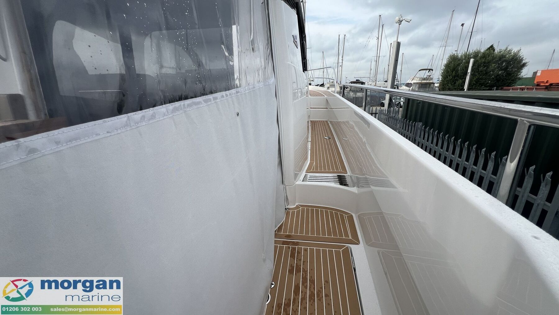 Deck: Shower on transom - hot and cold water. Extended aft roof. Integrated ventilation to improve air circulation and quality. Wide and deep sidedeck on starboard side provides easy movement around the boat with access to helm side door and the pontoon; plus access to the fuel tank. Stainless steel open pulpits. Large integrated sundeck on the foredeck with cushions. Large swim platform with high frame and door for improved safety, folding ladder, fender storage and self draining storage box. Aft deck (on the same level as the swim platform and saloon) with L-shape sofa (providing good depth and back support) plus a table for a great dining experience - plus aft canopy. Set of outdoor cushions - blue. Cleats + midship cleat. Grab rails. Foldable stainless steel mast (for antenna / lights etc) on wheelhouse roof. Self draining deck. Windlass at bow. Teak deck / black caulking. Mooring package with anchor + fenders + mooring lines.