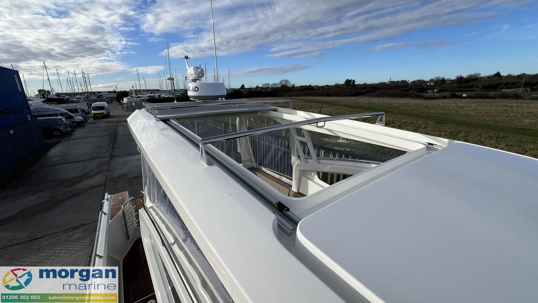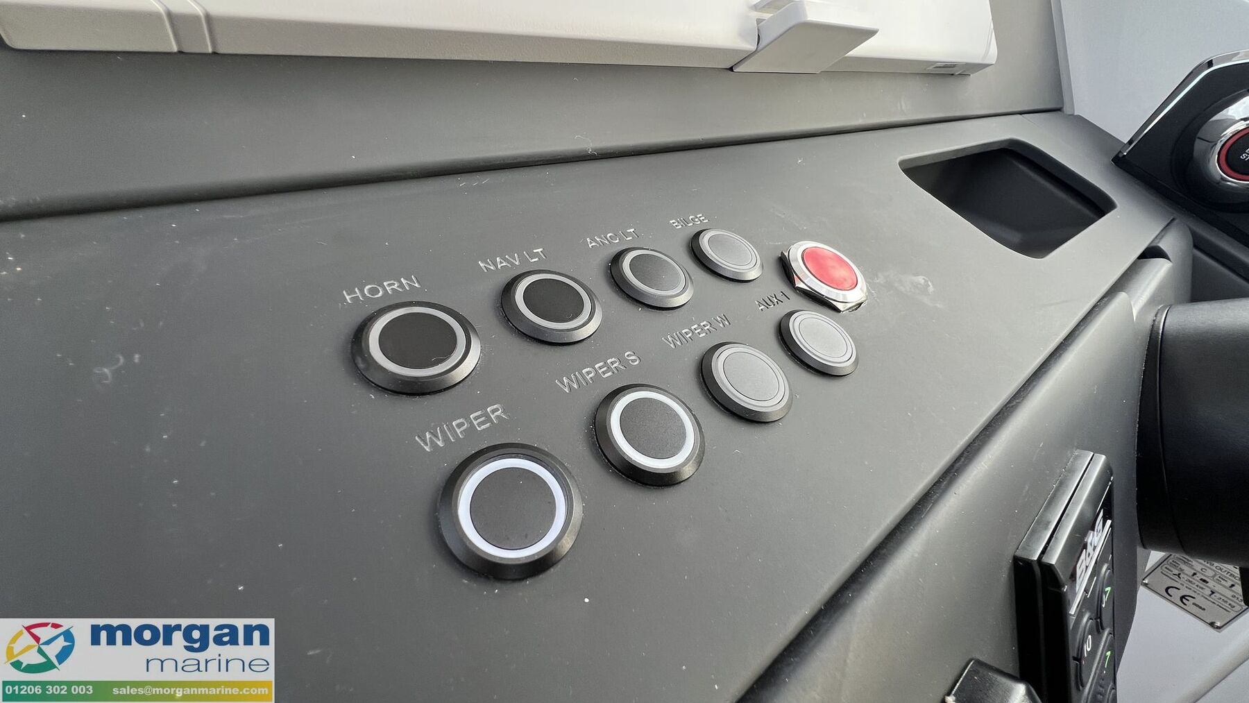 Electronics: Electrical canvas roof system including enclosed canopy on aft cockpit. 2x blue underwater lights. Remote control for bow thruster and stern windlass. Isotherm 15l hot water system 230v. Chargemaster shore power 12/25a, 25m cable, 2x 230v outlets. Wireless charging nest for phone. Hifi Package - Clarion CMM30 stereo, 2x CMS651 speakers in cockpit. Simrad NSS EVO 3S 16" plotter. Simrad xSonic SS60 sonar - thru-hull transducer. Simrad autopilot + OP12 controller. Simrad HALO20+ radar. Simrad RS40 VHF + AIS receiver and antenna. Search light on T-top. Nimbus Connect boat monitoring.