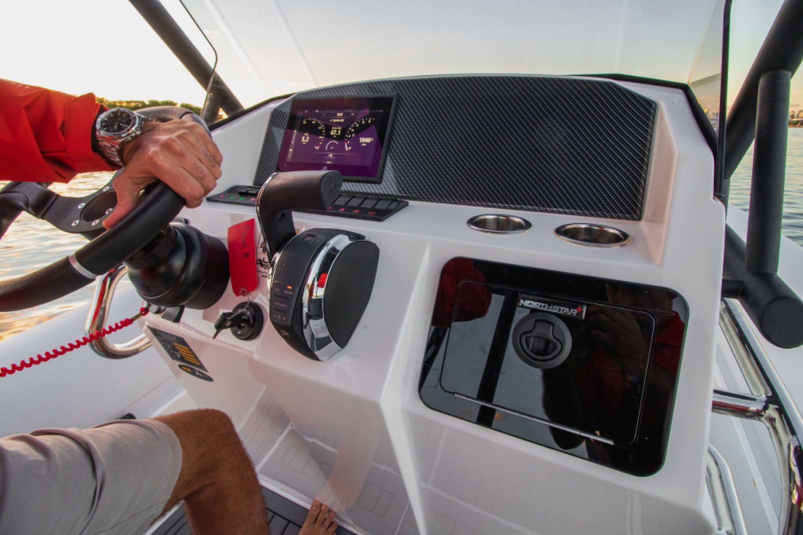Loaded with impressive standard features, the Orion 8 includes Silvertex marine upholstery, large storage compartments, acrylic glove box with USB charging socket , twin flip-up seats, Hypalon tubes, hydraulic steering system, electrical plant with navigation lights and basic lighting, foldable table and 36L Igloo cooler, automatic bilge pumps, tempered glass windshield, swim platform, stainless steel swim ladder, telescopic cleats and stainless steel console and aft seat grab handles,