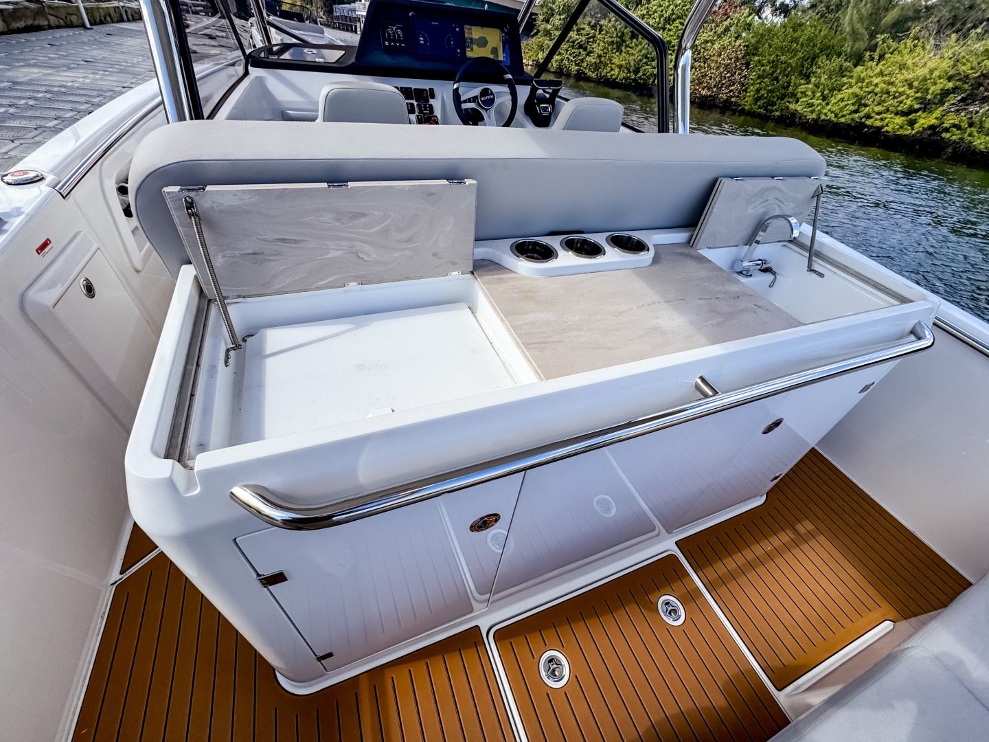 - Large aft platform and generous storage space in lockers under the bar and seating.