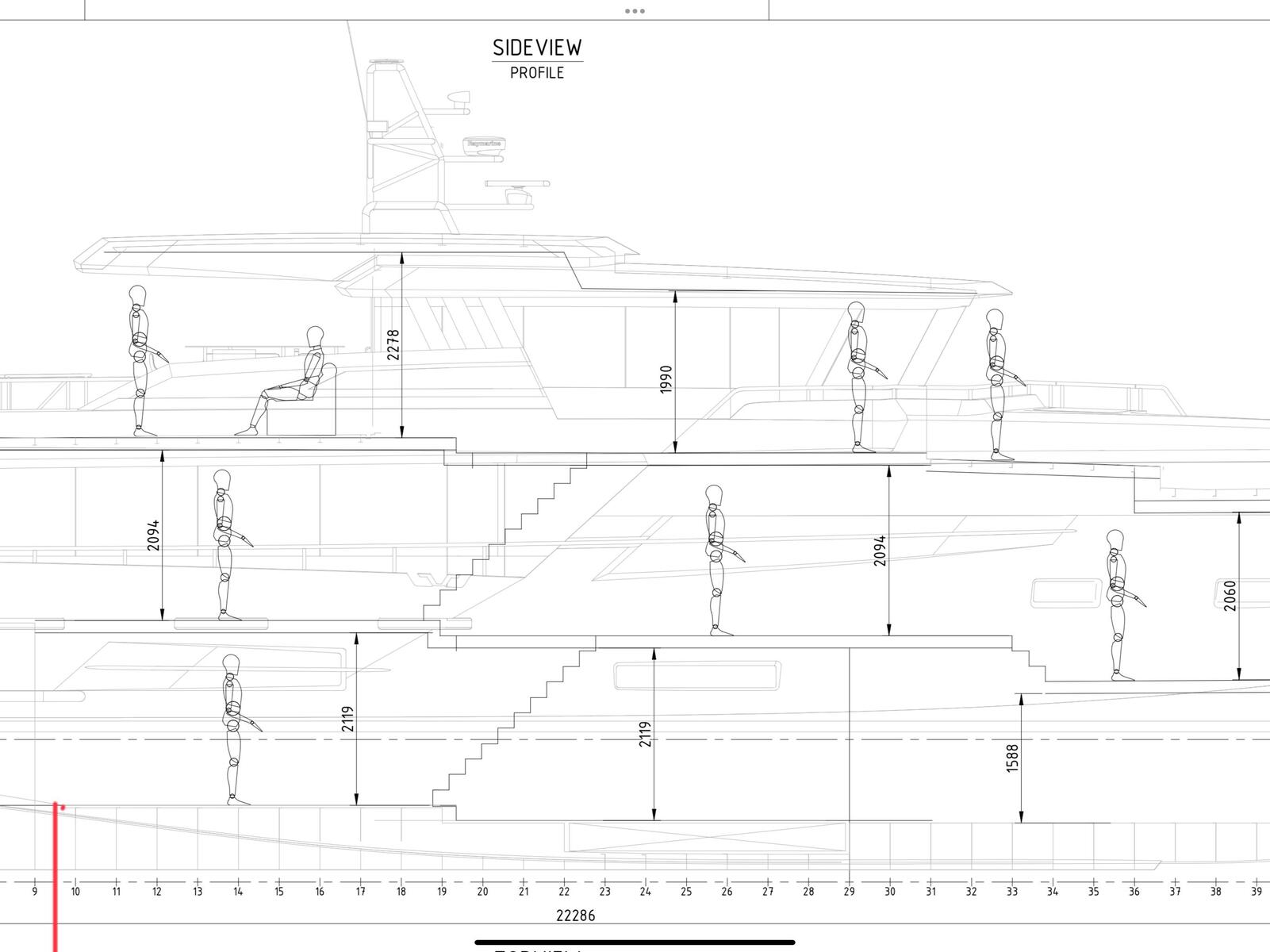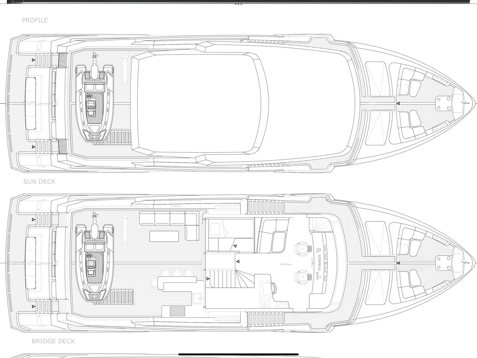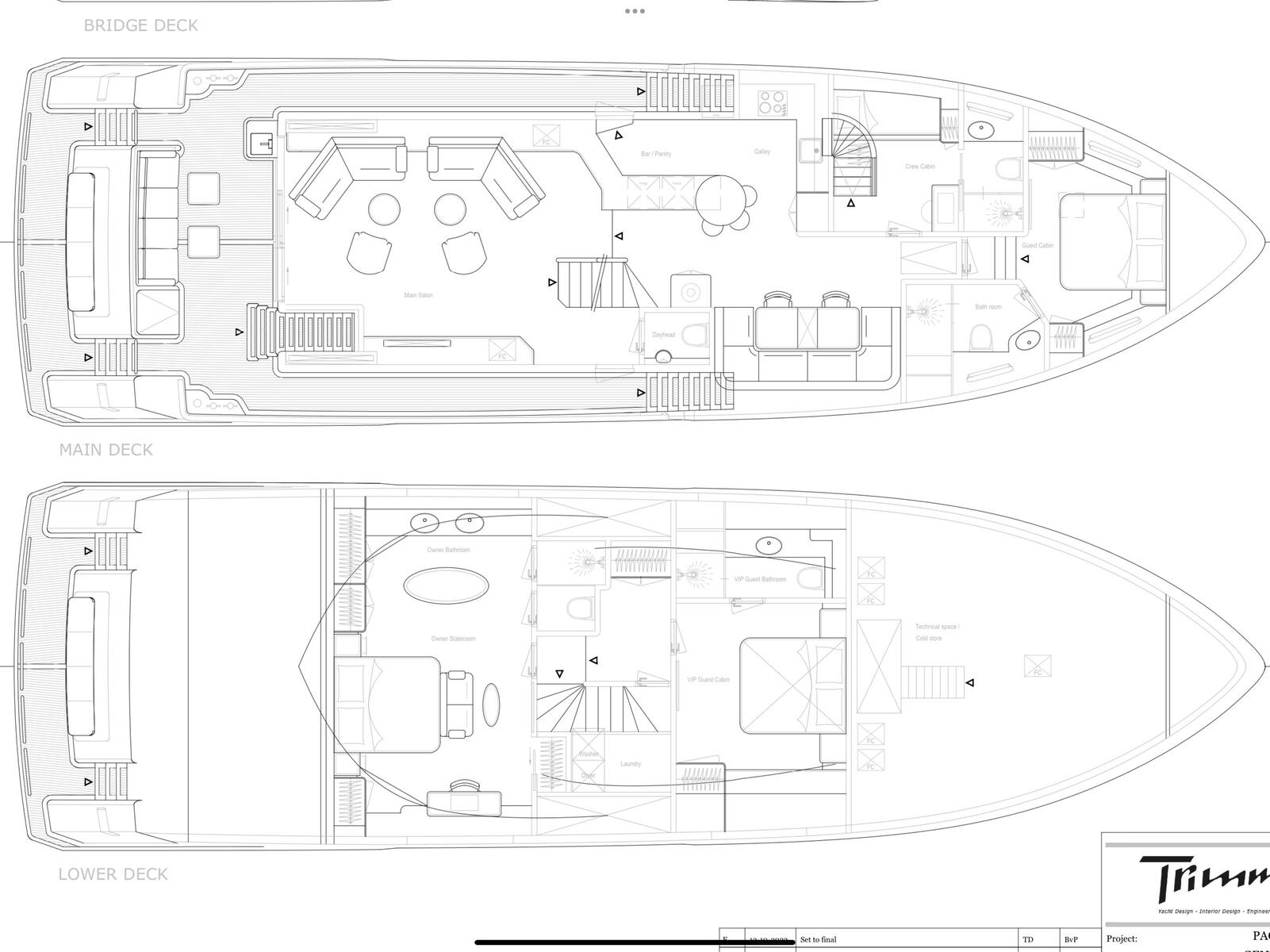 At the bow, the lowest level features a technical room, home to the yacht’s sophisticated installations. The stern opens hydraulically, revealing a spacious garage that leads to the sophisticated engine room, outfitted for long-range cruising and powered by twin John Deere engines, ensuring performance and reliability.