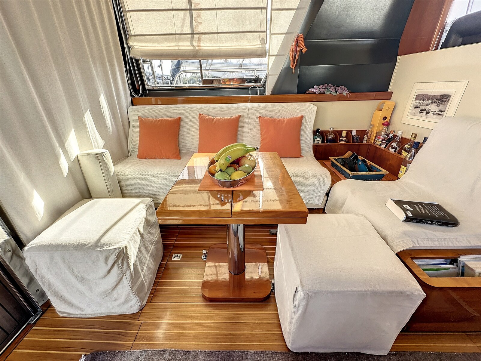 Engine Alarm, Anchor (DELTA 32 kg), Water pressure pump, Teak Side Decks, Deck Shower, Directional Spotlight, Hydraulic Flaps, Tender Crane, Fire Extinguishing System (2025), Outboard engine for tender (TOHATSU 15 HP 2025), Fenders, Gangway (HYDRAULIC GANDOLA 2016), Platform (2010), Automatic Bilge Pump, Manual Bilge Pump, Teak Cockpit, Shorepower connector, Voltage Rectifier, Electric Windlass (LEWMAR Falcon 1.700 W), swimming ladder, cockpit table, Tender (ZODIAC YL 275 2025), Horn.